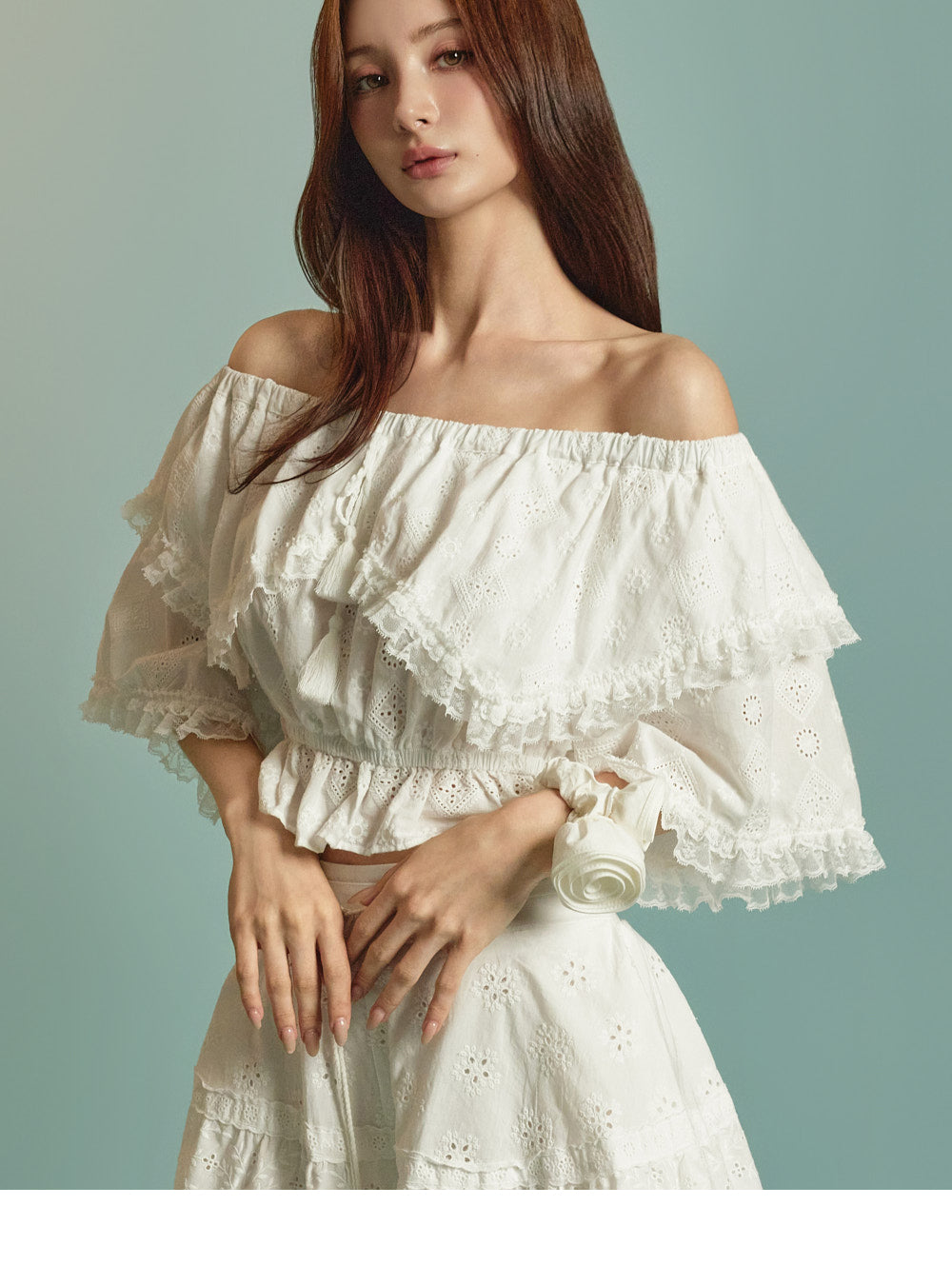 This blouse exudes a feminine and romantic charm.