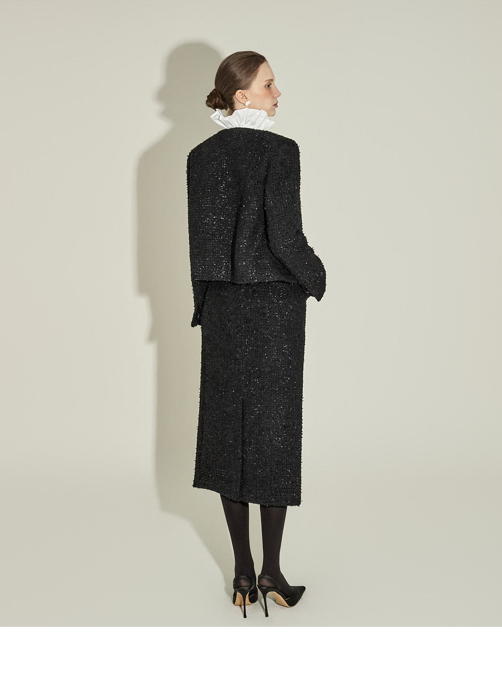 The front button closure and shoulder pad detailing create a structured silhouette.