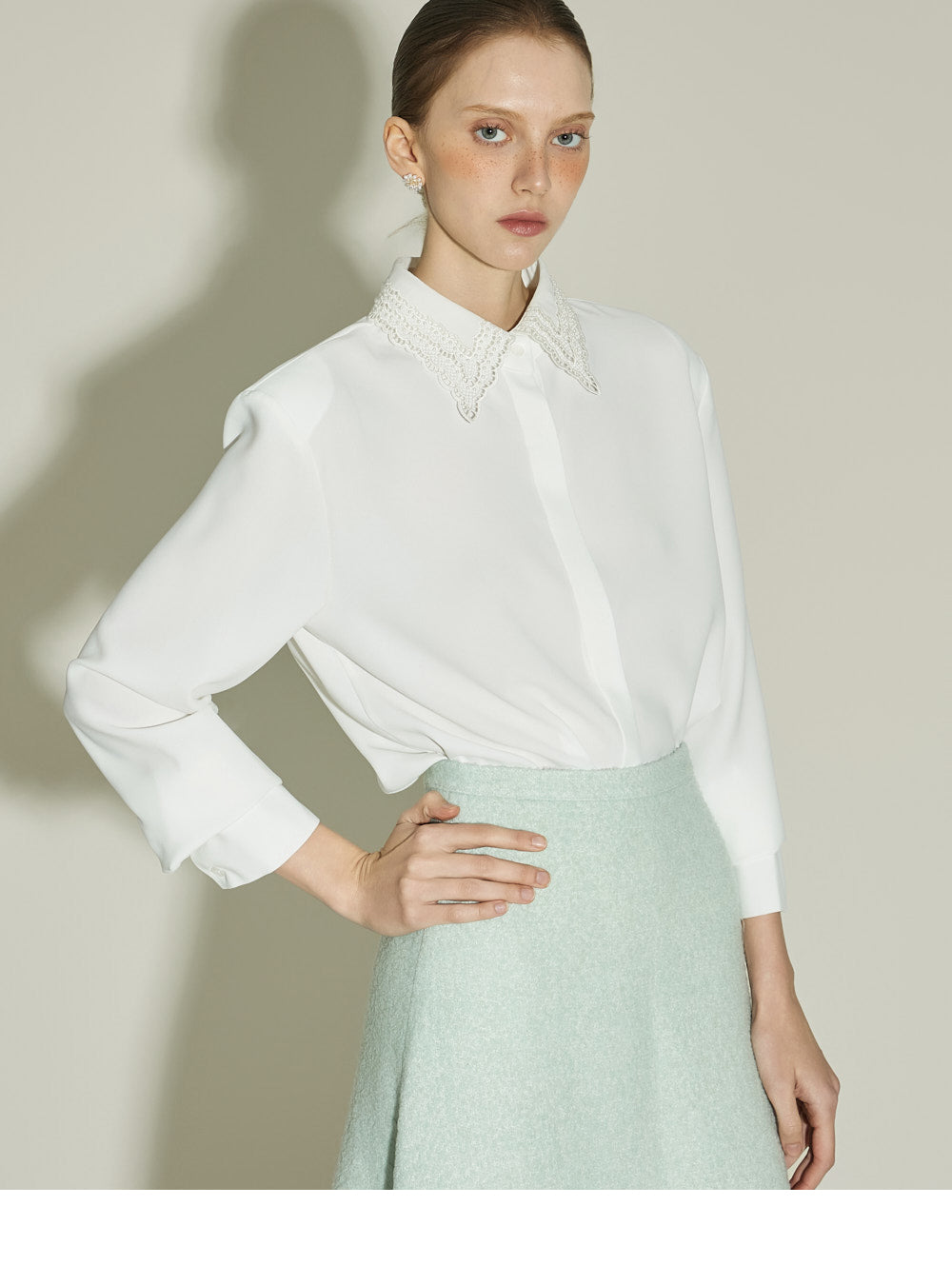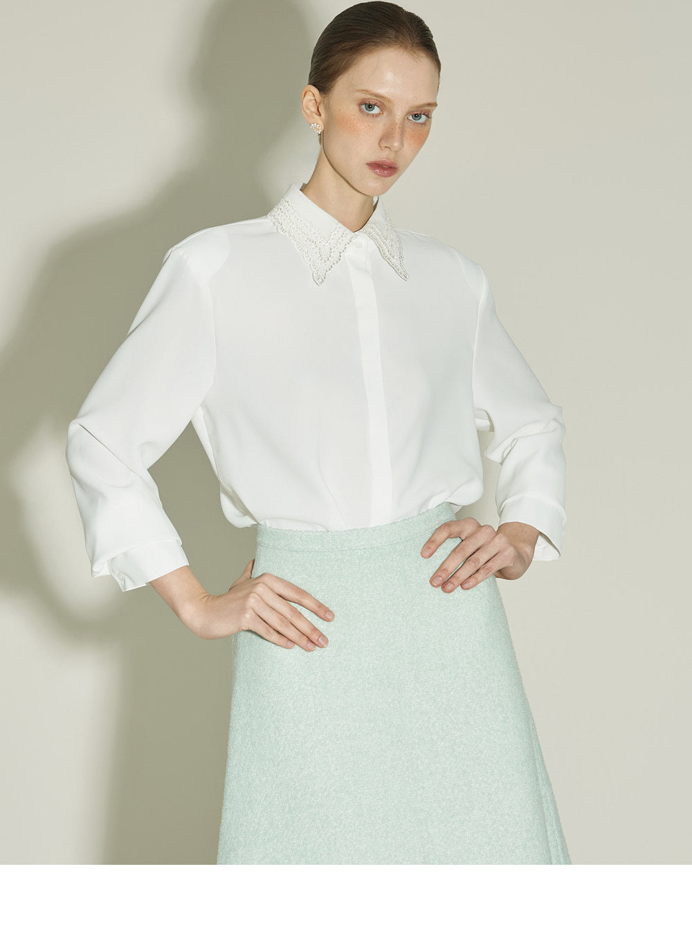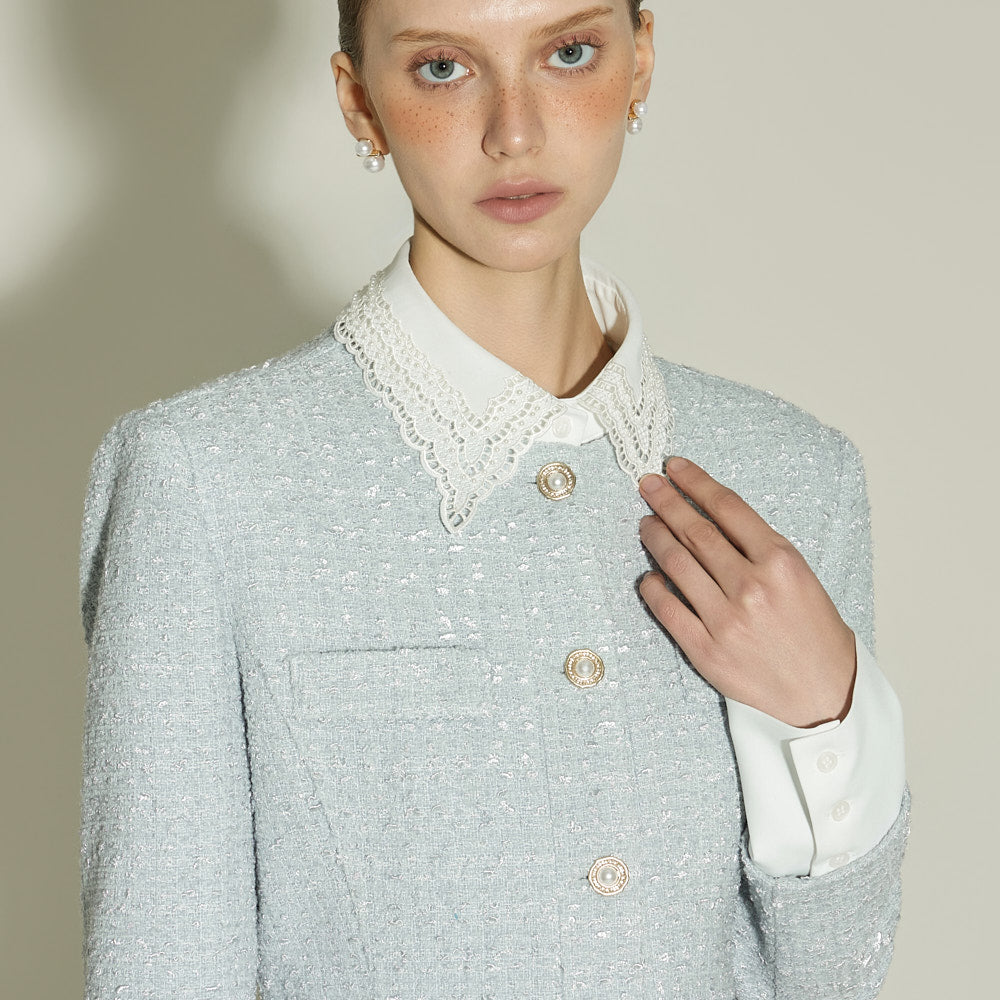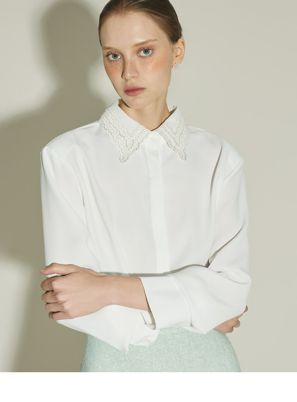 The perforated lace detailing along the collar adds a lovely, romantic touch,