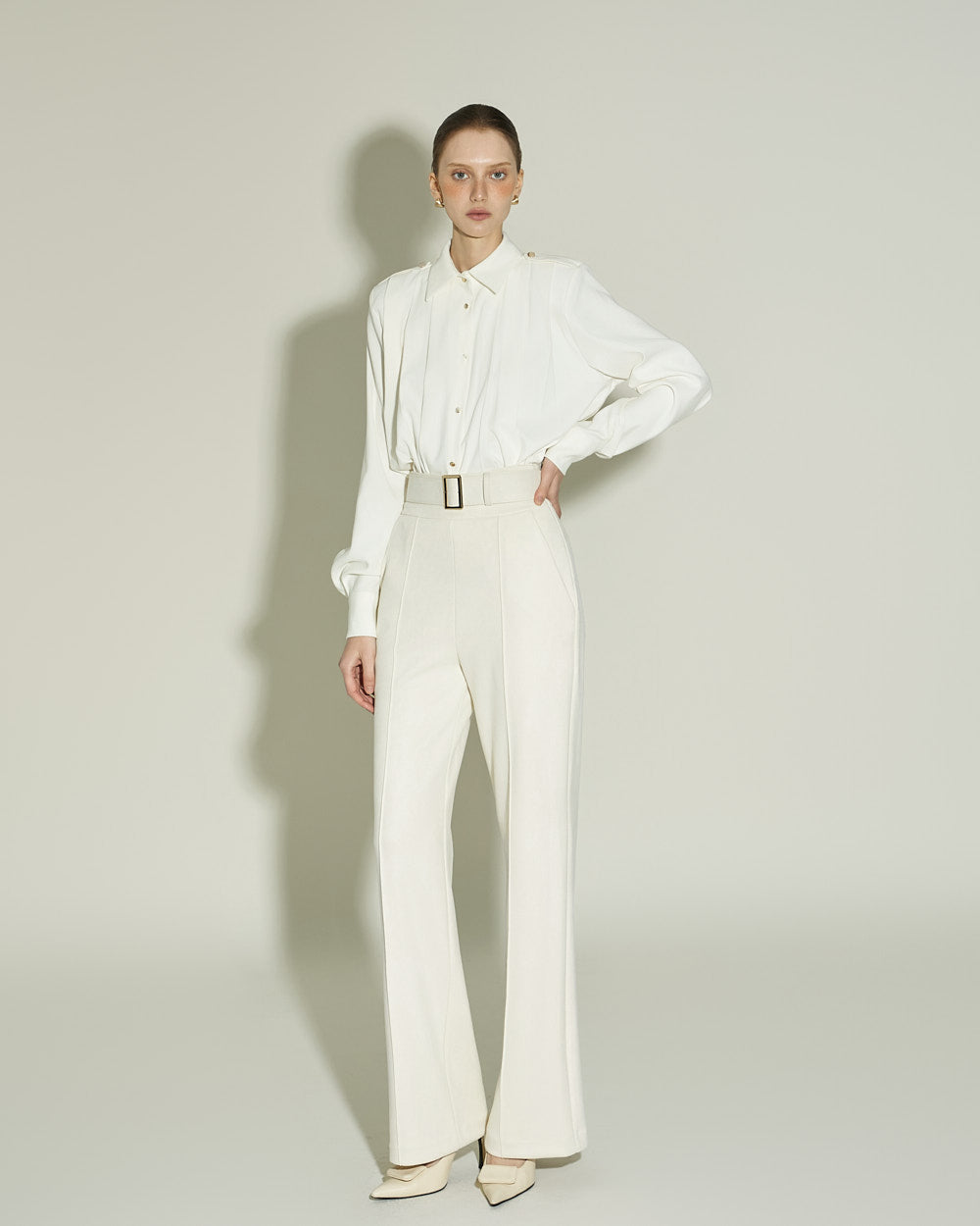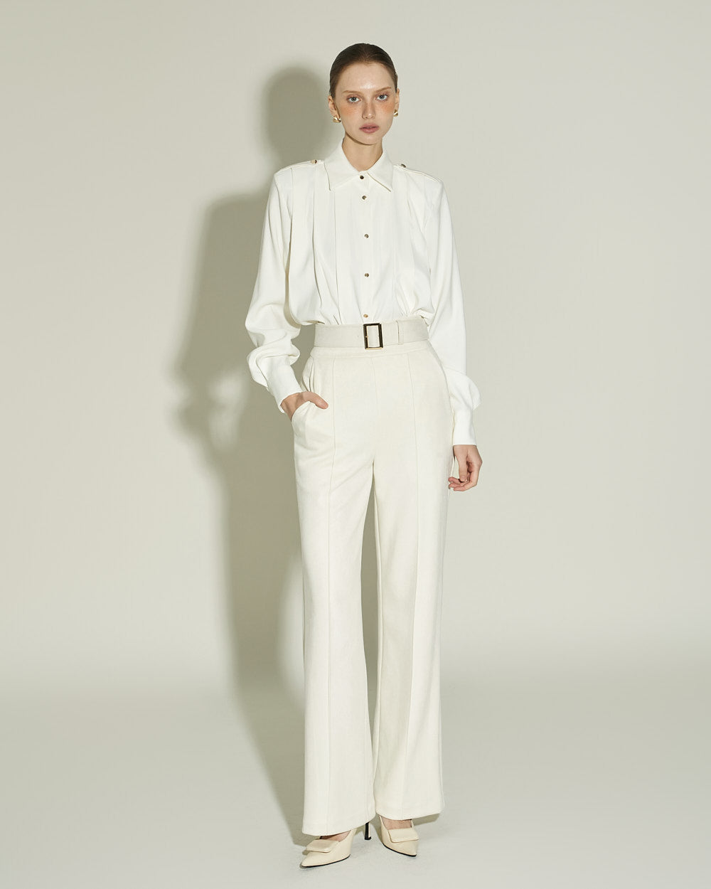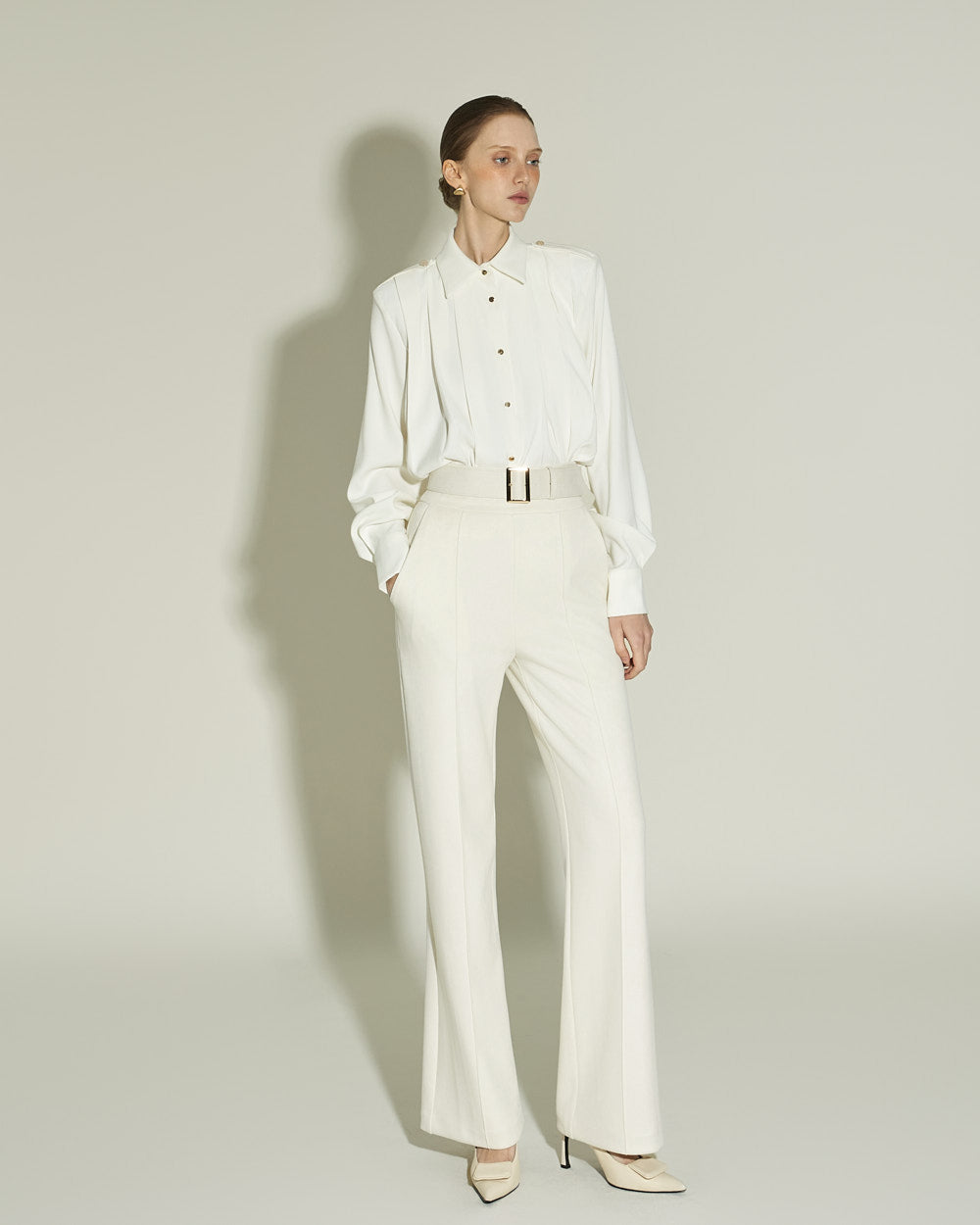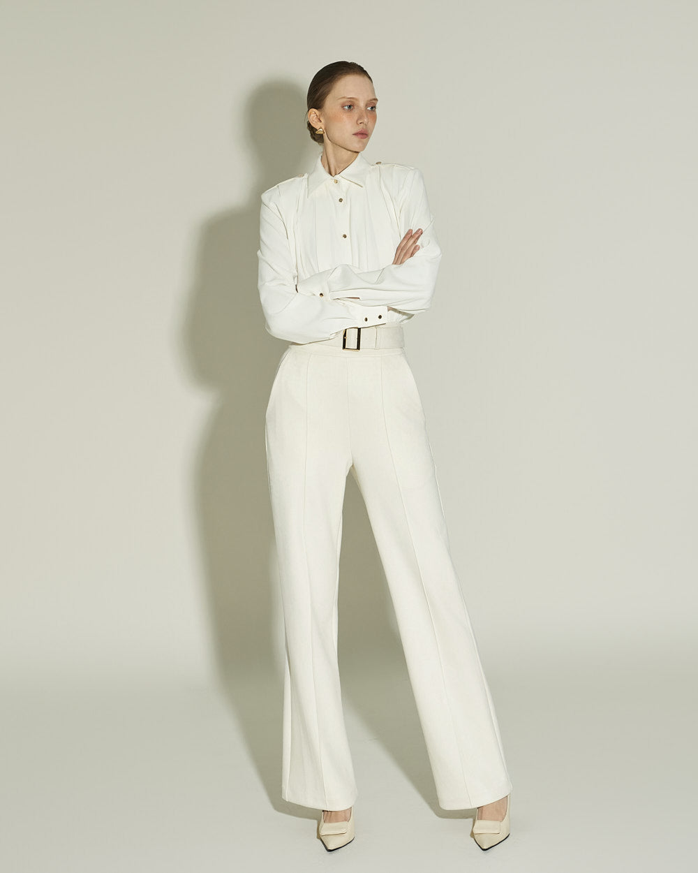 The shoulder epaulettes and moderate padding complete the sophisticated silhouette,