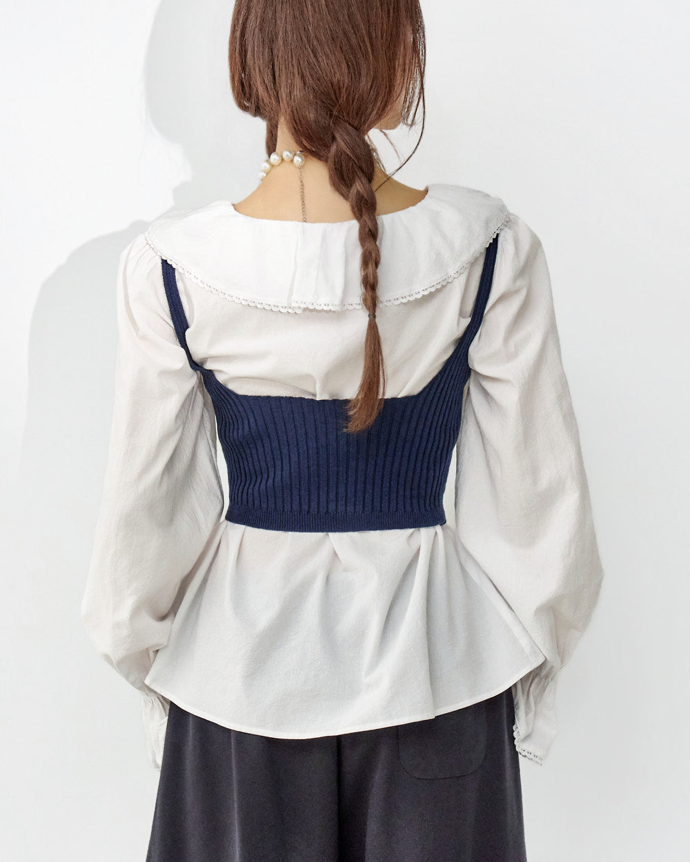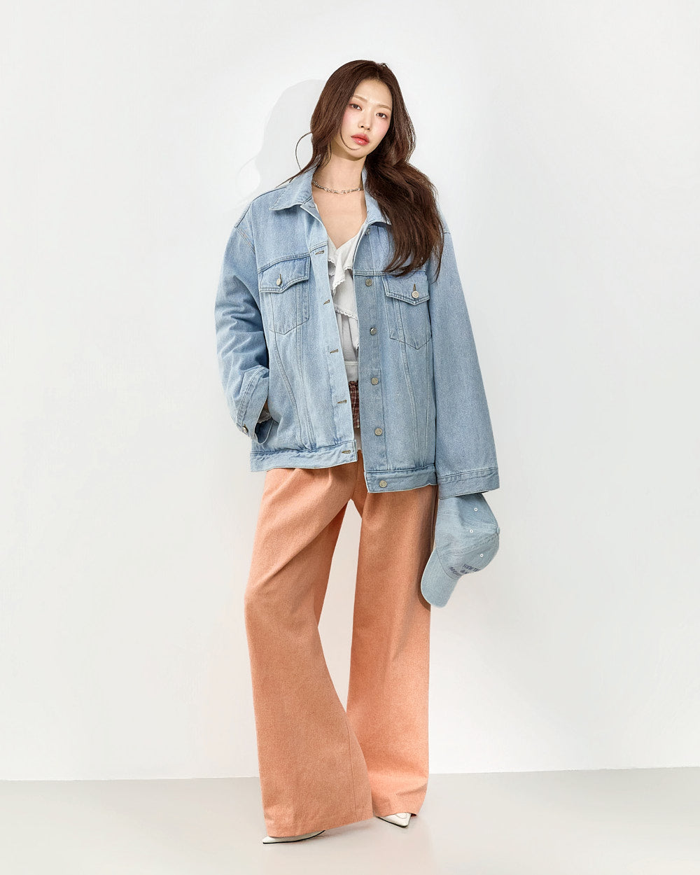 The V-neck design and loose fit create a delicate silhouette,