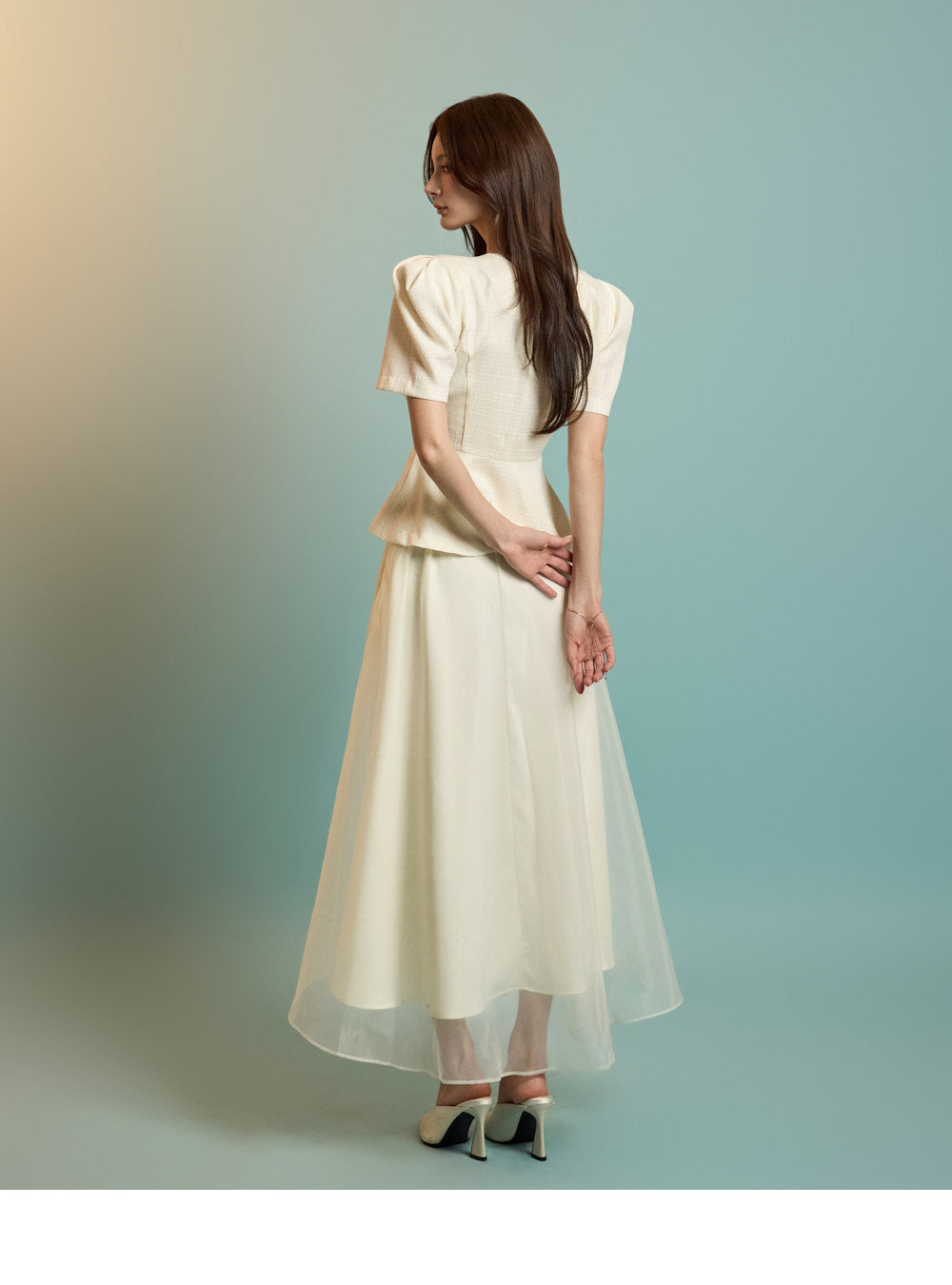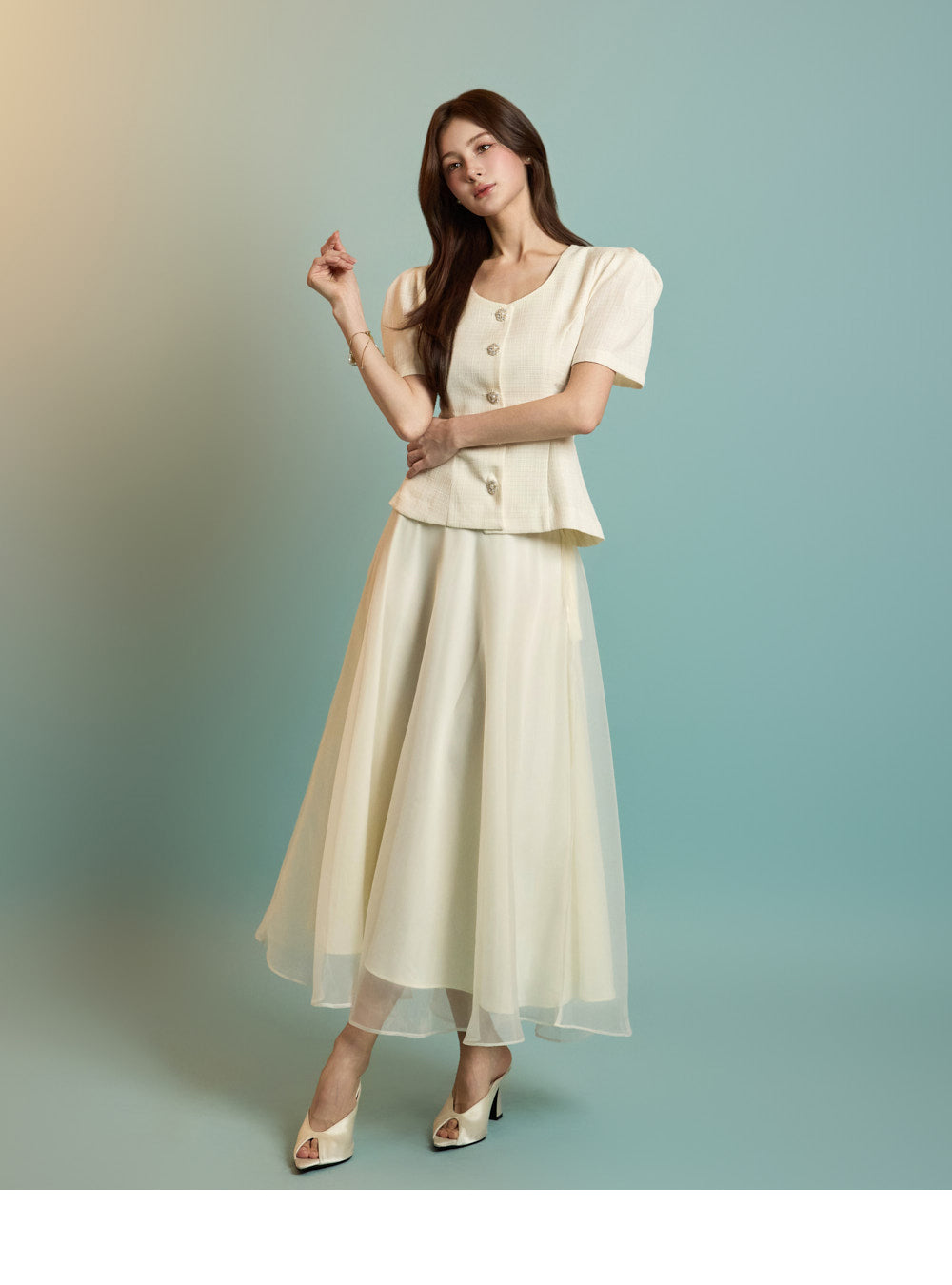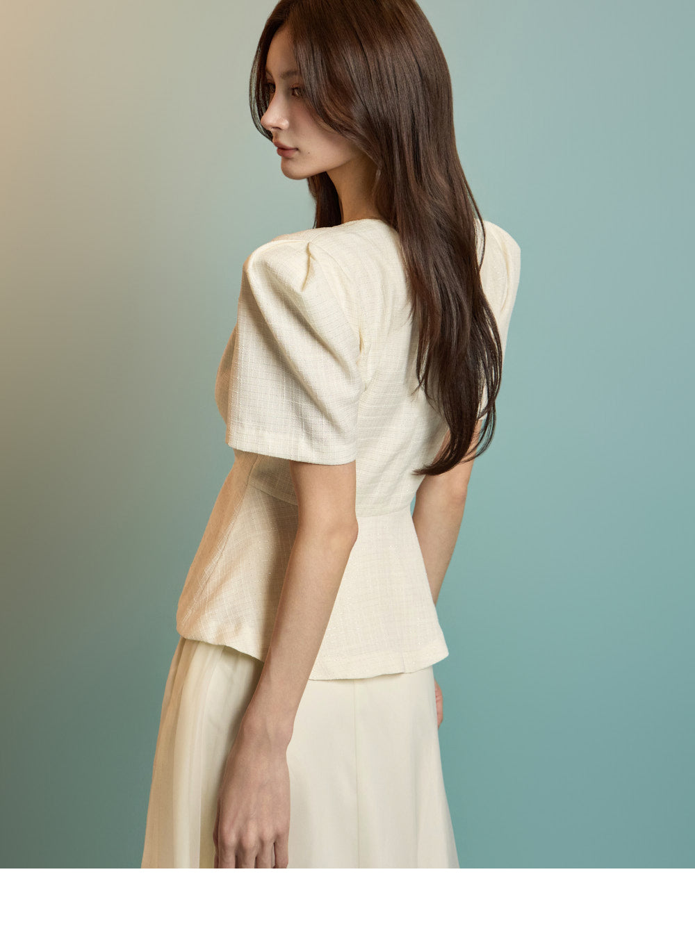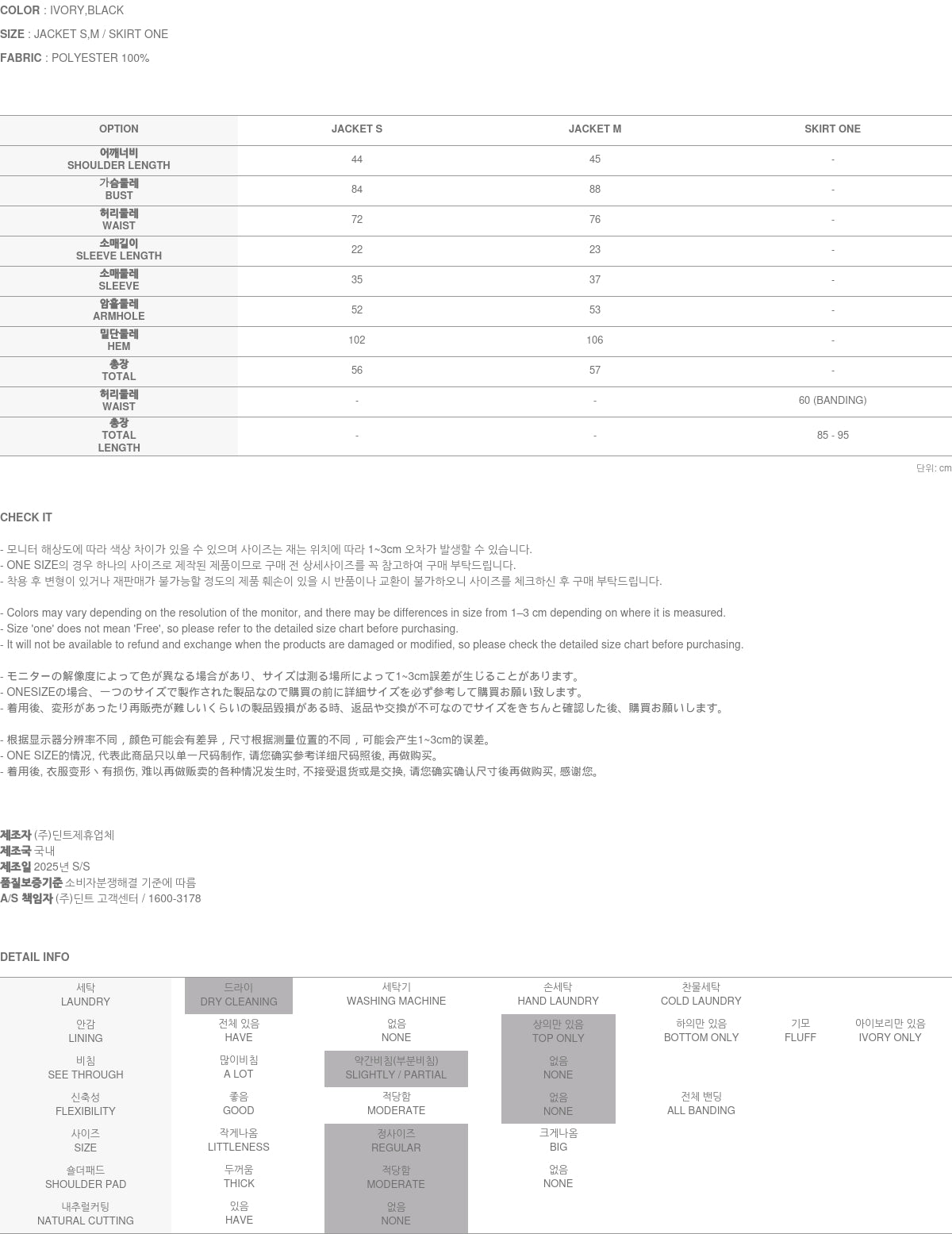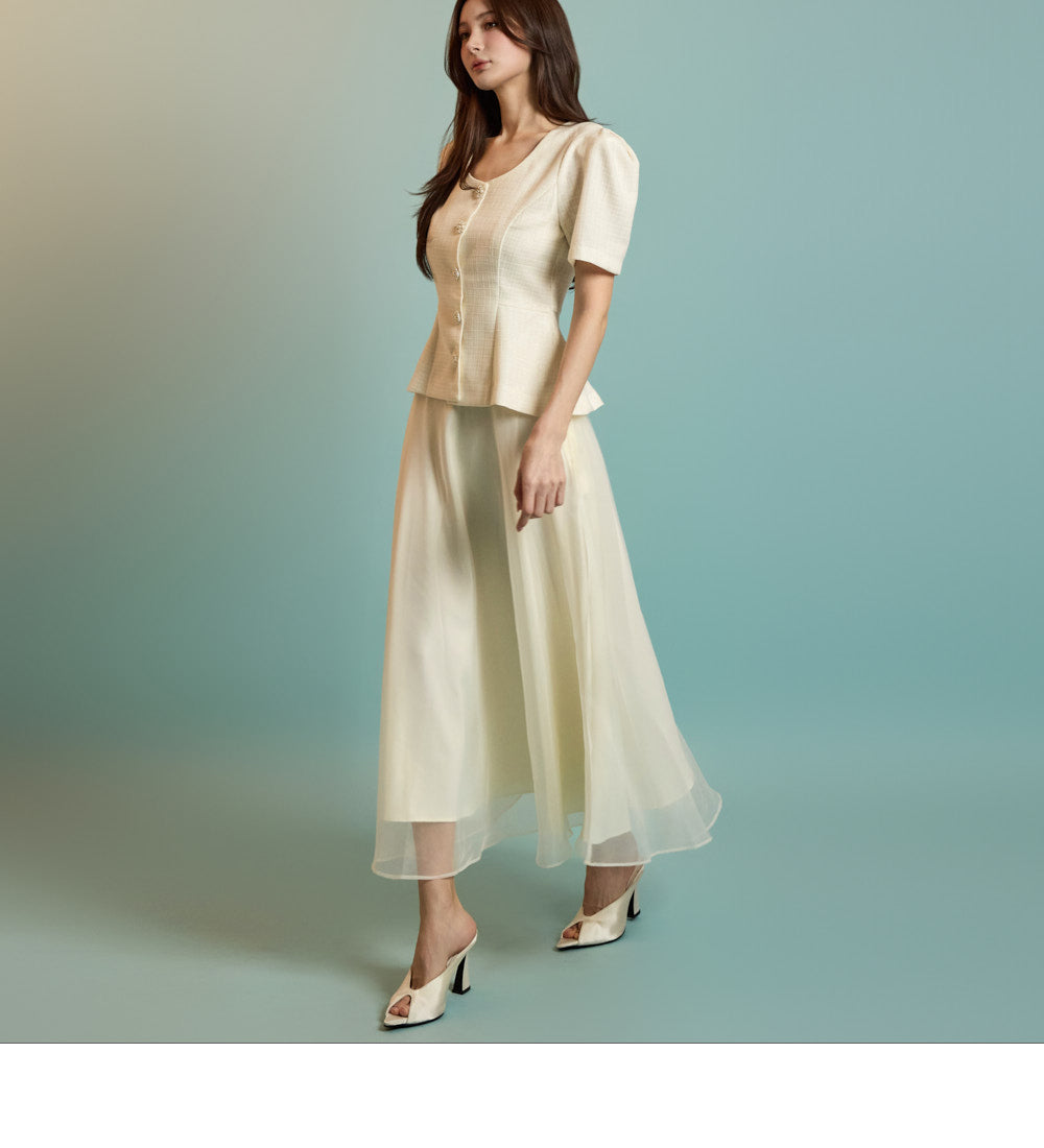 The model is 167 cm tall, wearing a jacket in size S and a skirt in one size, in ivory.