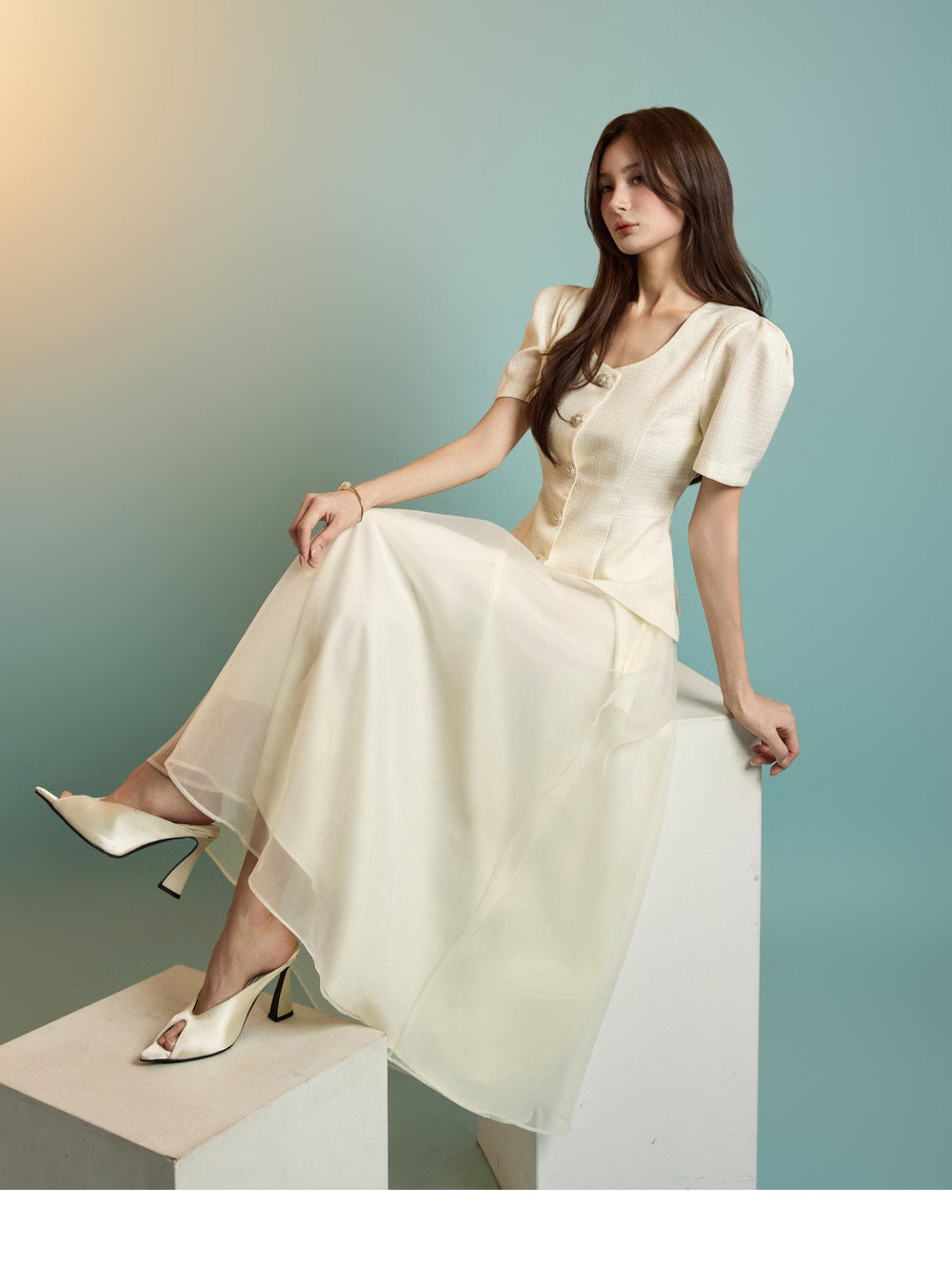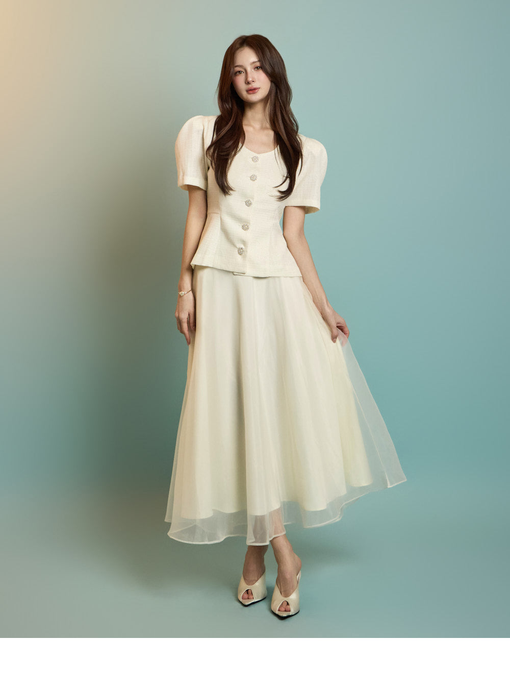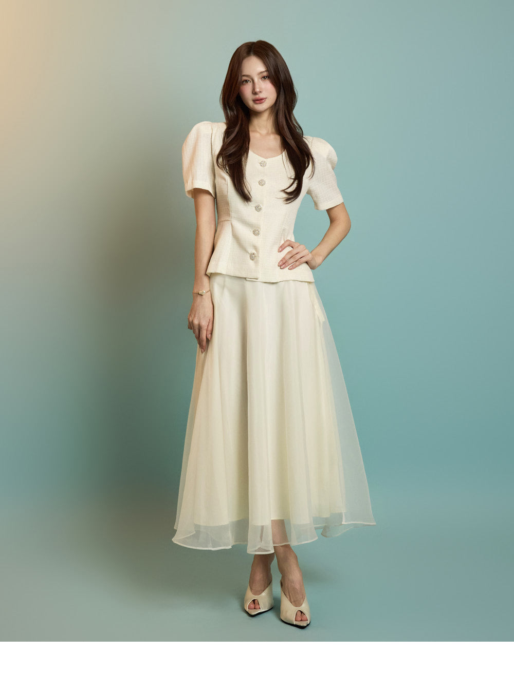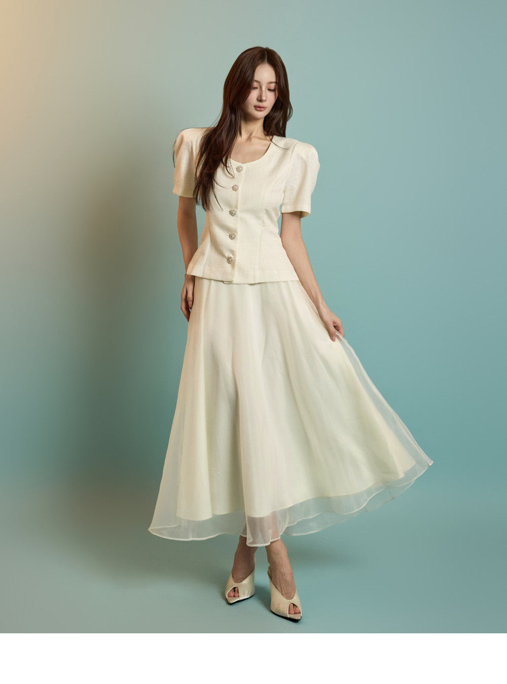The model is 167 cm tall, wearing a jacket in size S and a skirt in one size, in ivory.