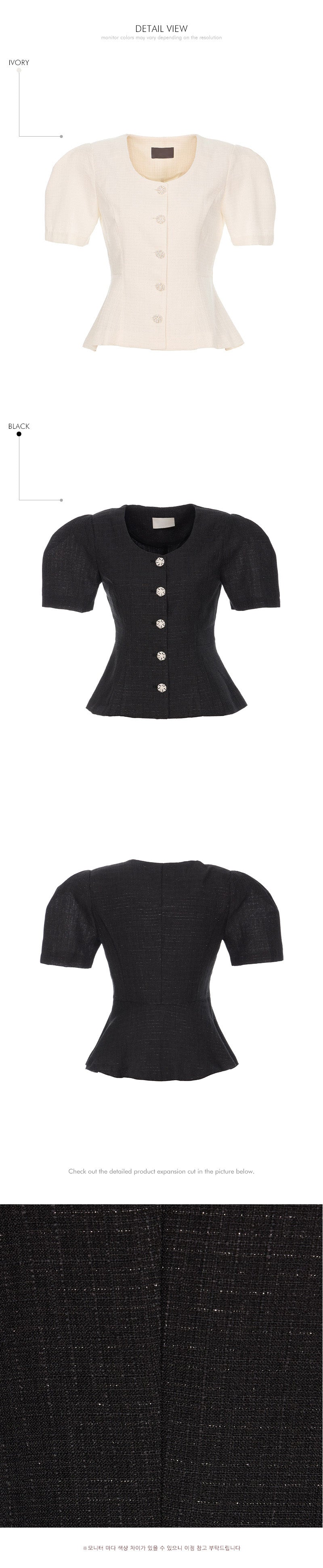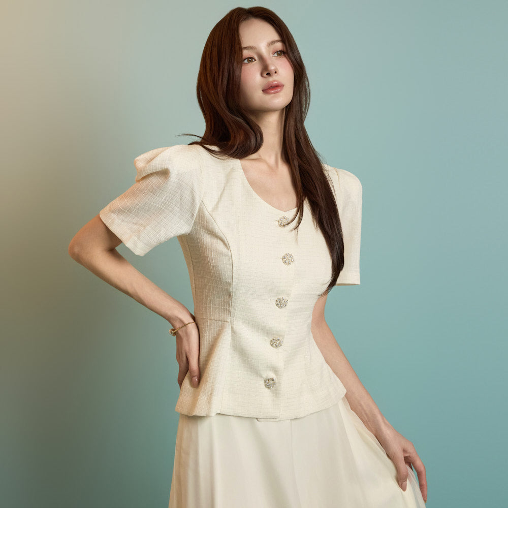 The jacket features puffed shoulders