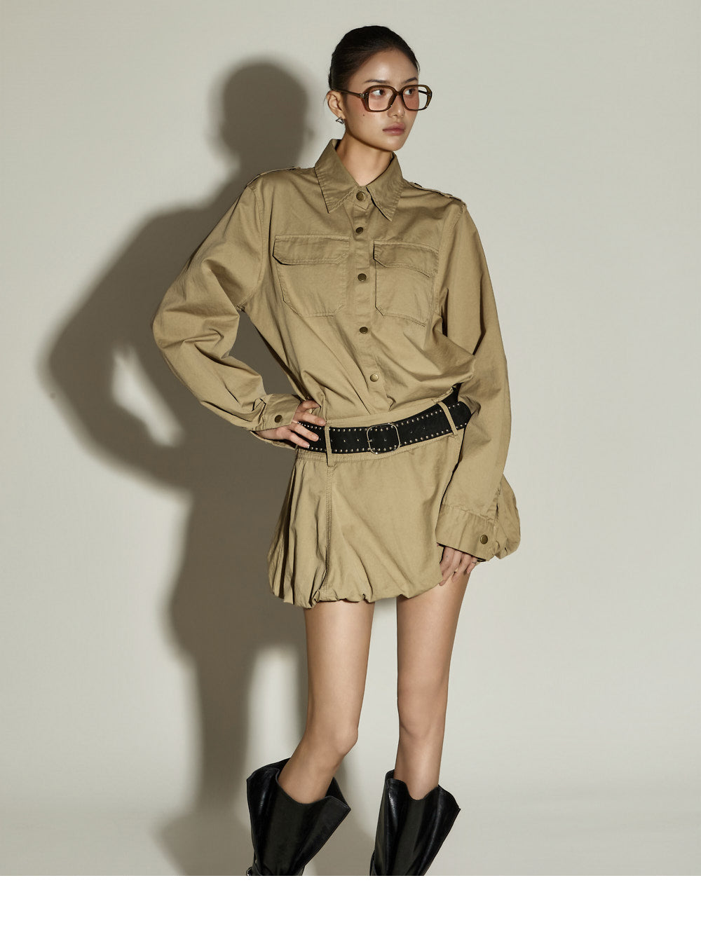The top features a shirt design with a loose fit and U-shaped hem,