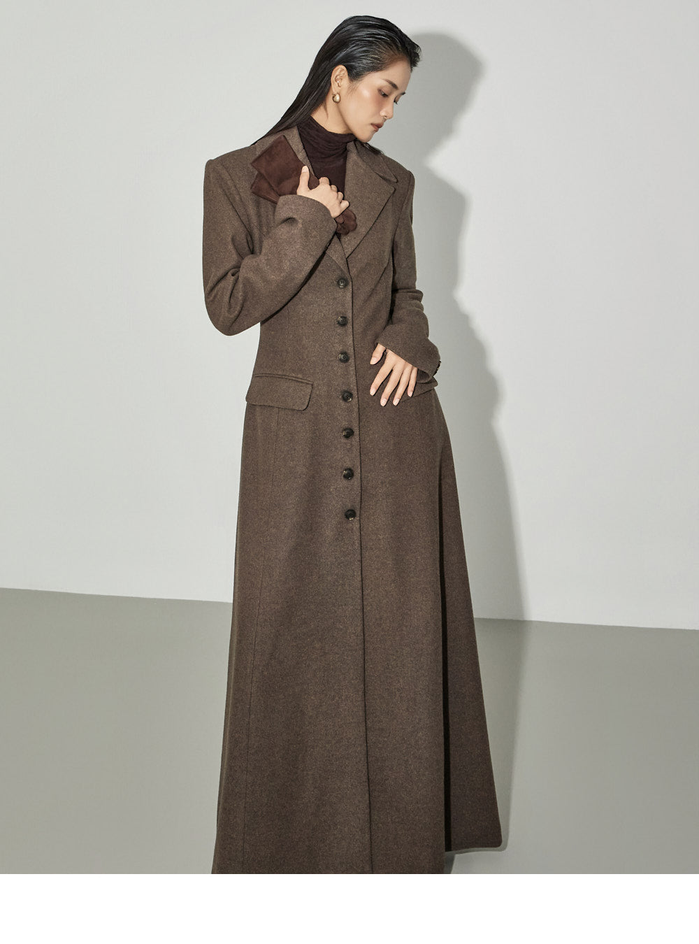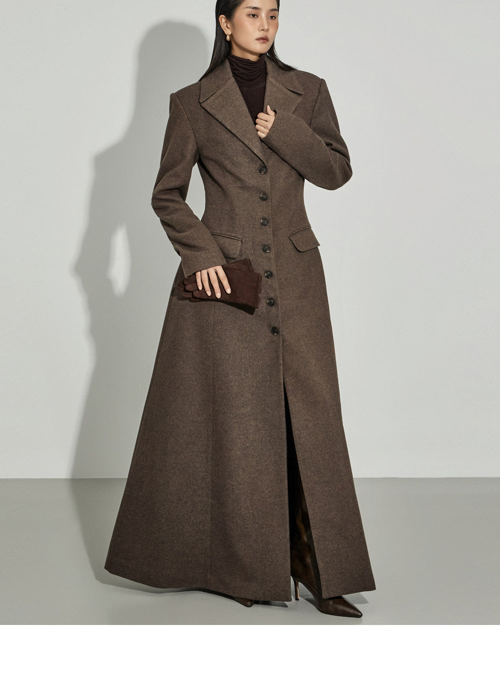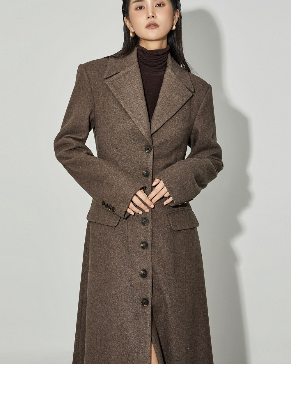 This coat maxi dress exudes a modern vibe.