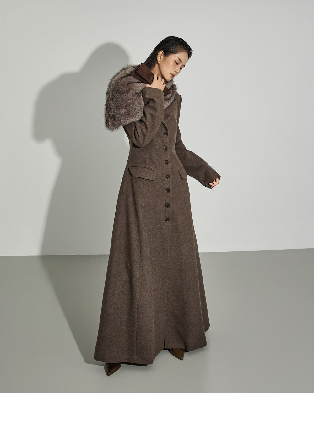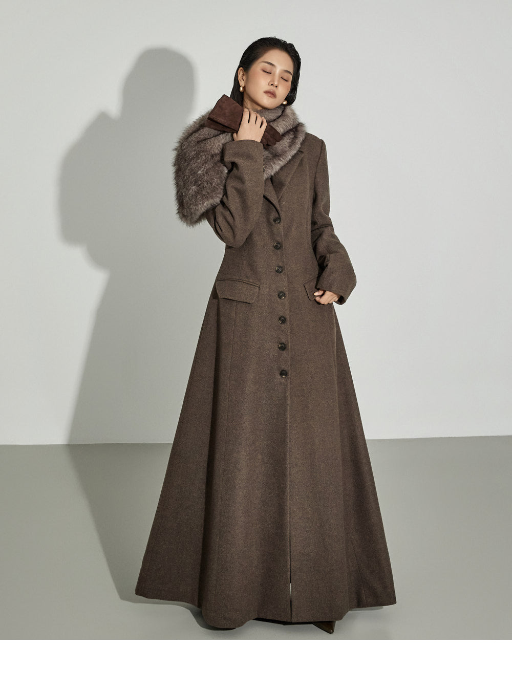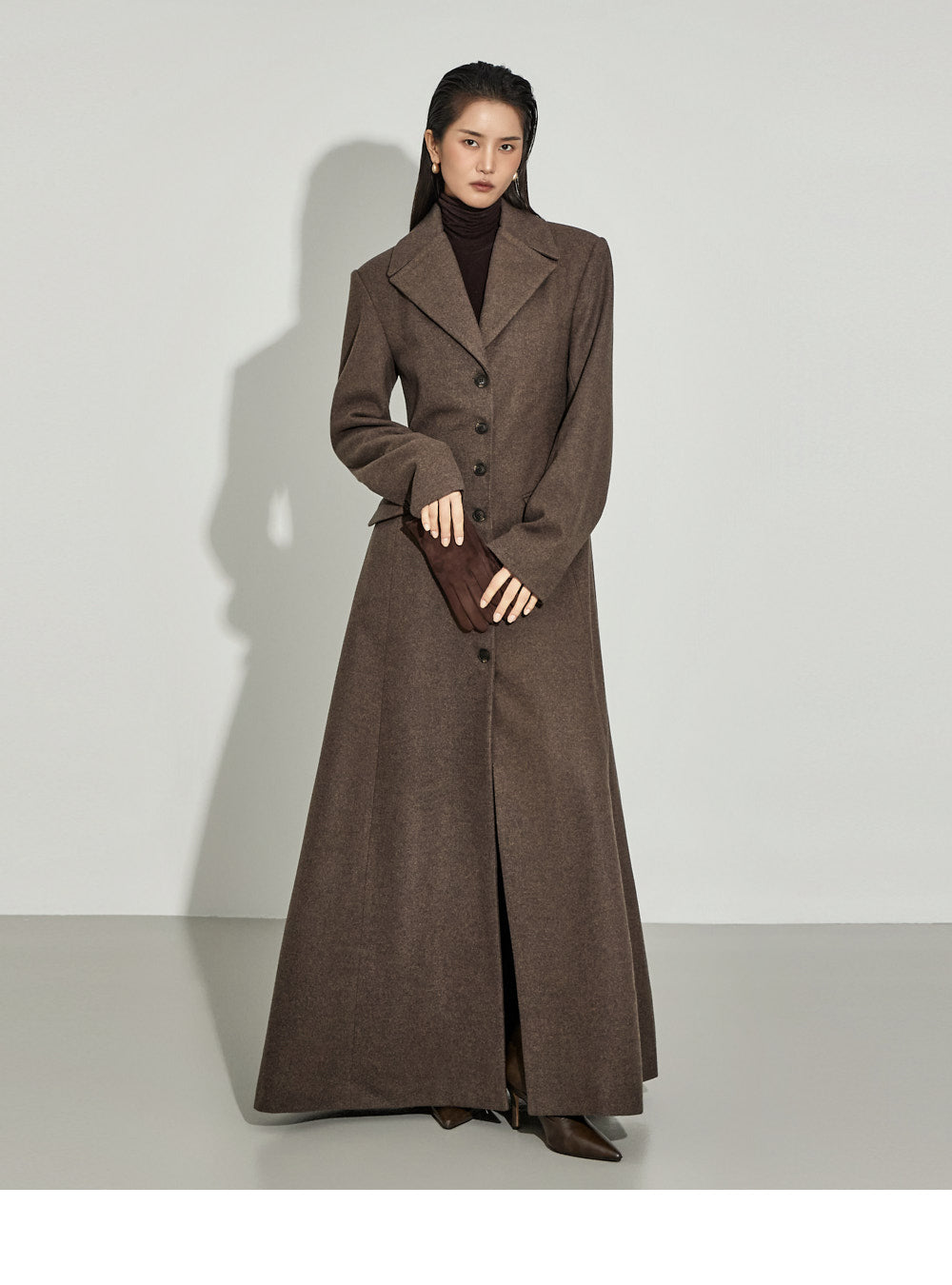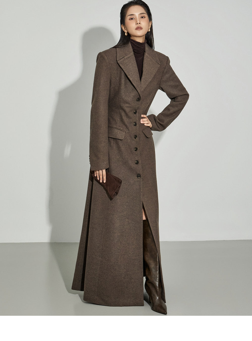 This coat maxi dress exudes a modern vibe.