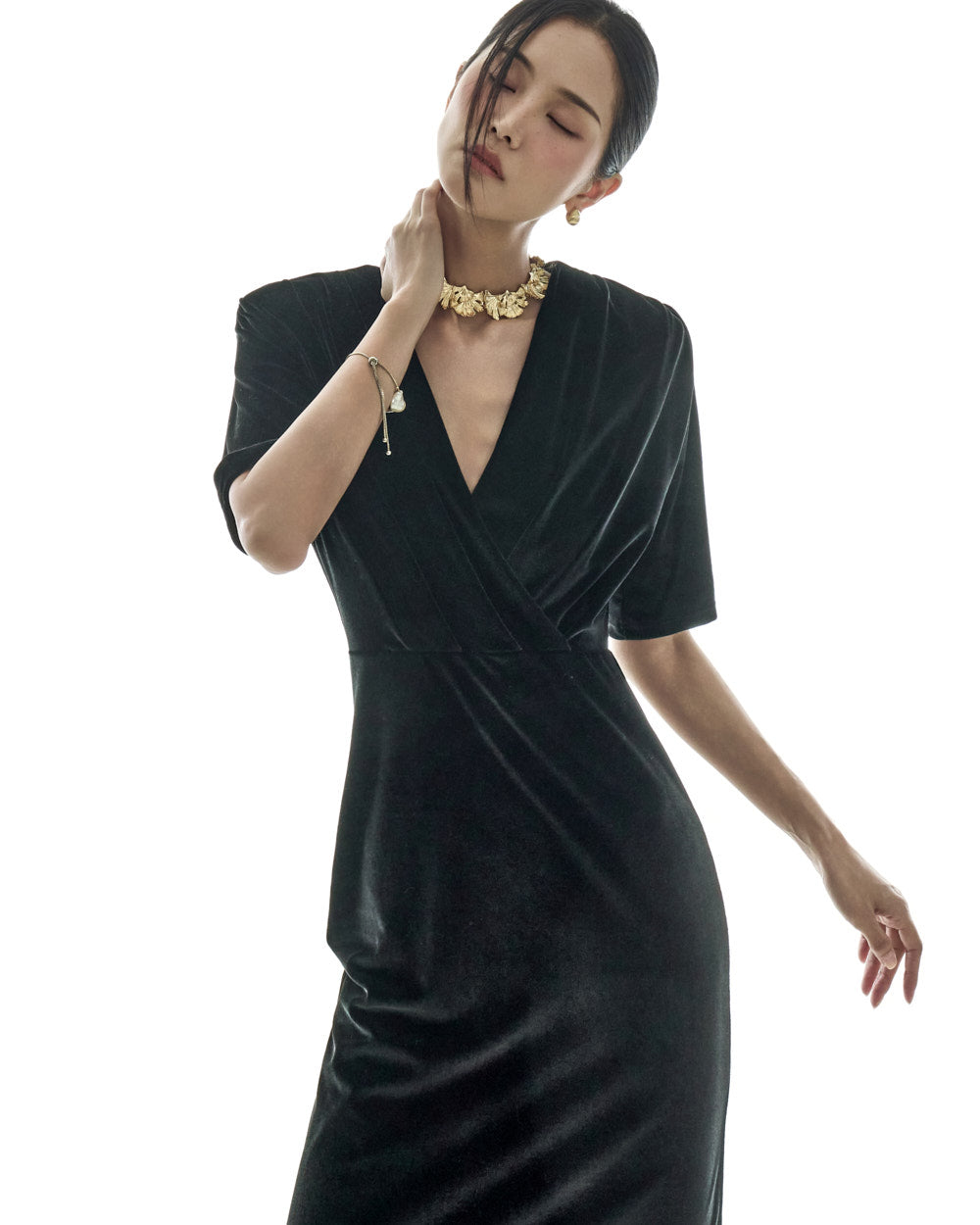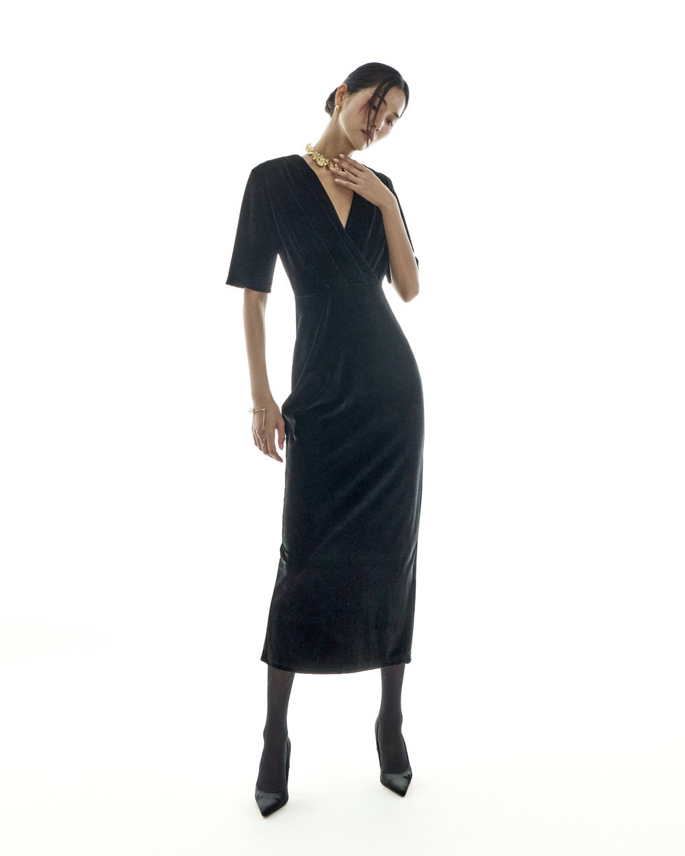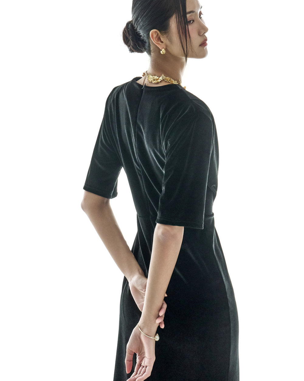 The short sleeves, slim waistline, and H-line skirt create a sophisticated silhouette,
