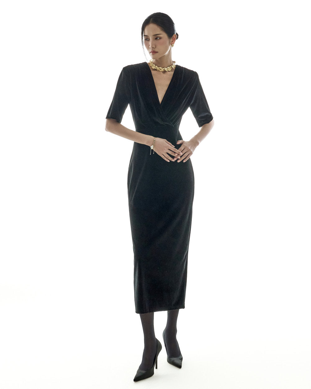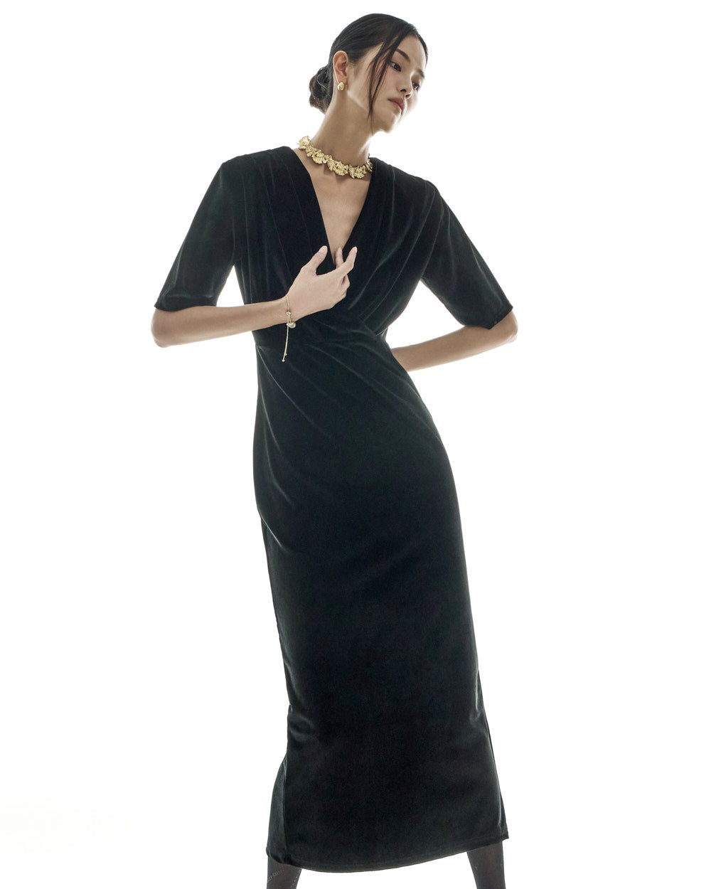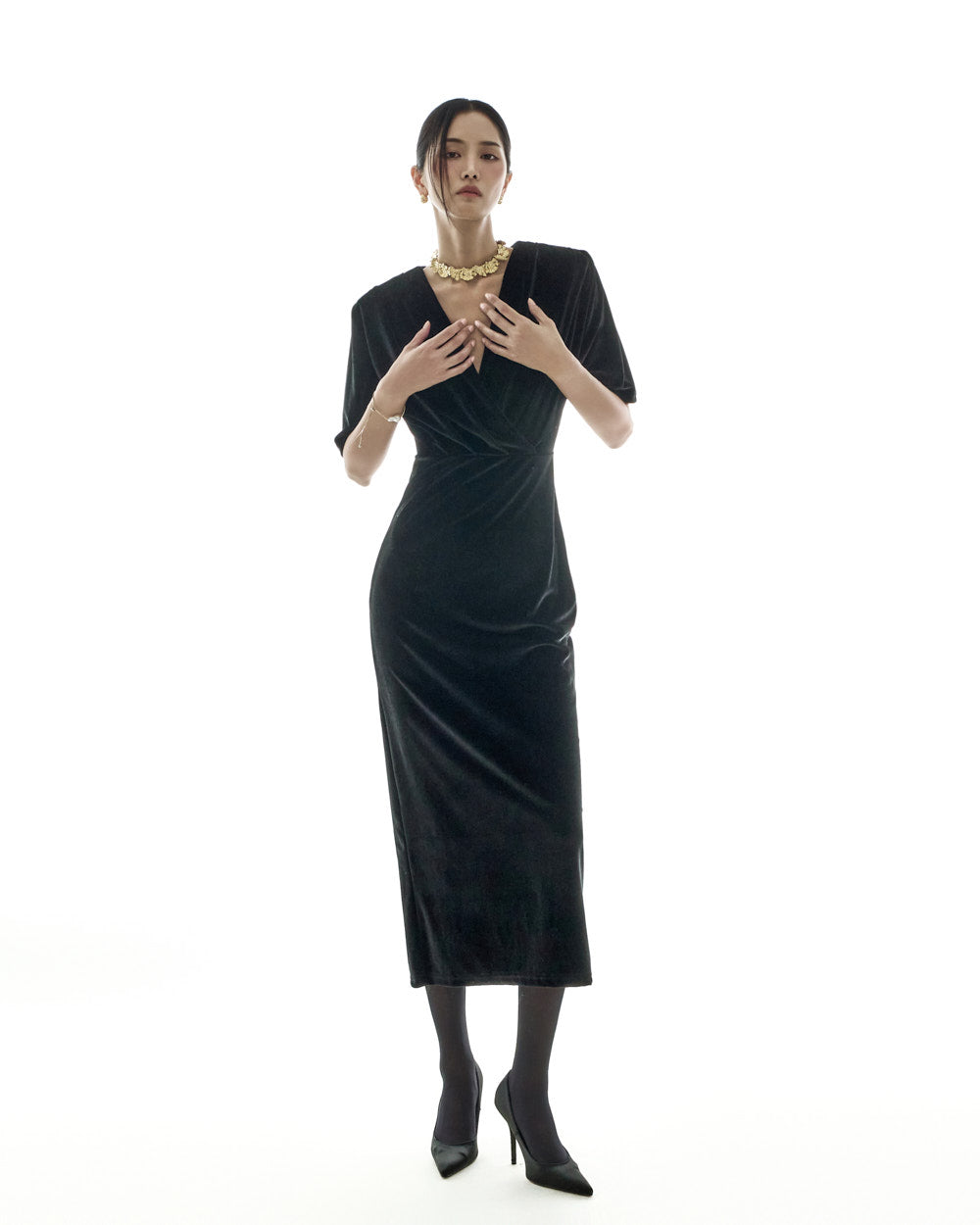 The short sleeves, slim waistline, and H-line skirt create a sophisticated silhouette,