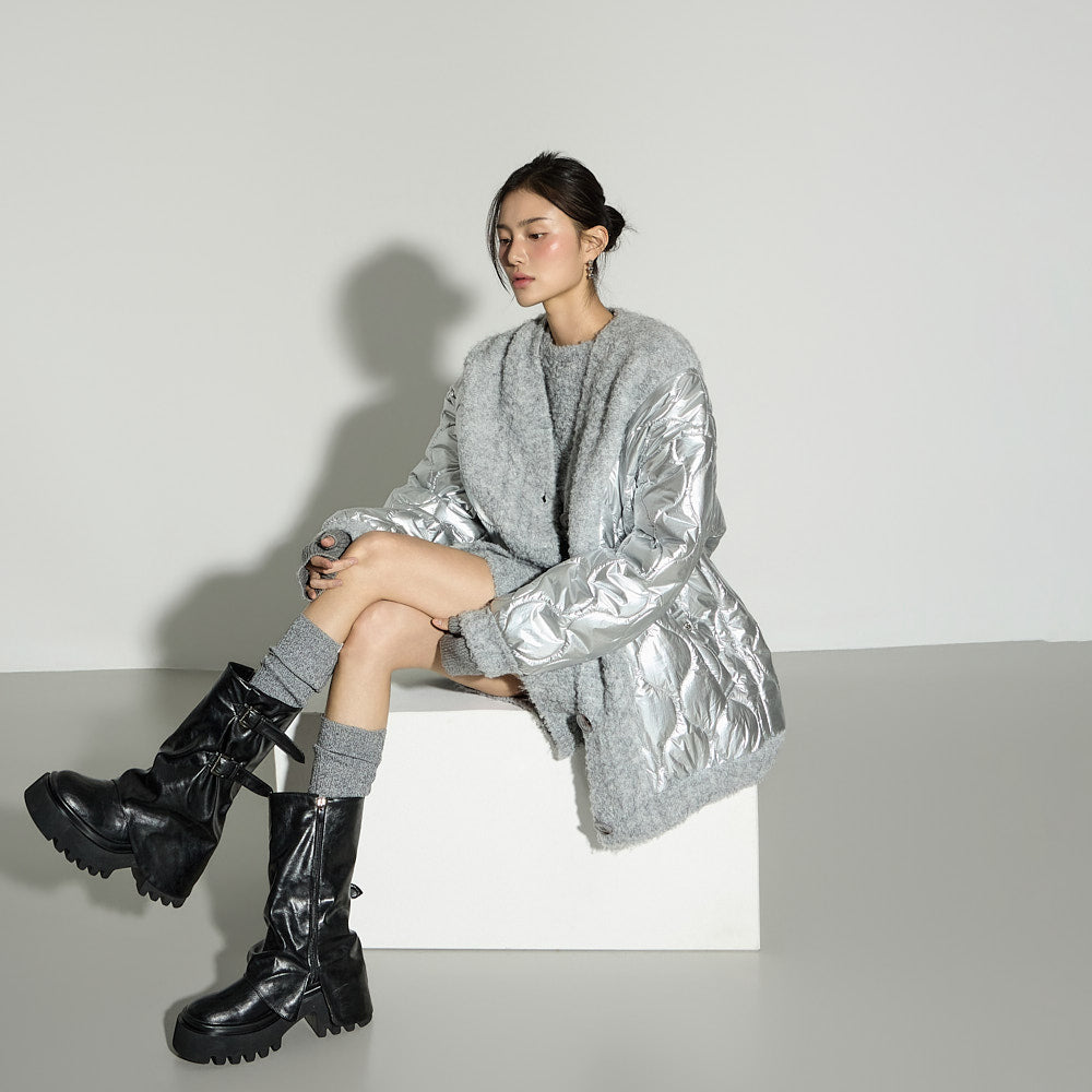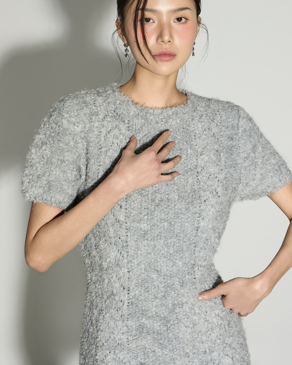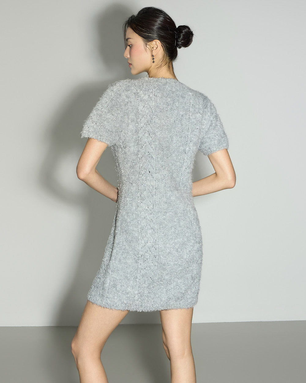 This boucle knit mini dress exudes a minimalist vibe.