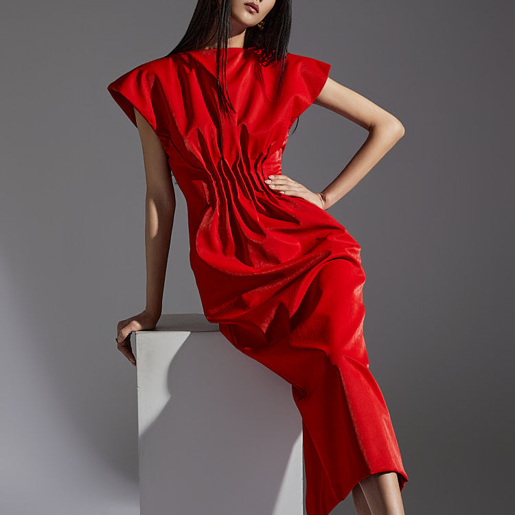 With its wide shoulder line, this long dress creates a slim silhouette,