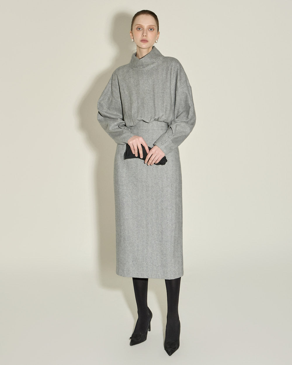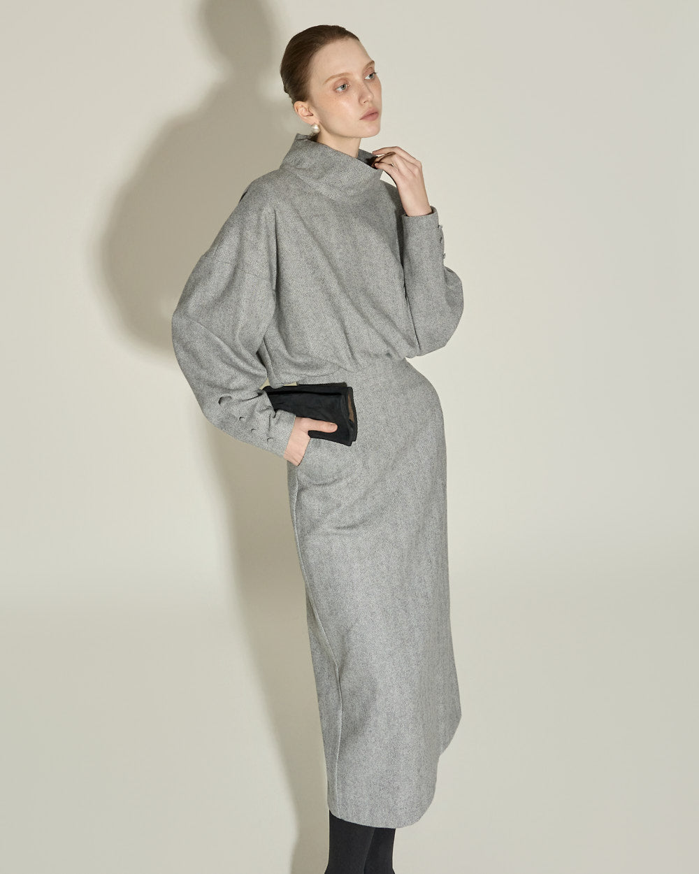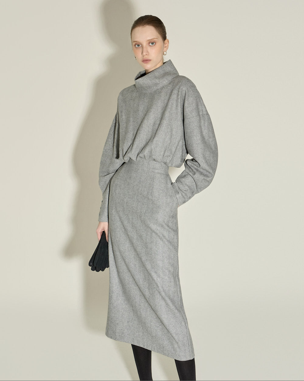 This high neck wool dress exudes a modern and feminine vibe.