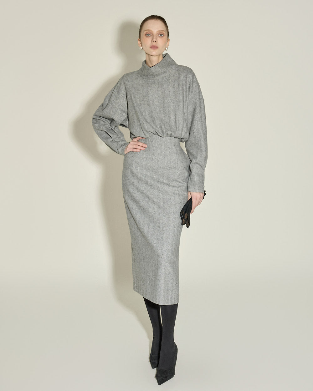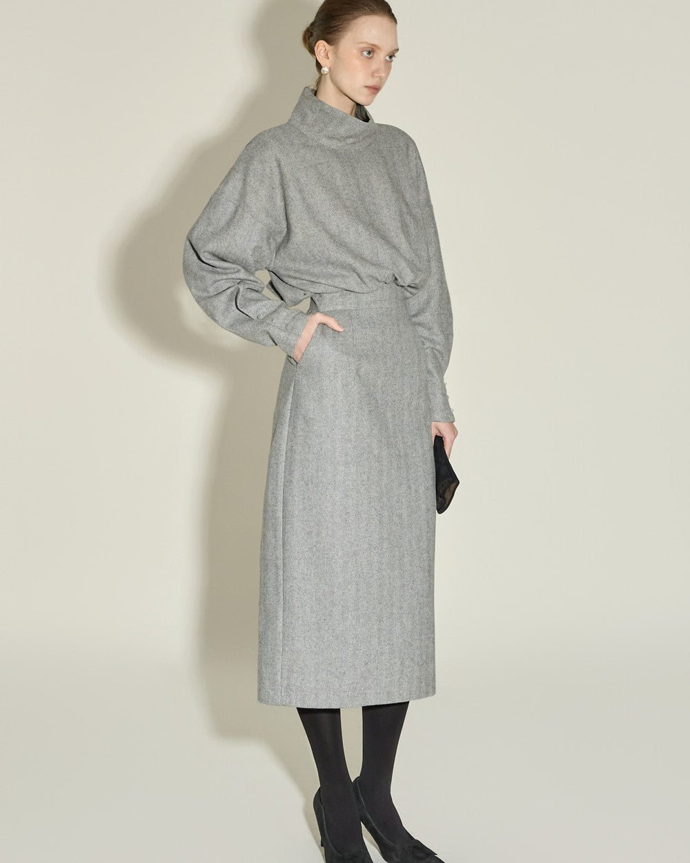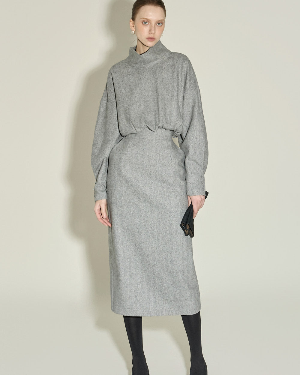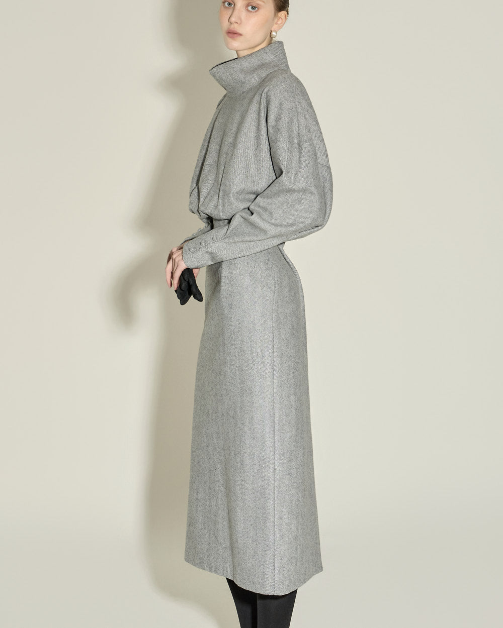 This high neck wool dress exudes a modern and feminine vibe.