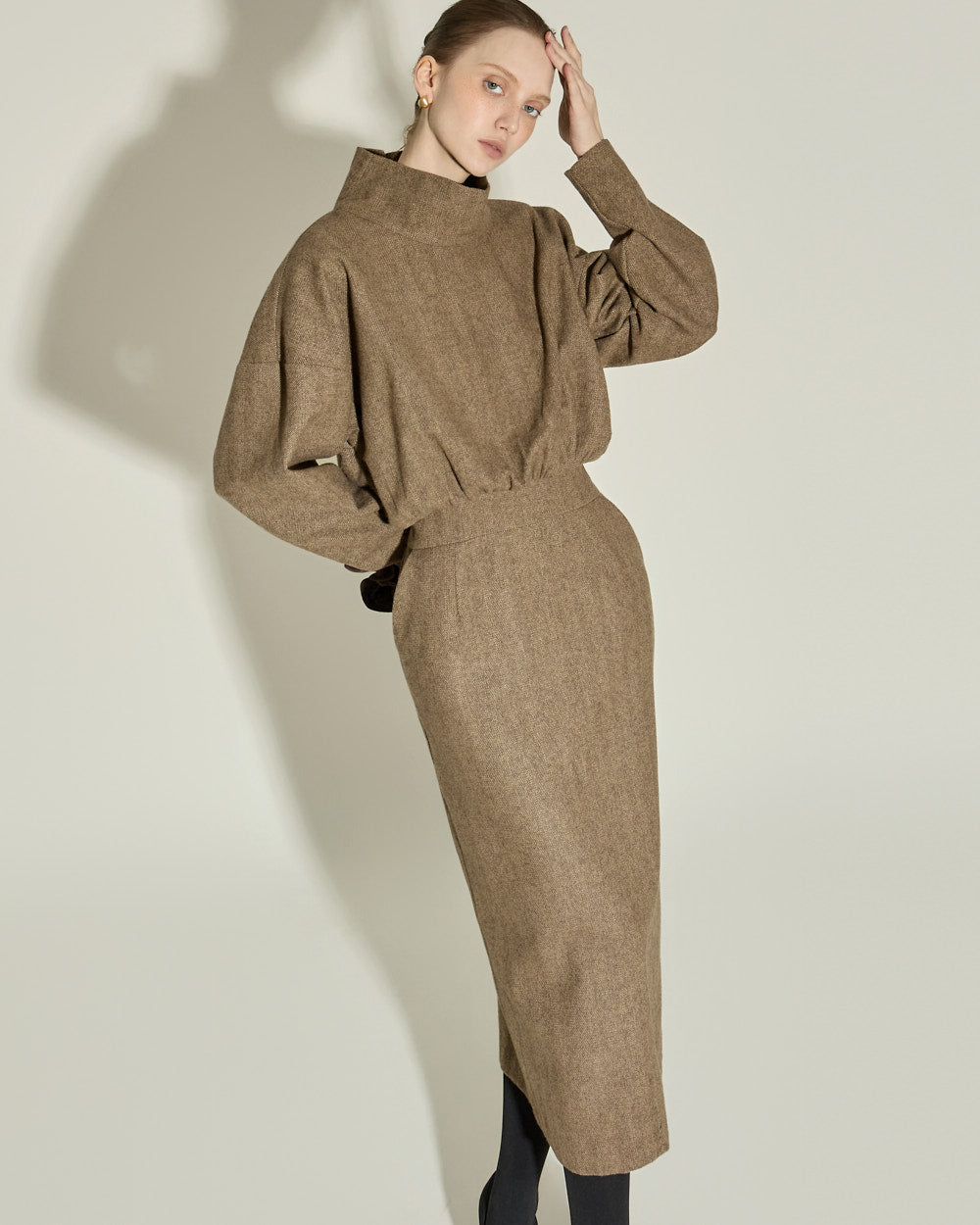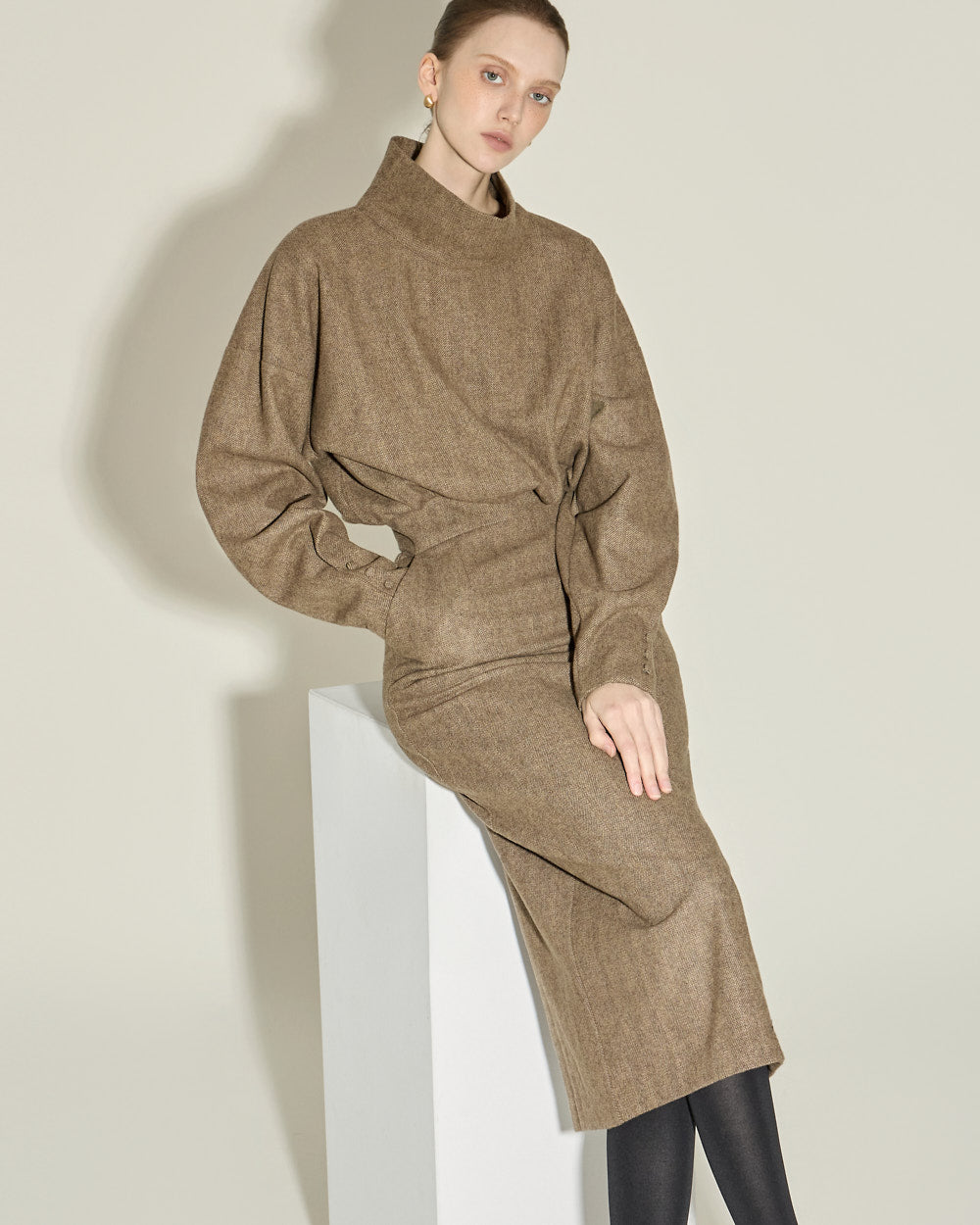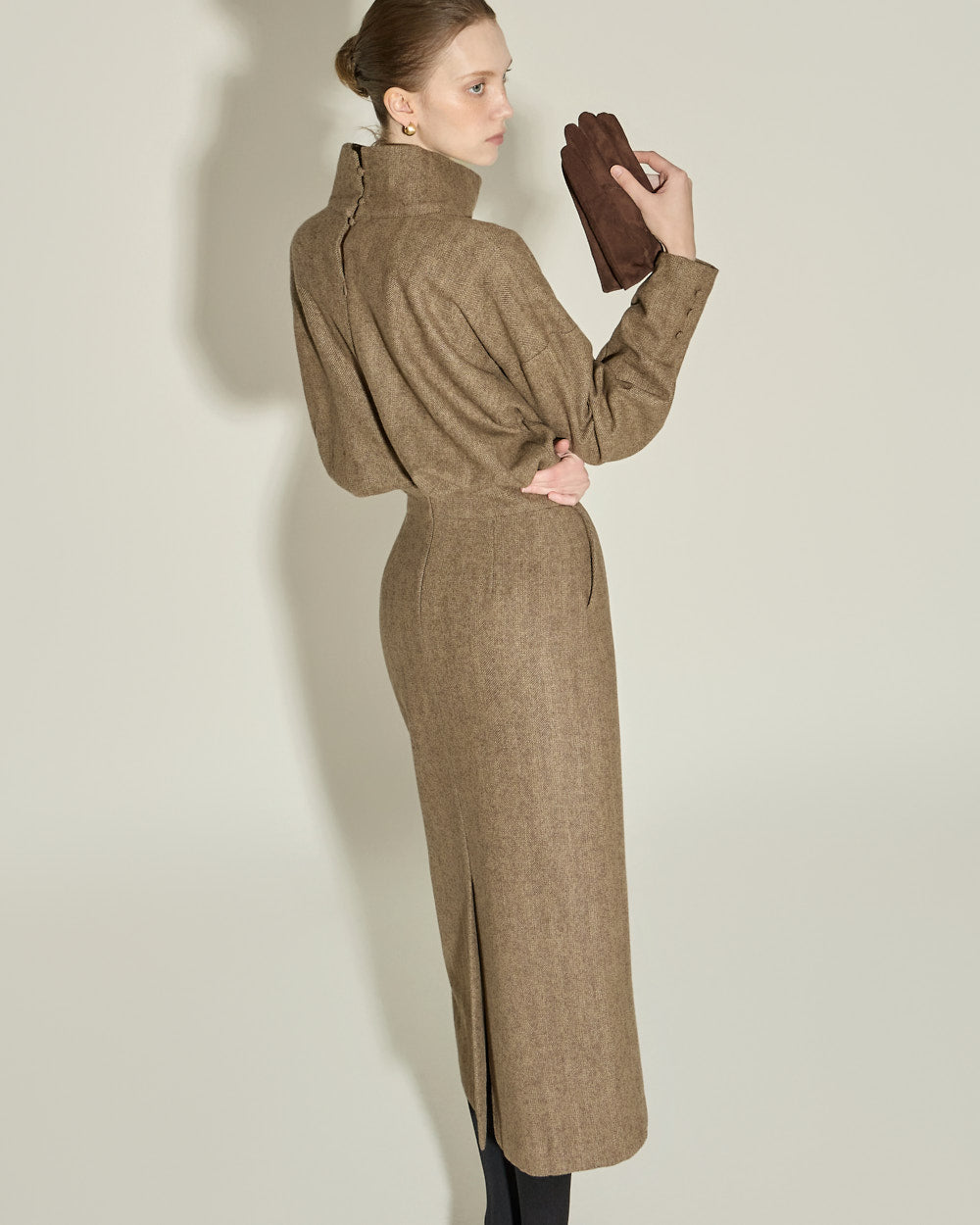 This high neck wool dress exudes a modern and feminine vibe.