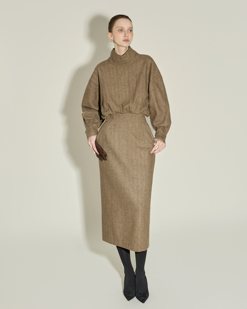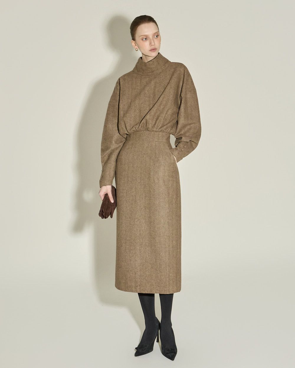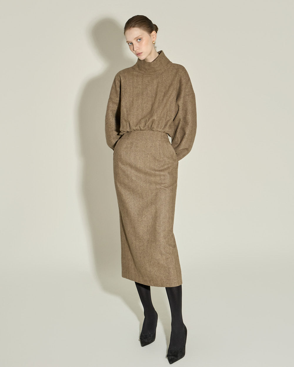 This high neck wool dress exudes a modern and feminine vibe.