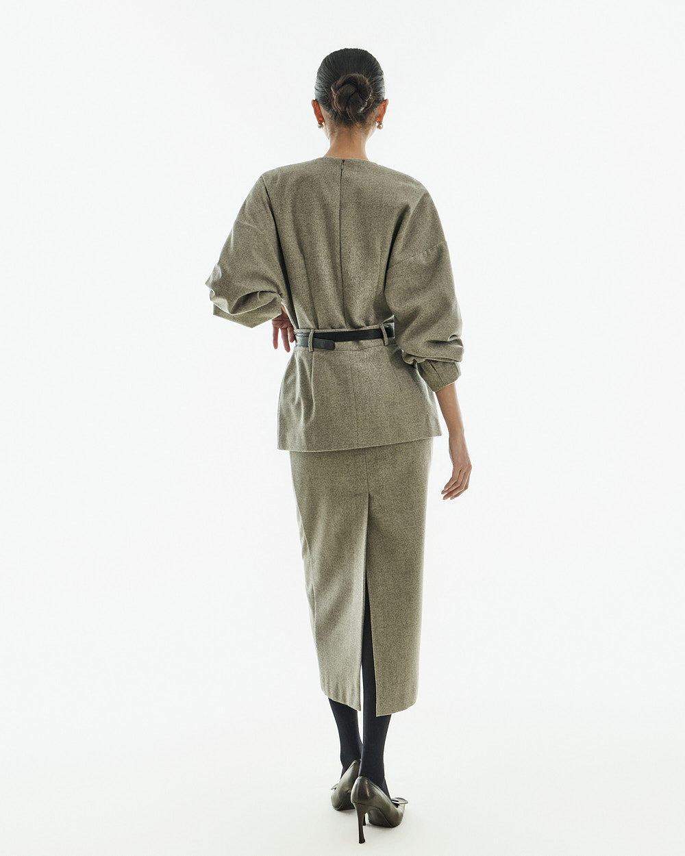 The ivory version features a gold buckle belt, and the gray version features a silver buckle belt.
