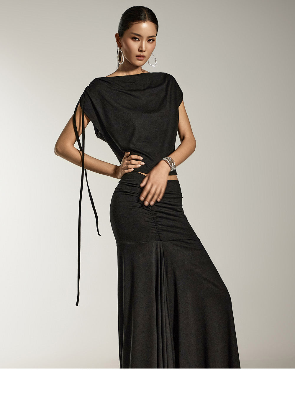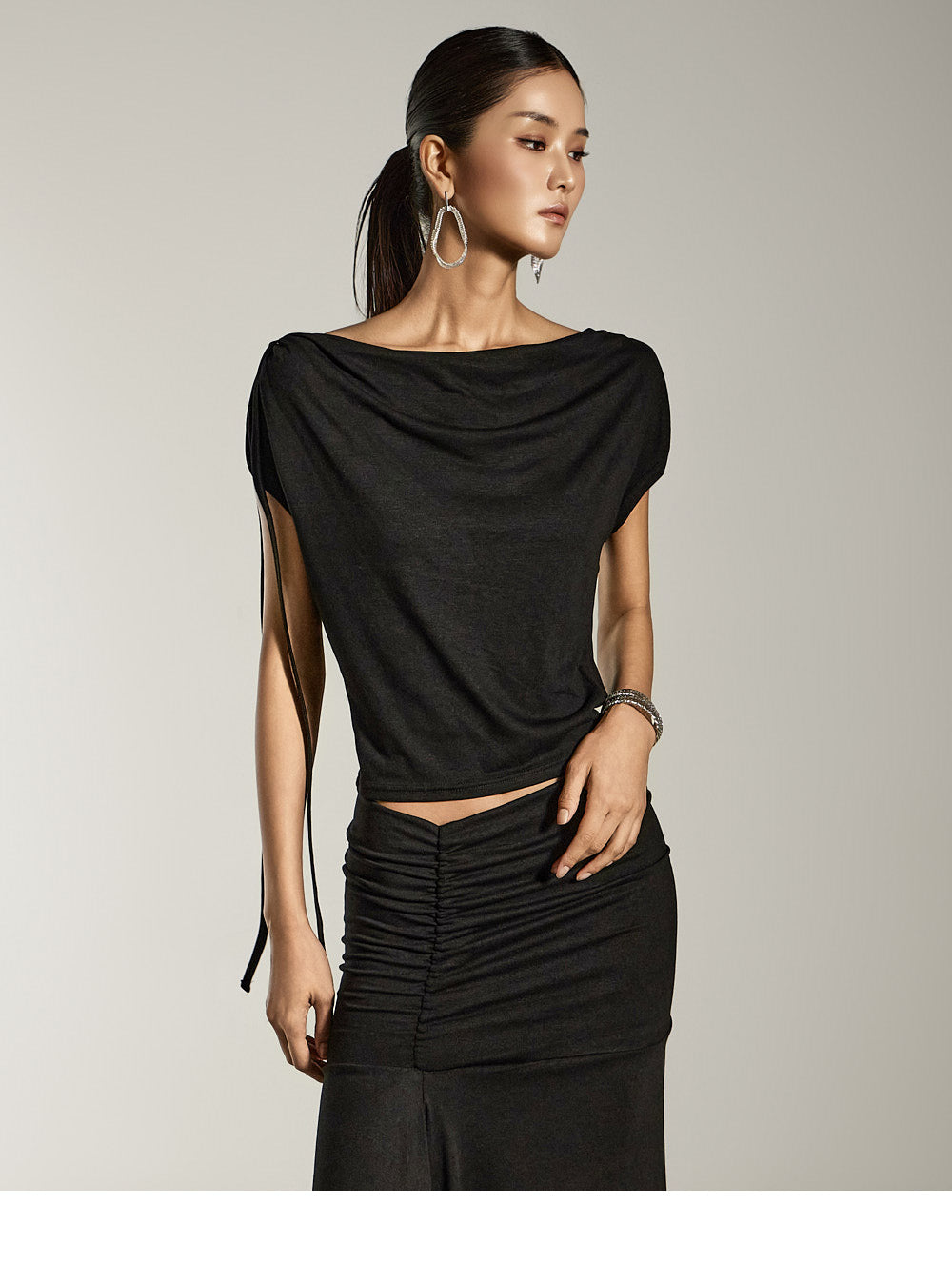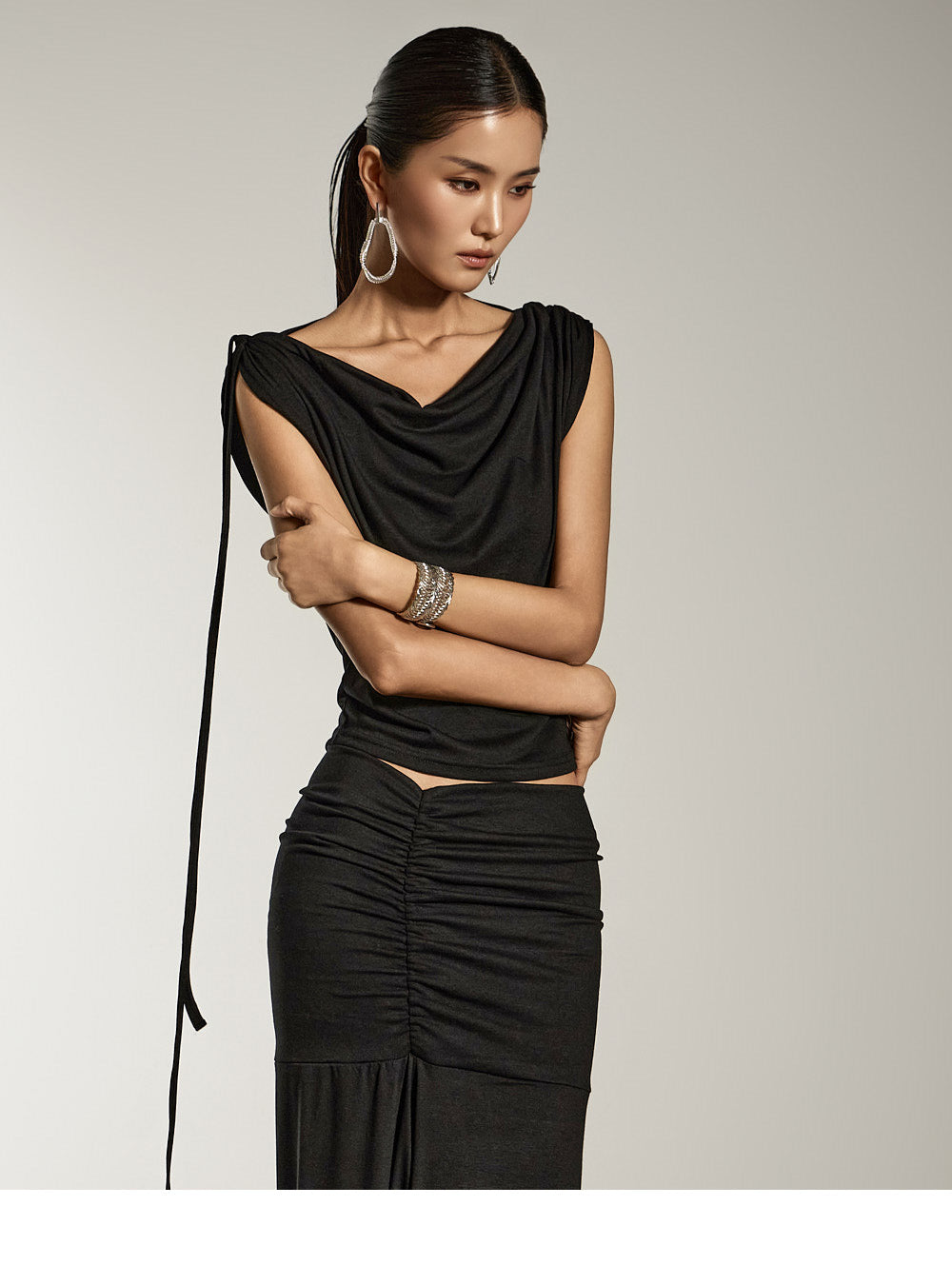 This is a draped top with a sophisticated mood.