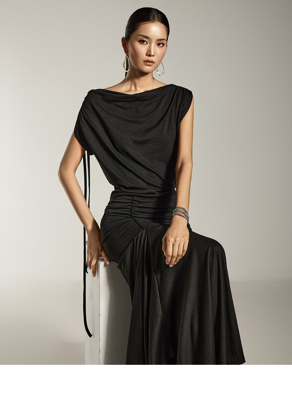 The naturally flowing drape silhouette adds a feminine touch,