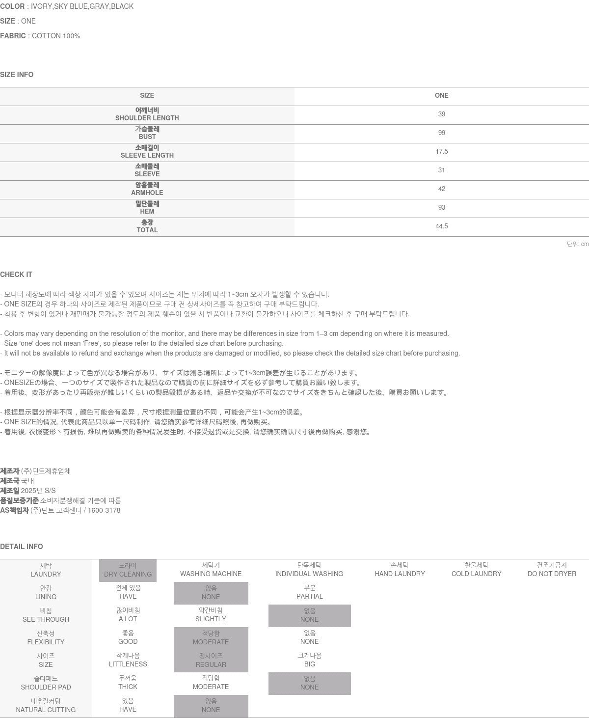 Clothing from DINT Co., Ltd. may become damaged or deformed if machine washed or tumble dried. We strongly recommend following the care instructions provided below.