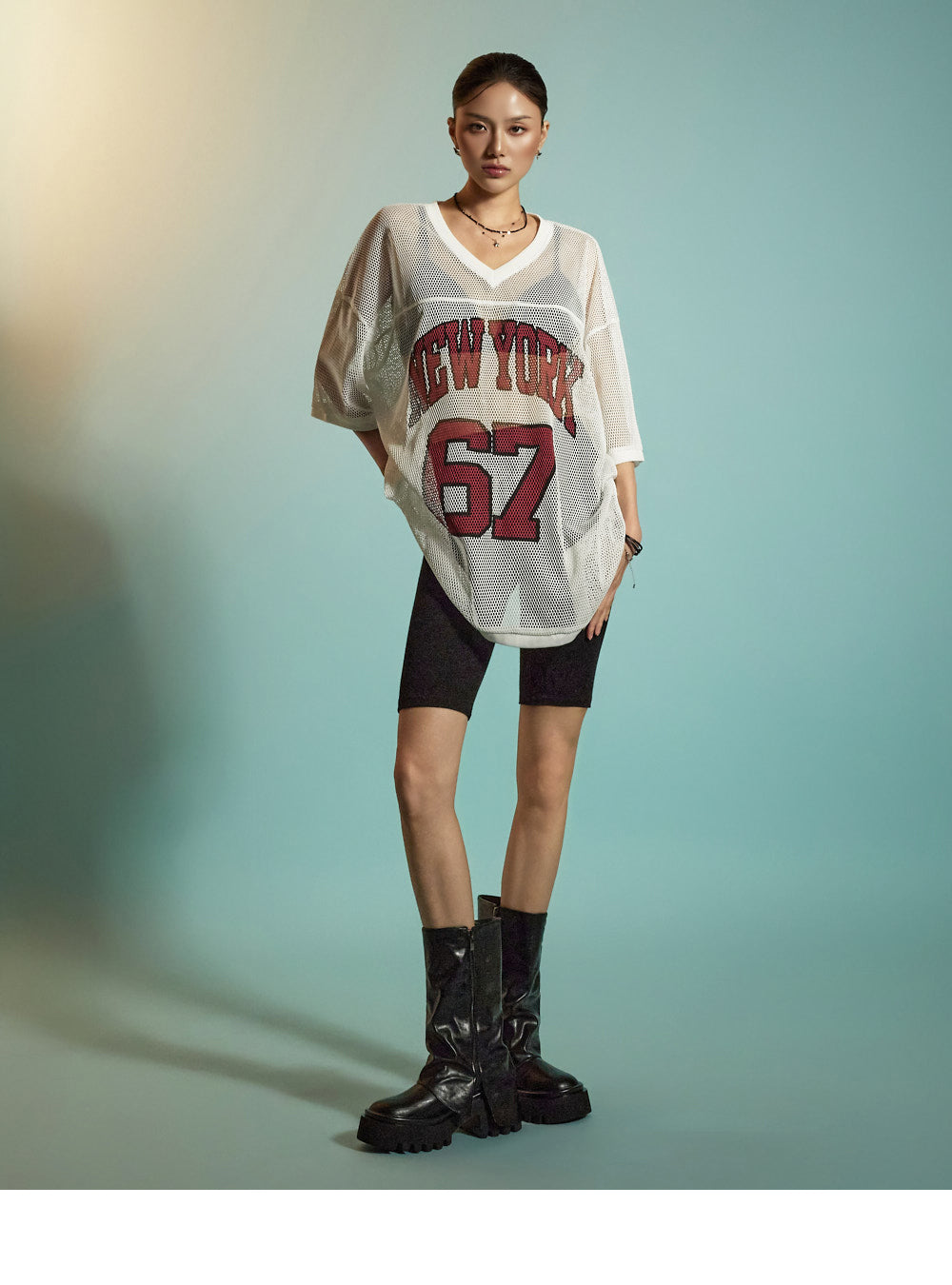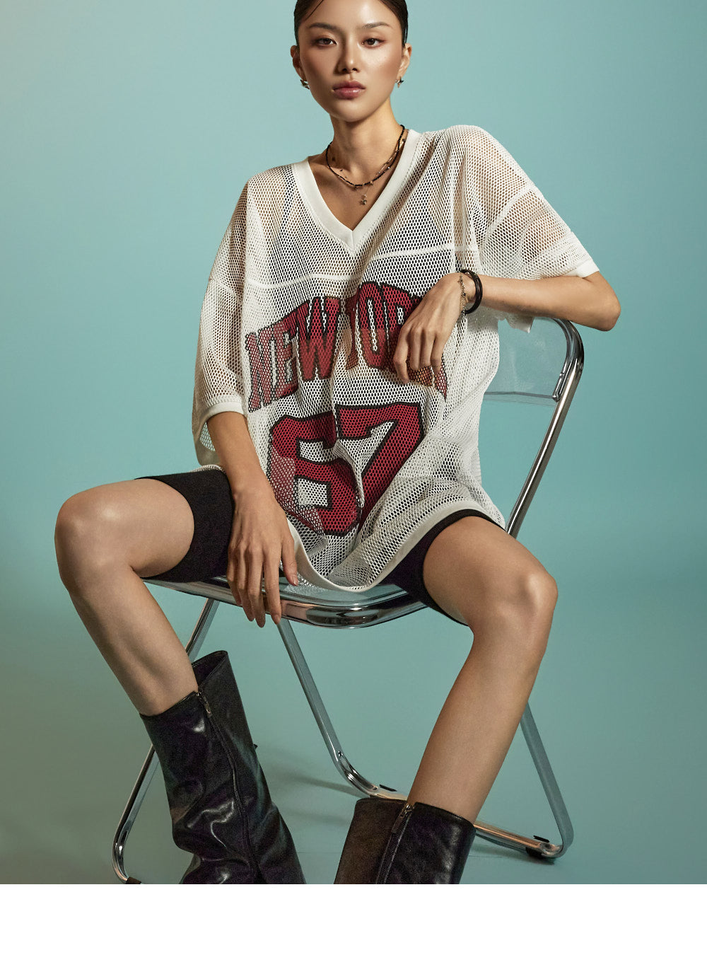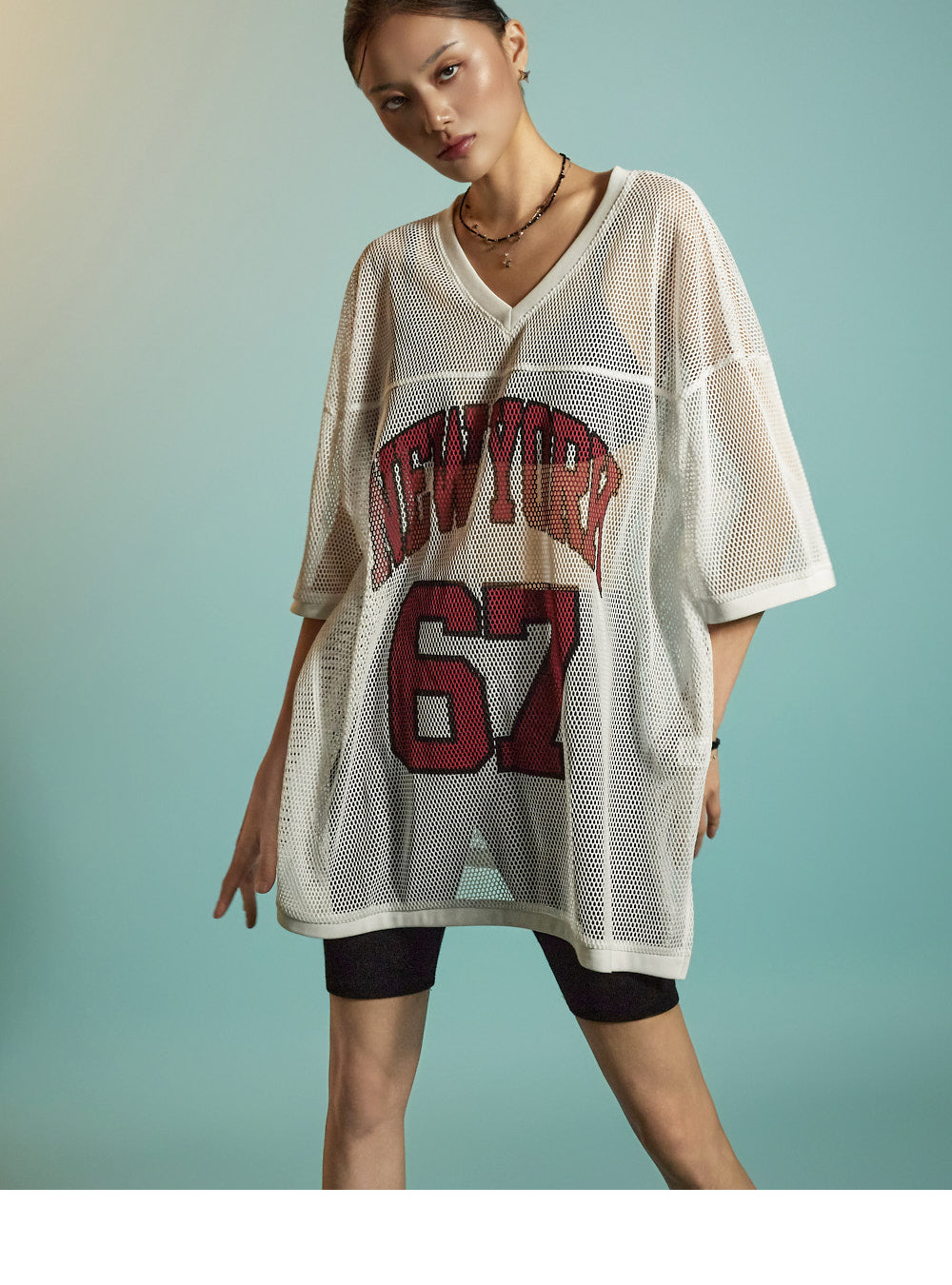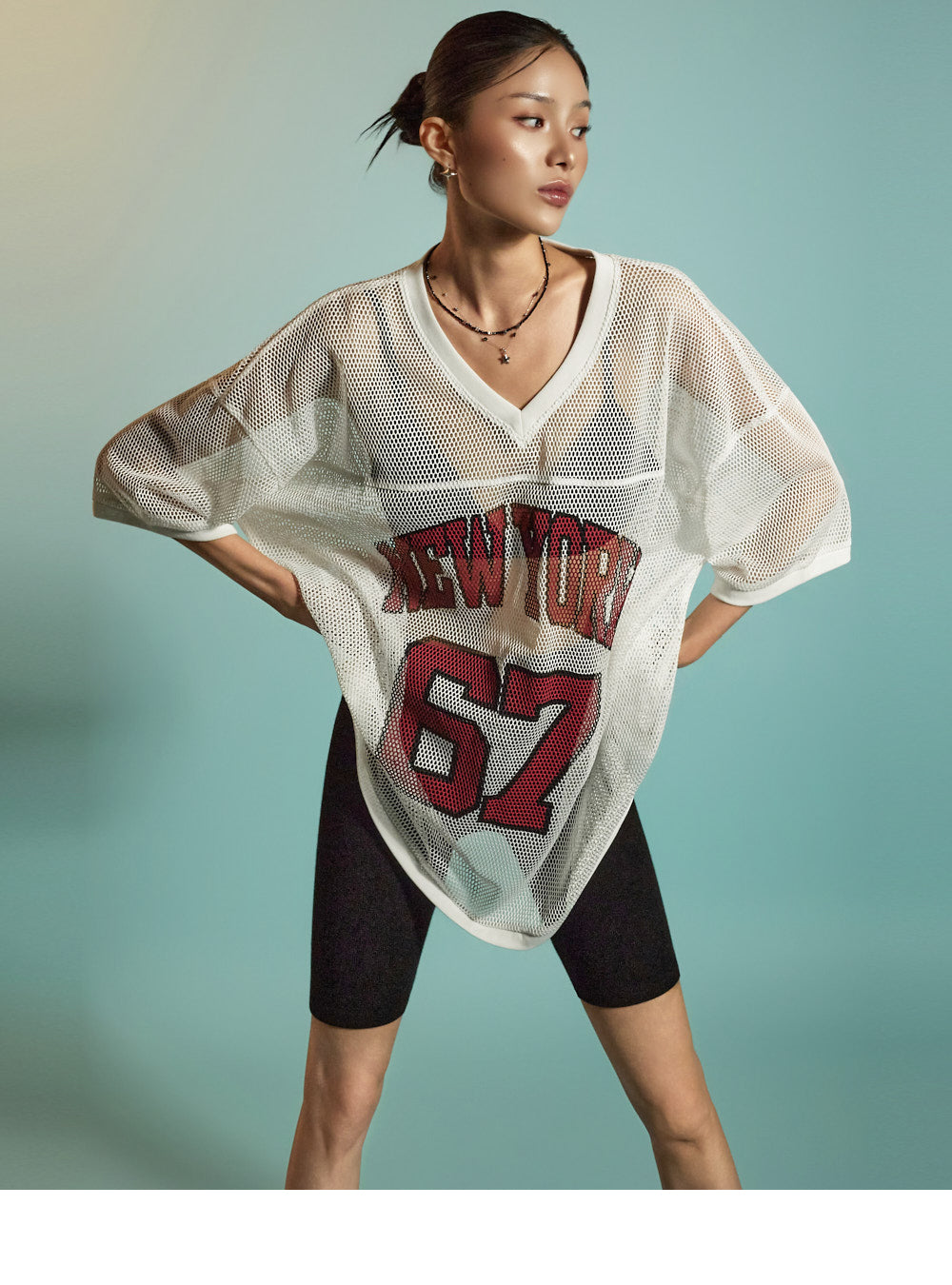 This is a casual mesh lettering top designed for everyday wear.