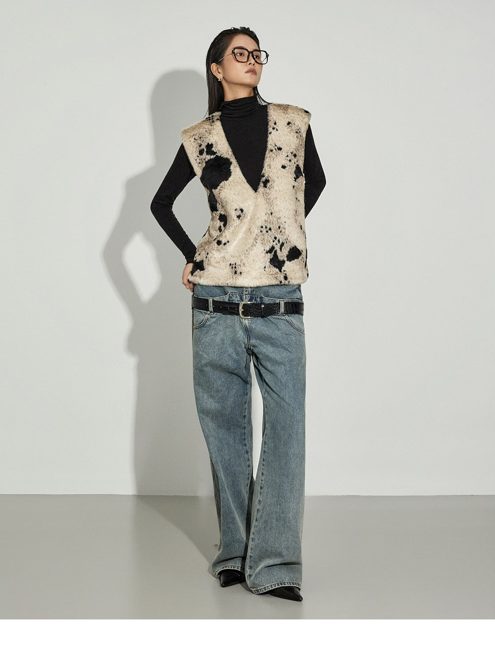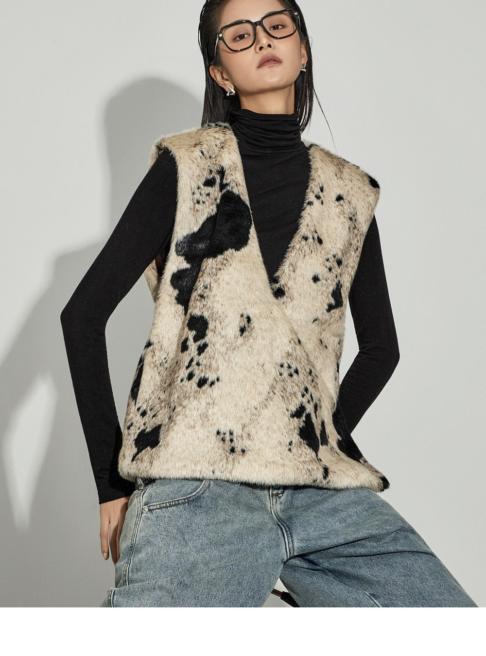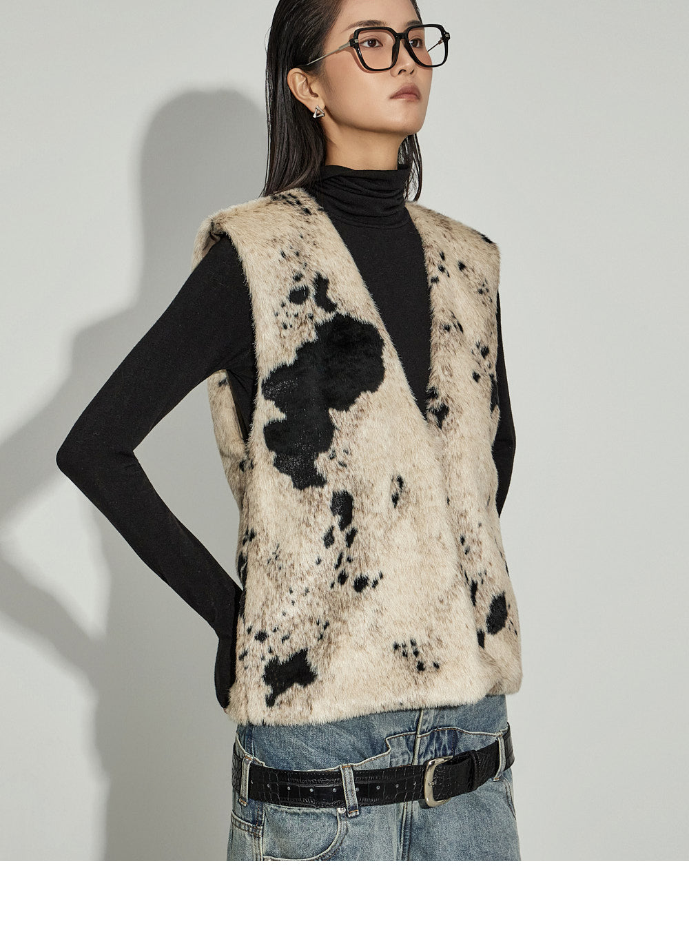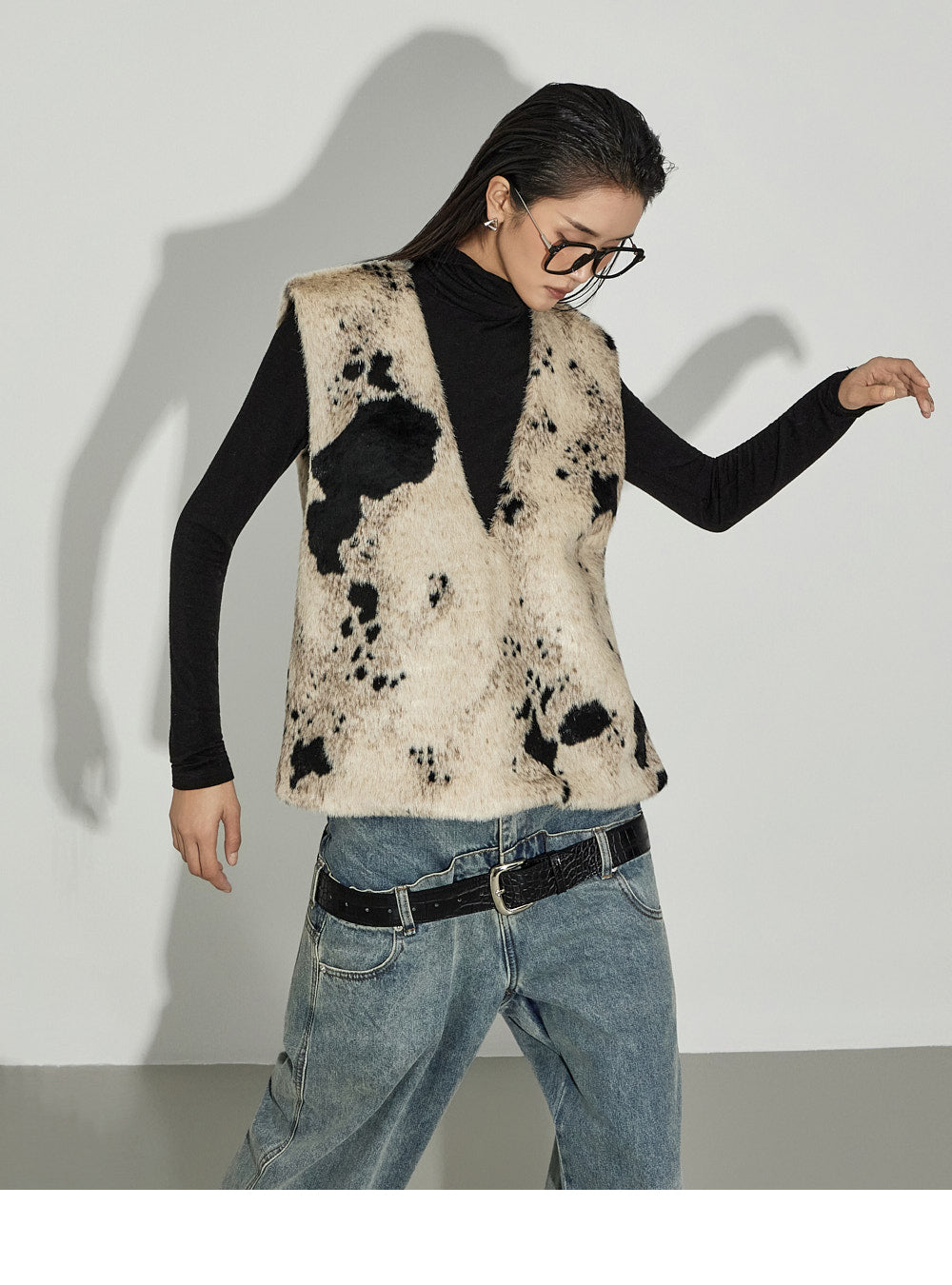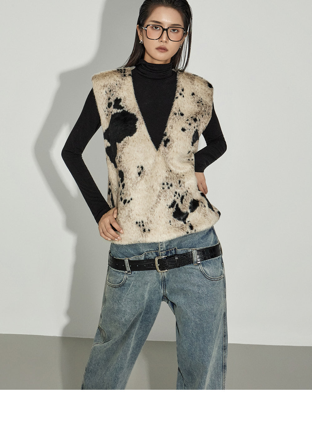 The V-neck design and cow pattern accentuate the top,