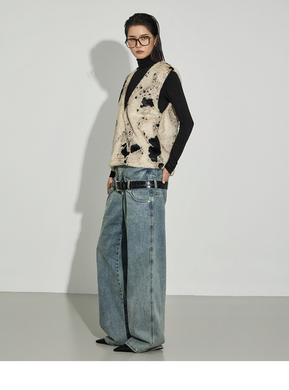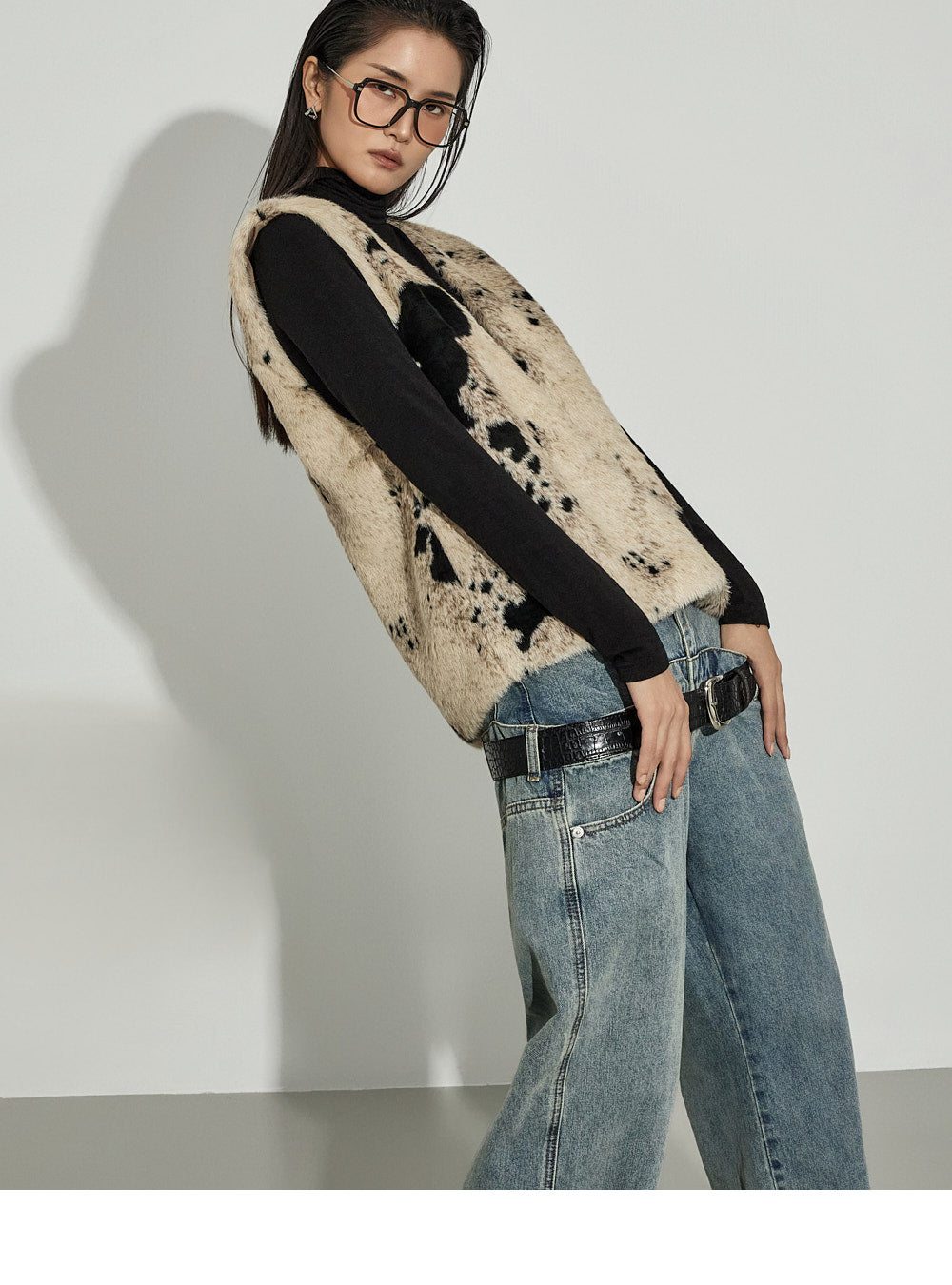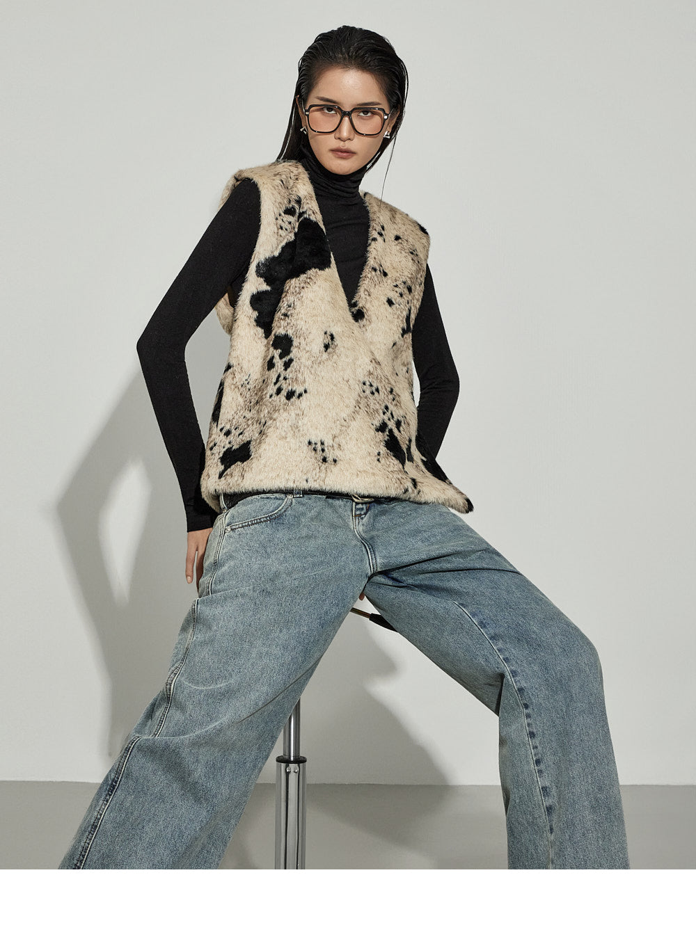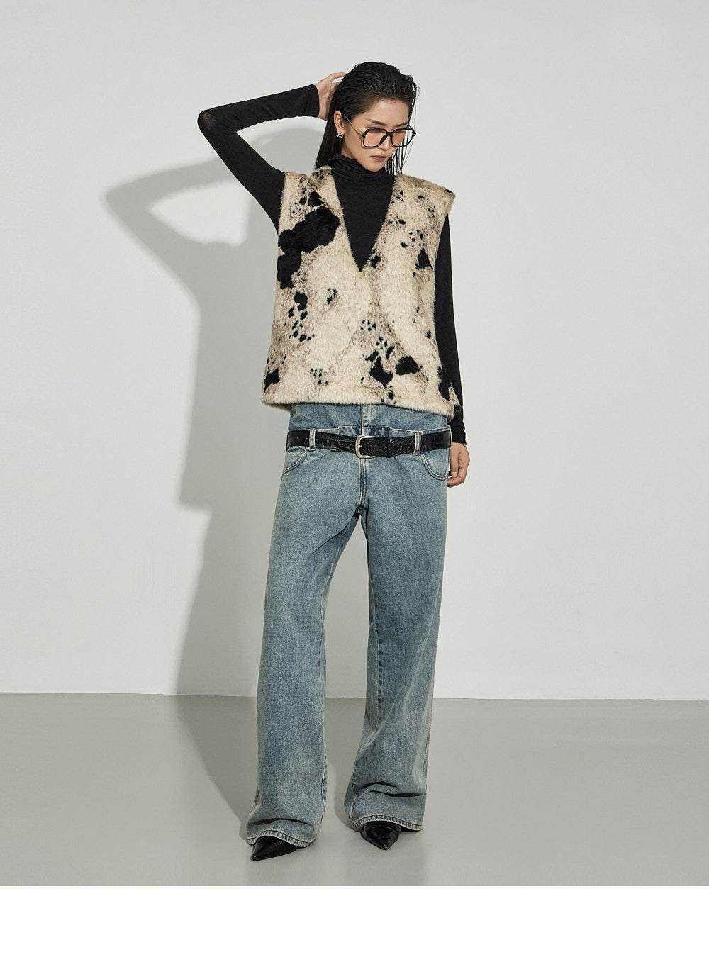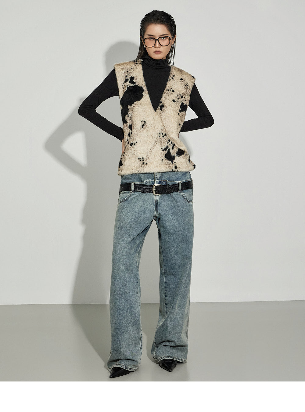 The V-neck design and cow pattern accentuate the top,