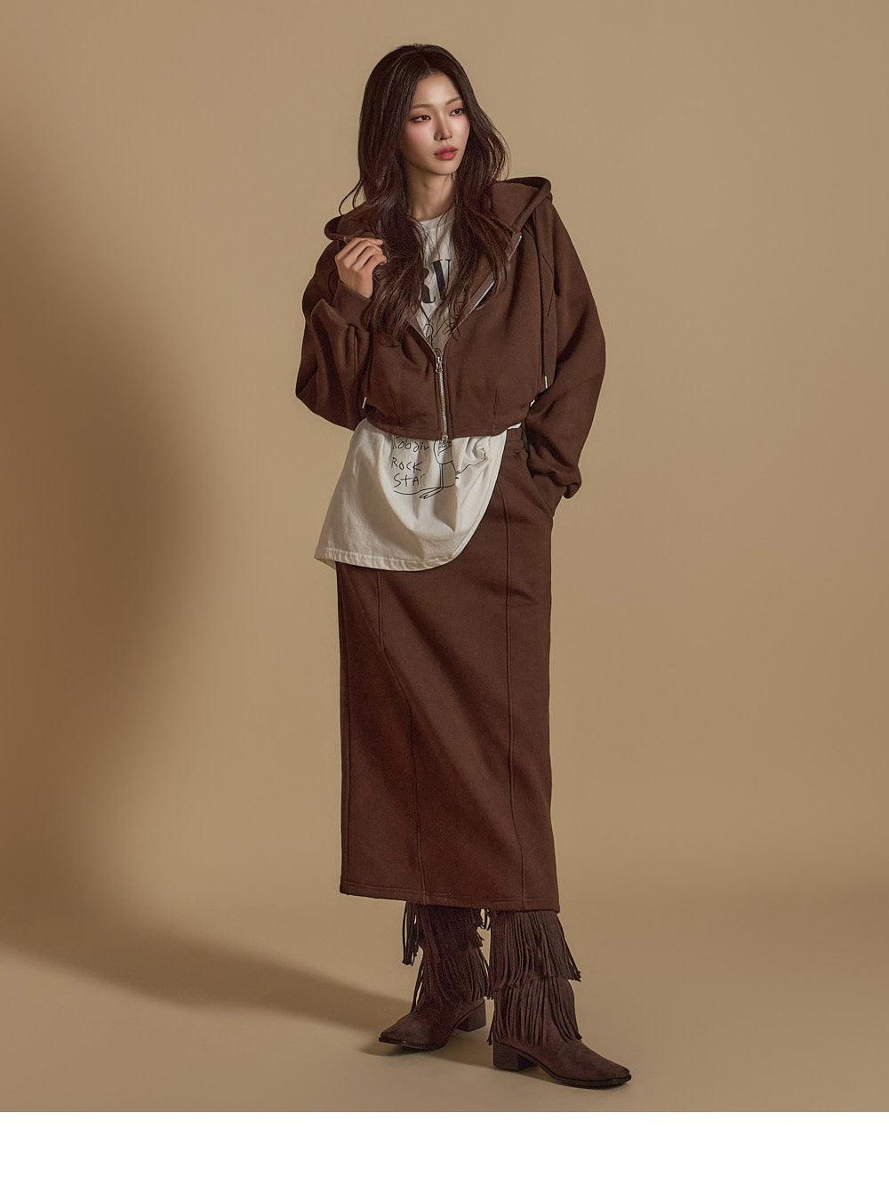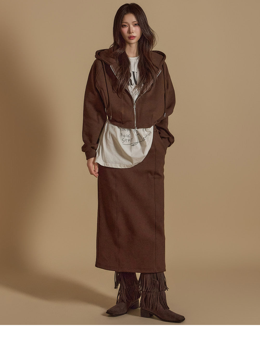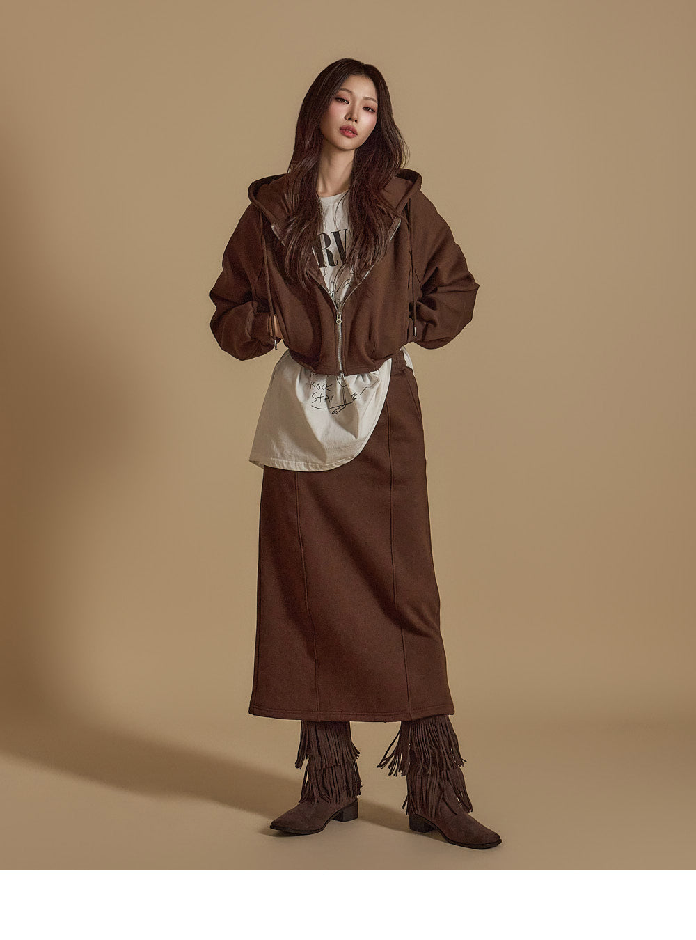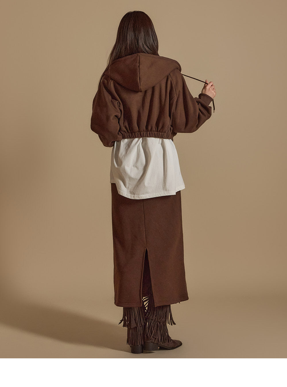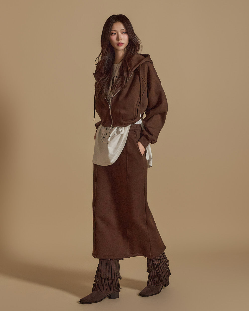 is wearing the ONE SIZE in Dark Brown.