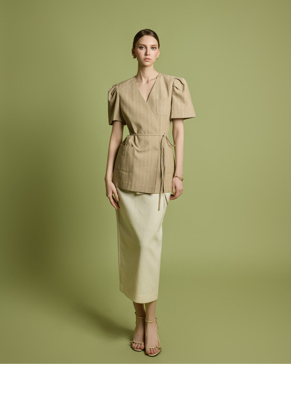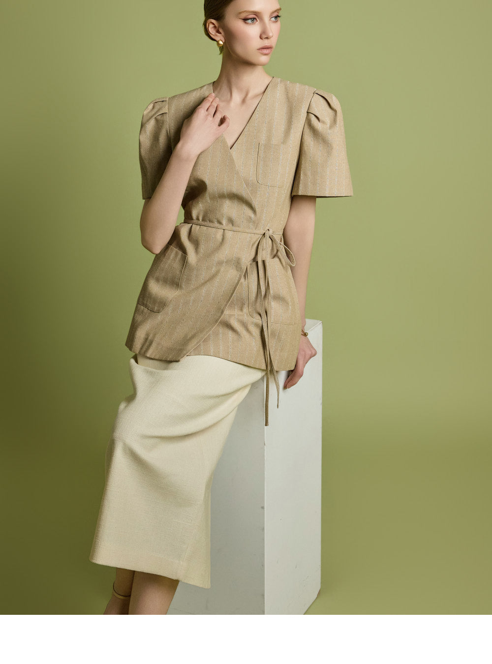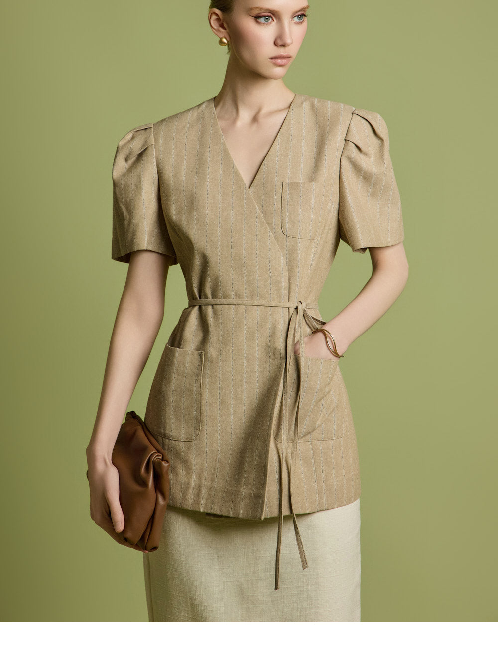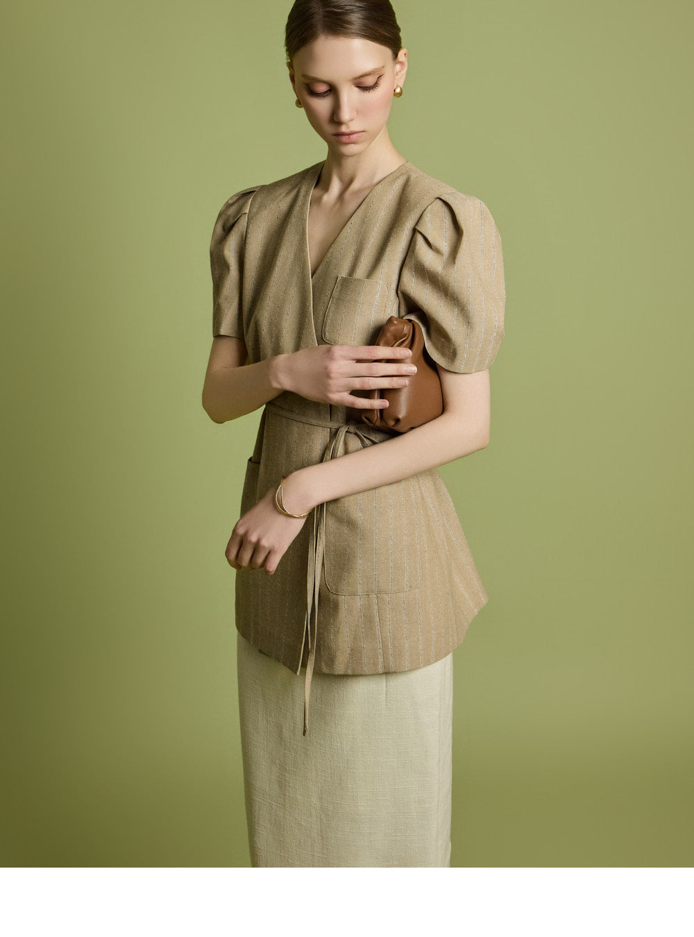 The slim fit and puffed shoulders create an elegant, feminine silhouette,
