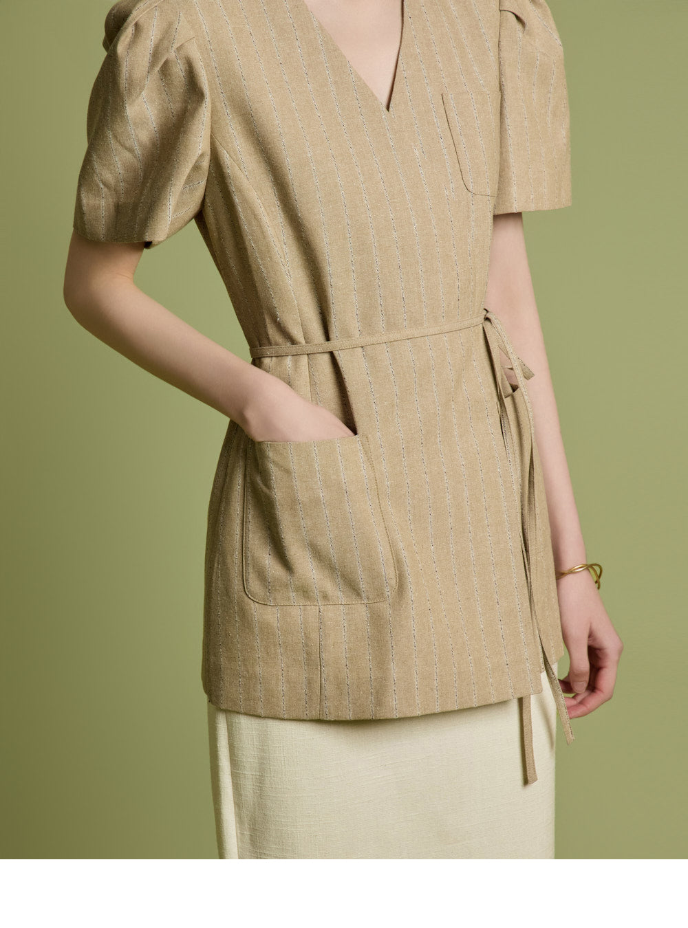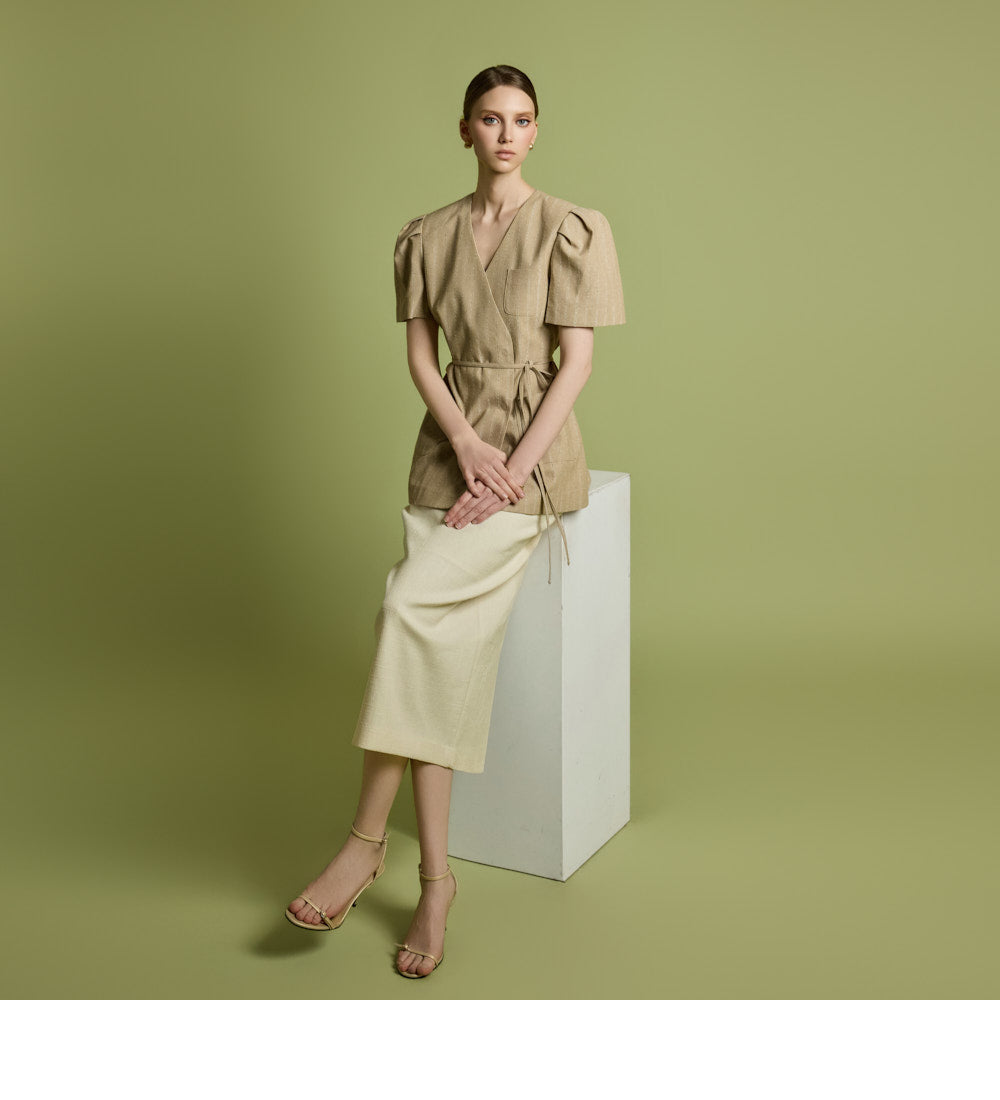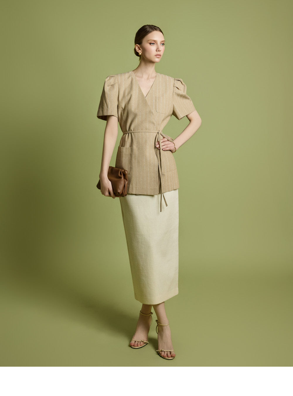 The slim fit and puffed shoulders create an elegant, feminine silhouette,