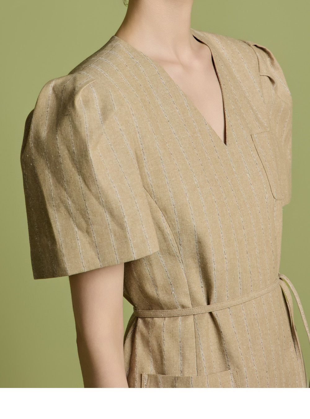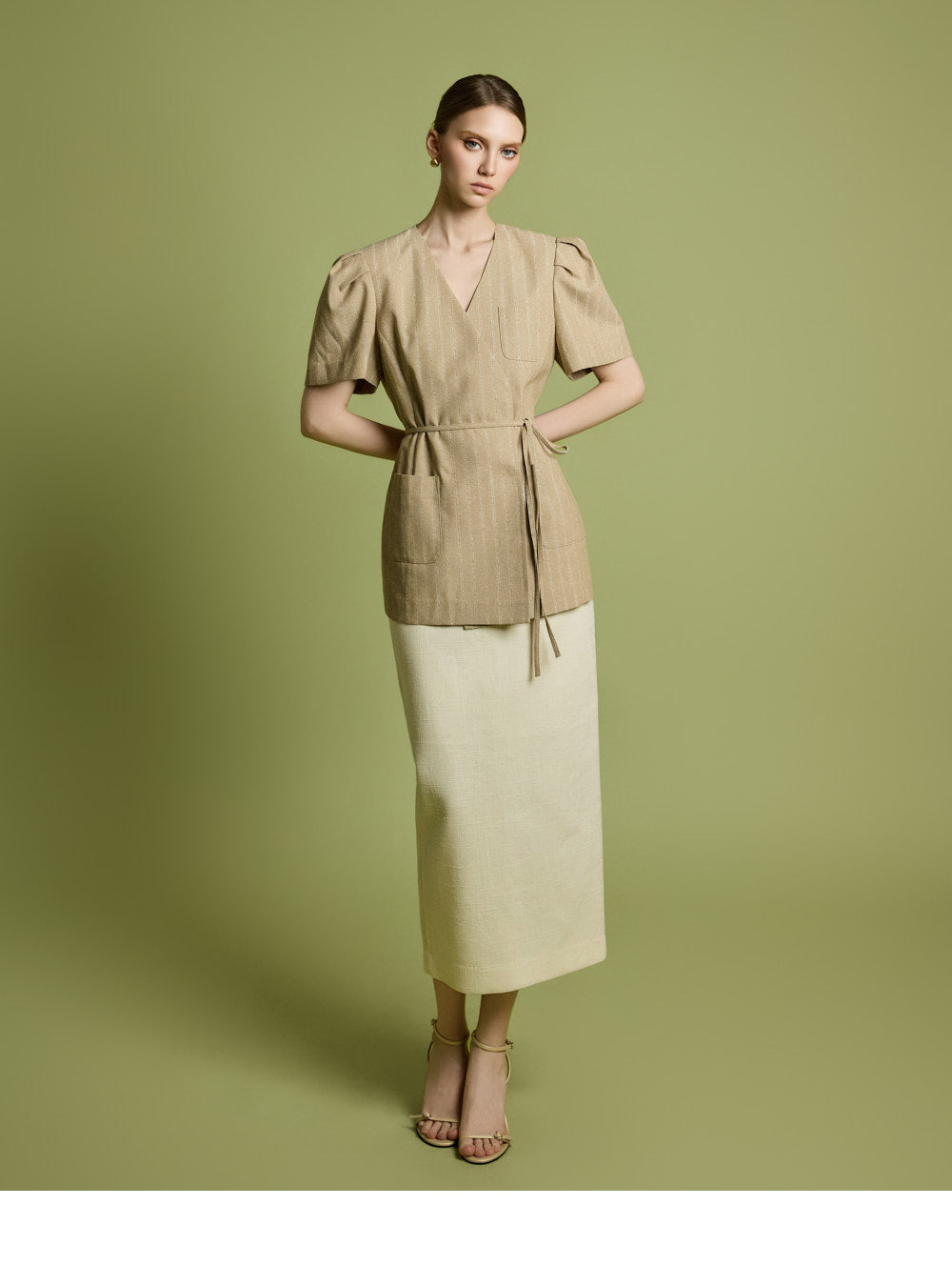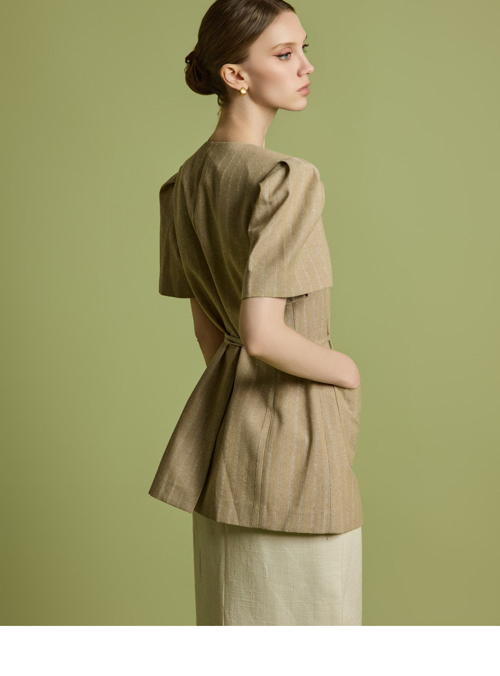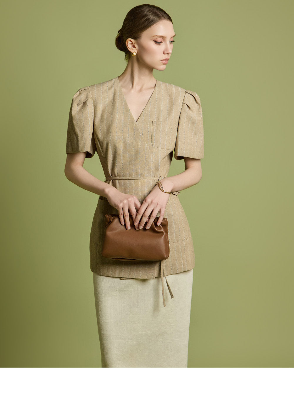 The slim fit and puffed shoulders create an elegant, feminine silhouette,