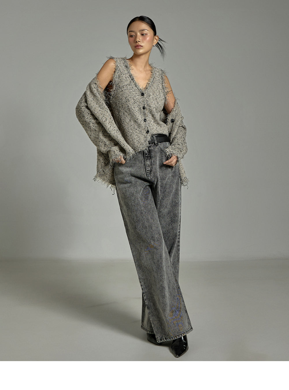 The cardigan features a front button closure and pockets on both sides for added practicality,