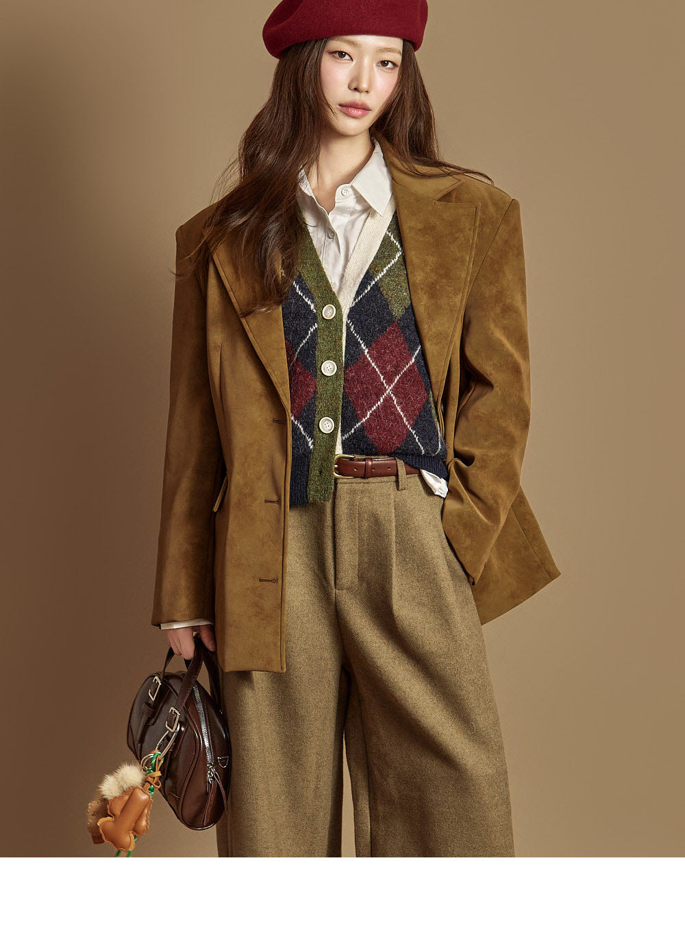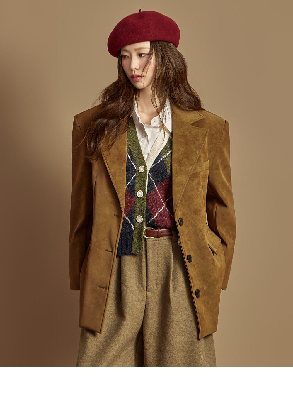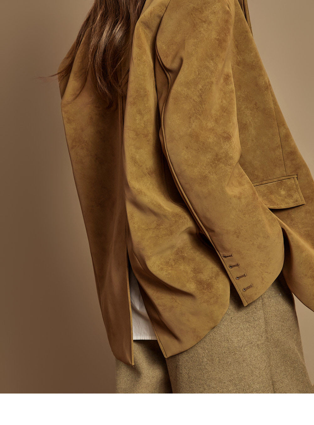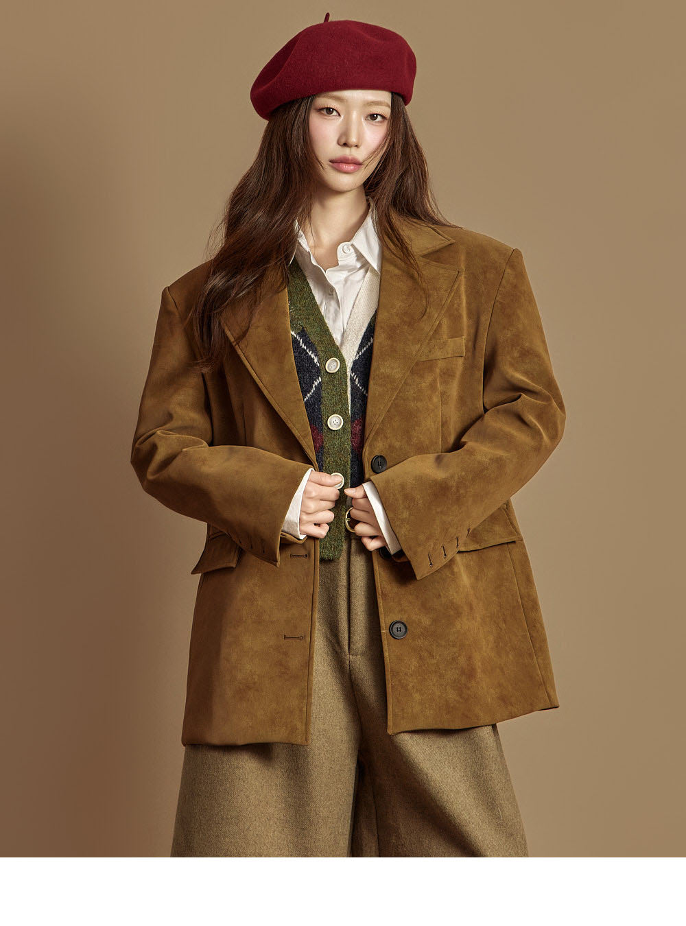 The oversized silhouette and moderate shoulder padding create a structured fit,