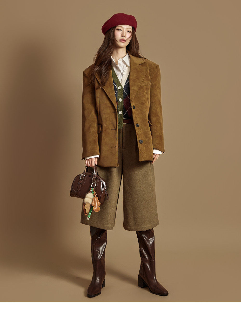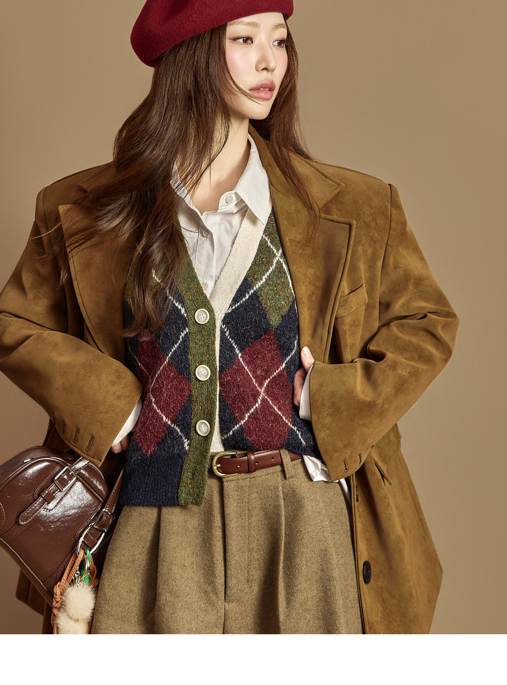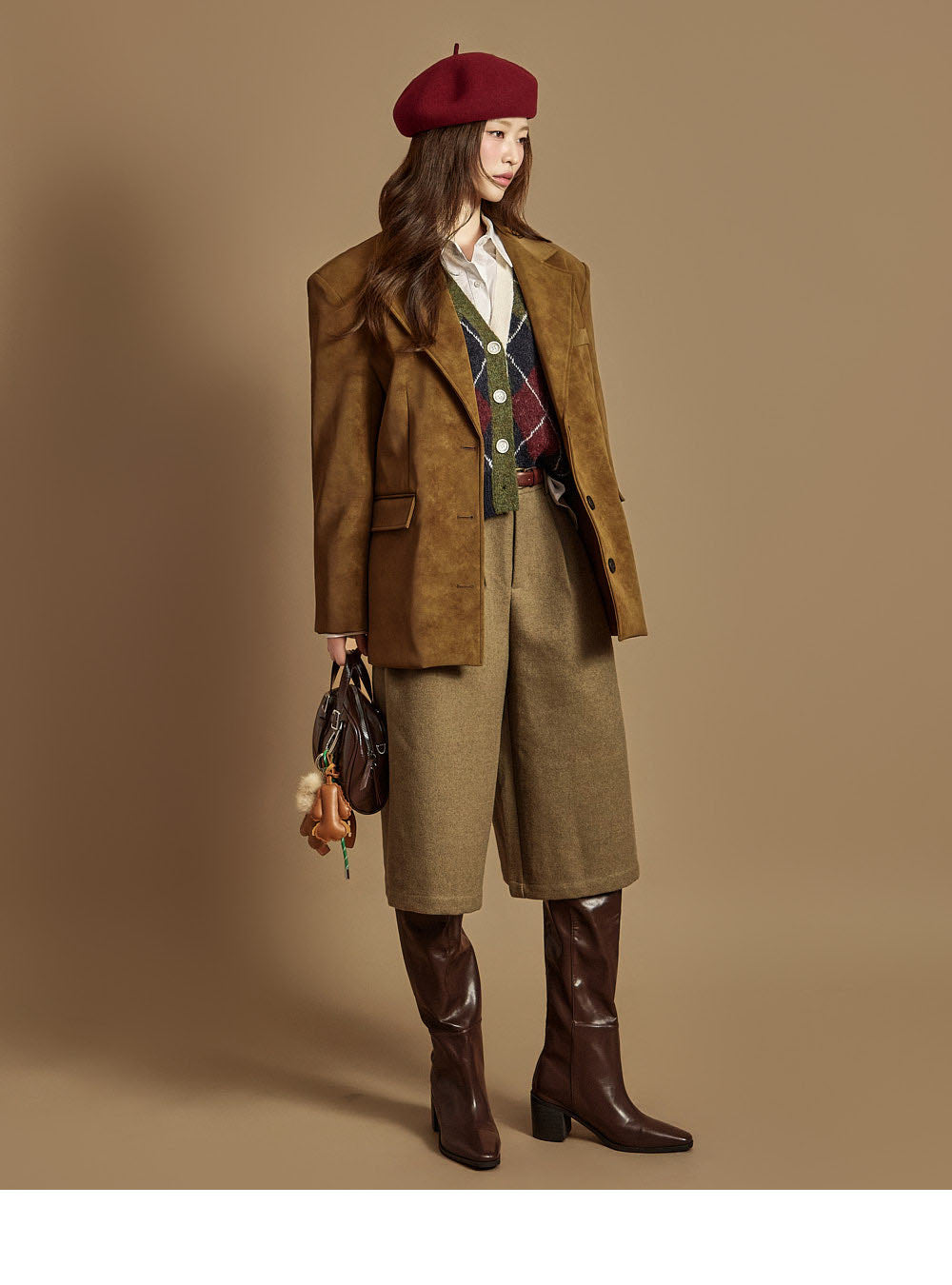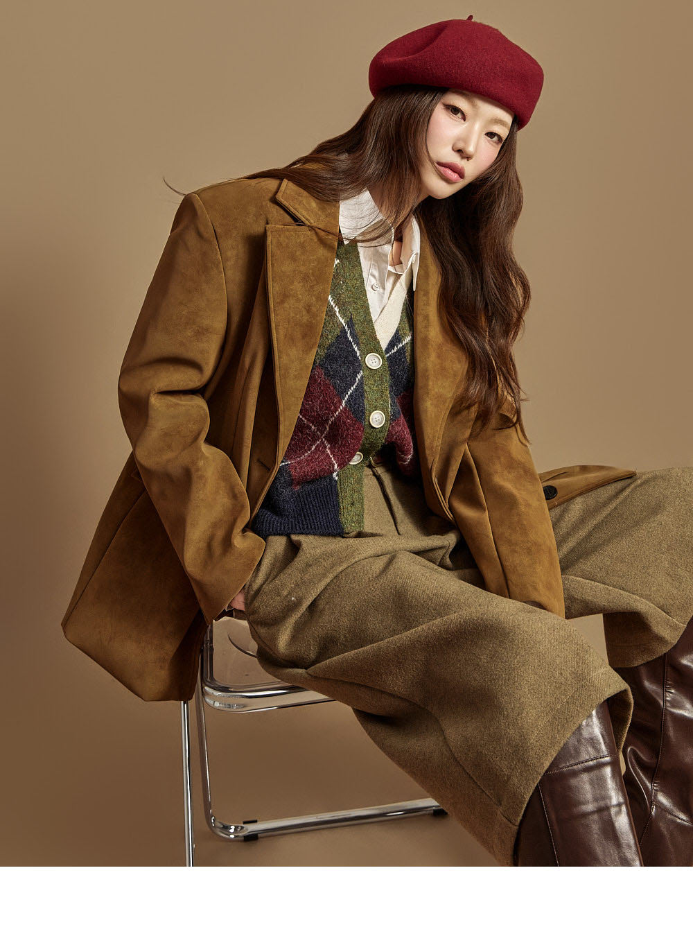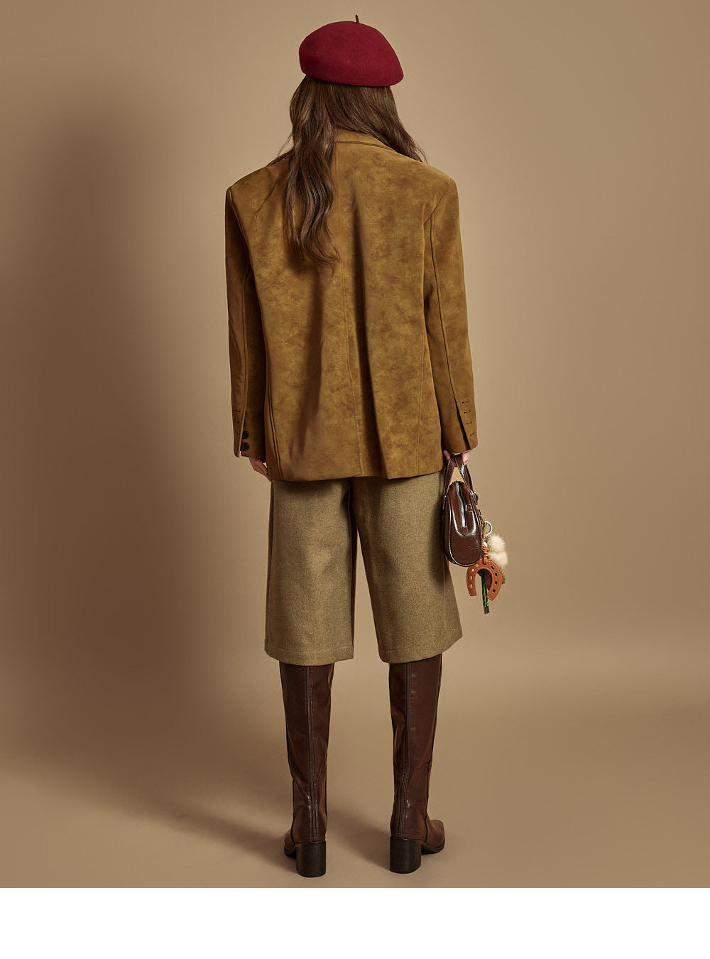 The oversized silhouette and moderate shoulder padding create a structured fit,