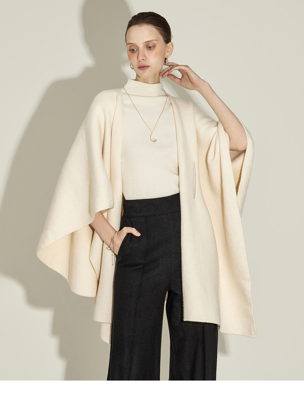 This cape knit shawl exudes a feminine vibe.