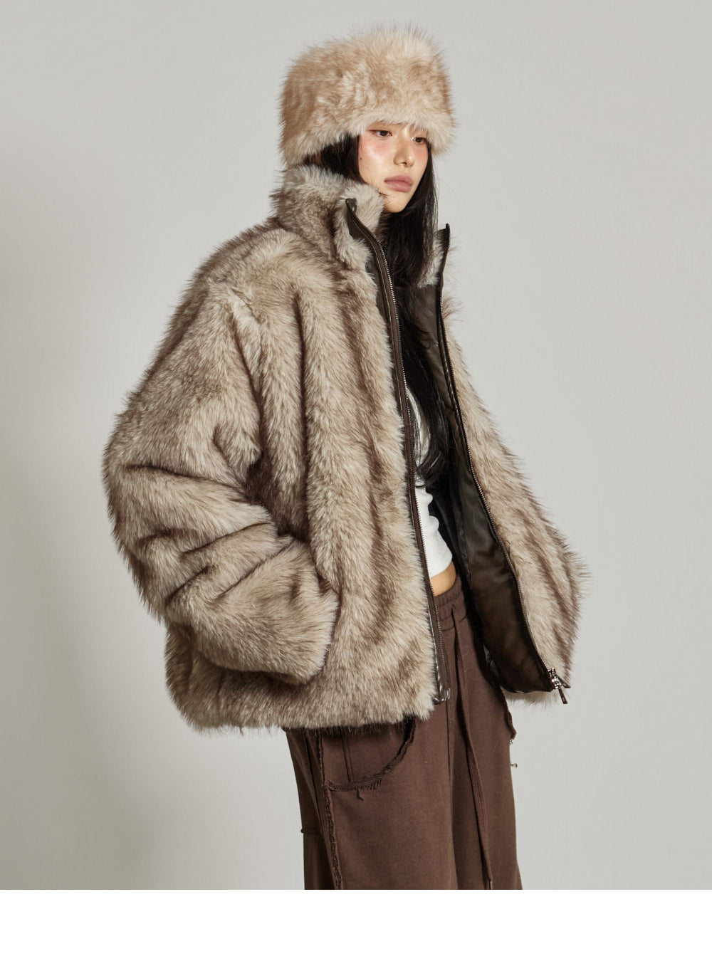 Made from polyester fur, it offers lightweight yet warm insulation,