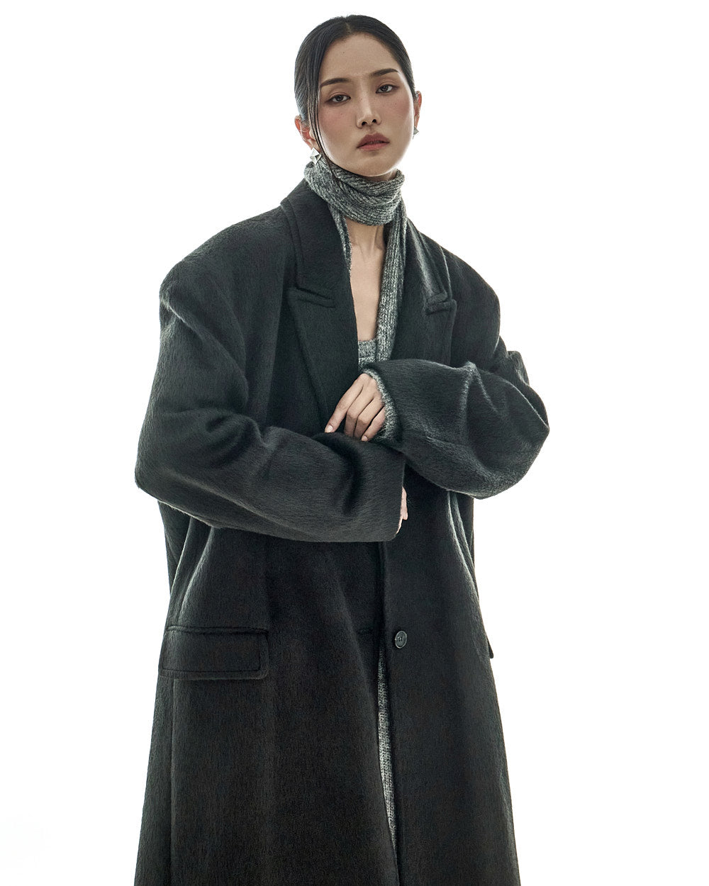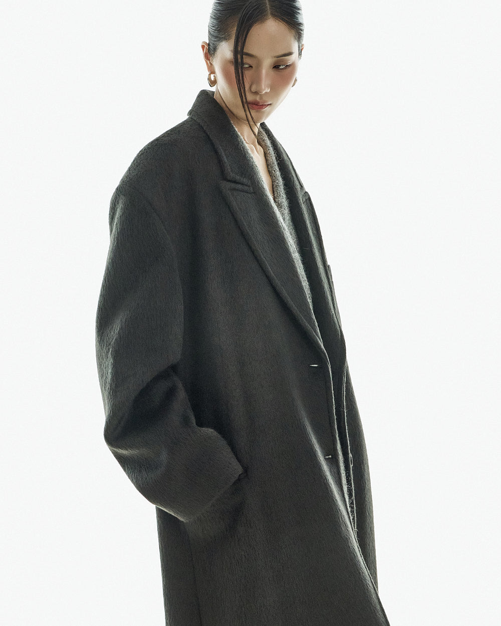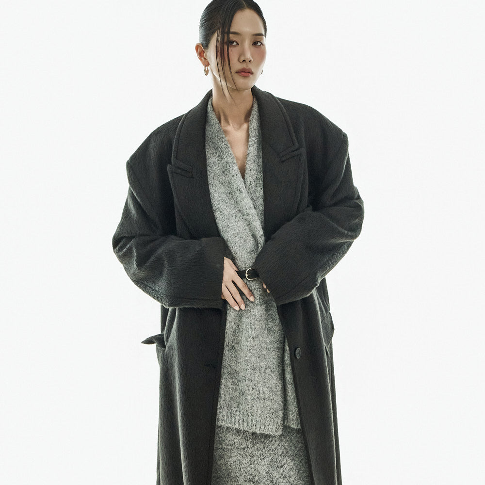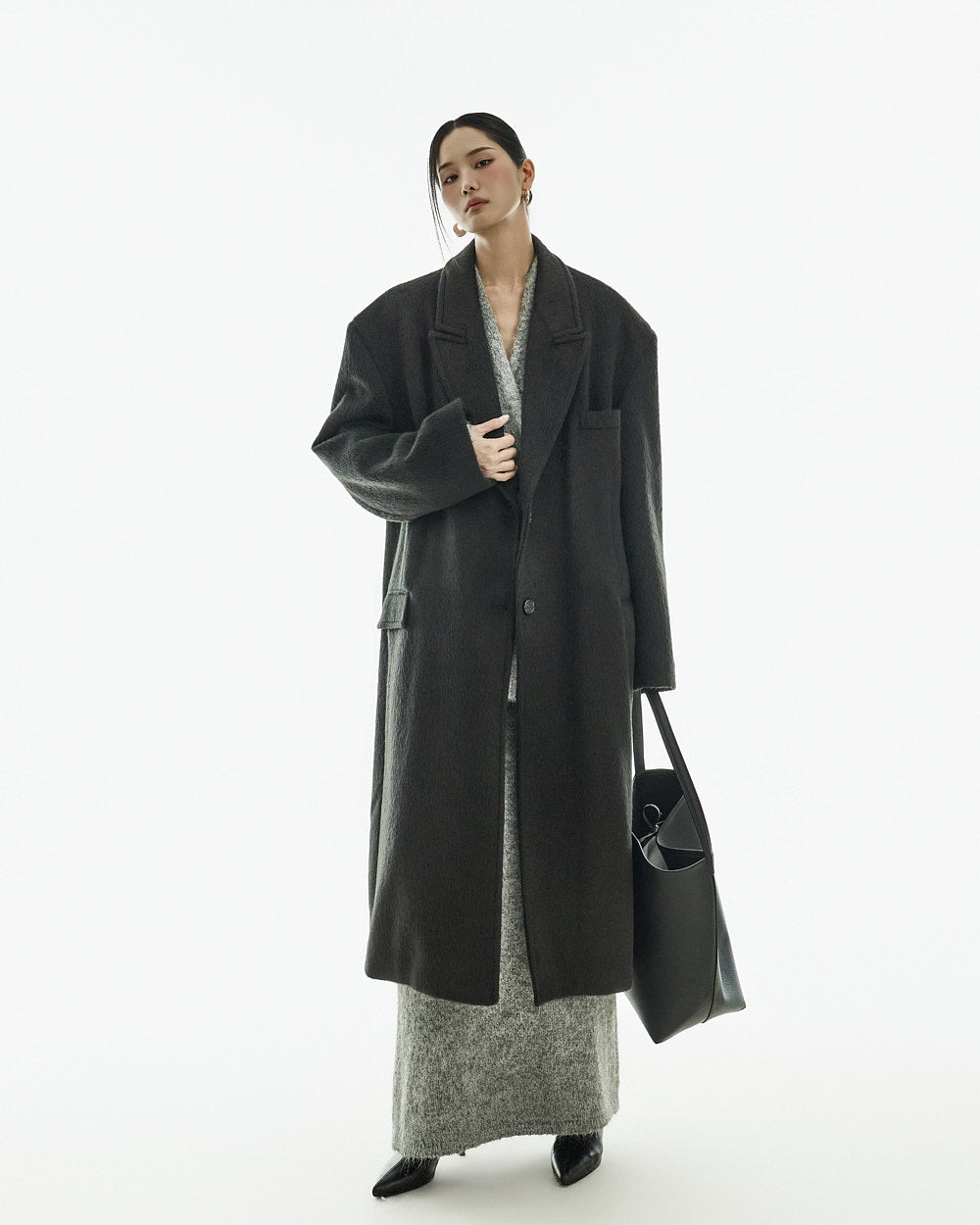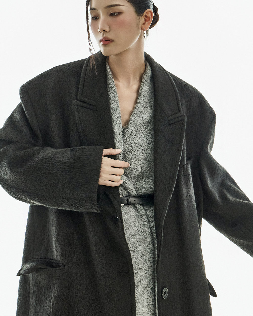 The oversized silhouette, with its tailored collar and shoulder pads,