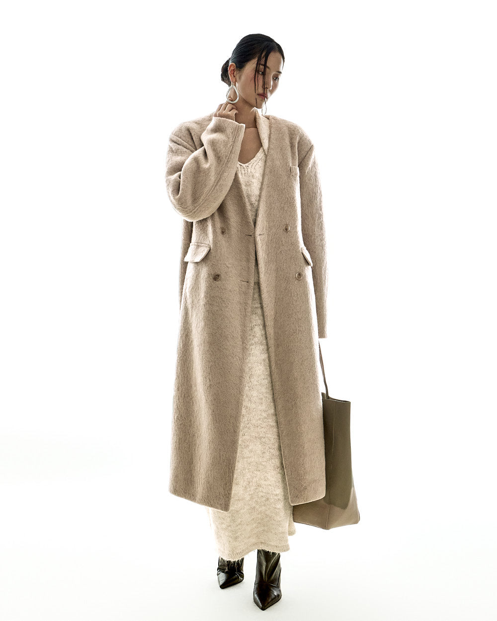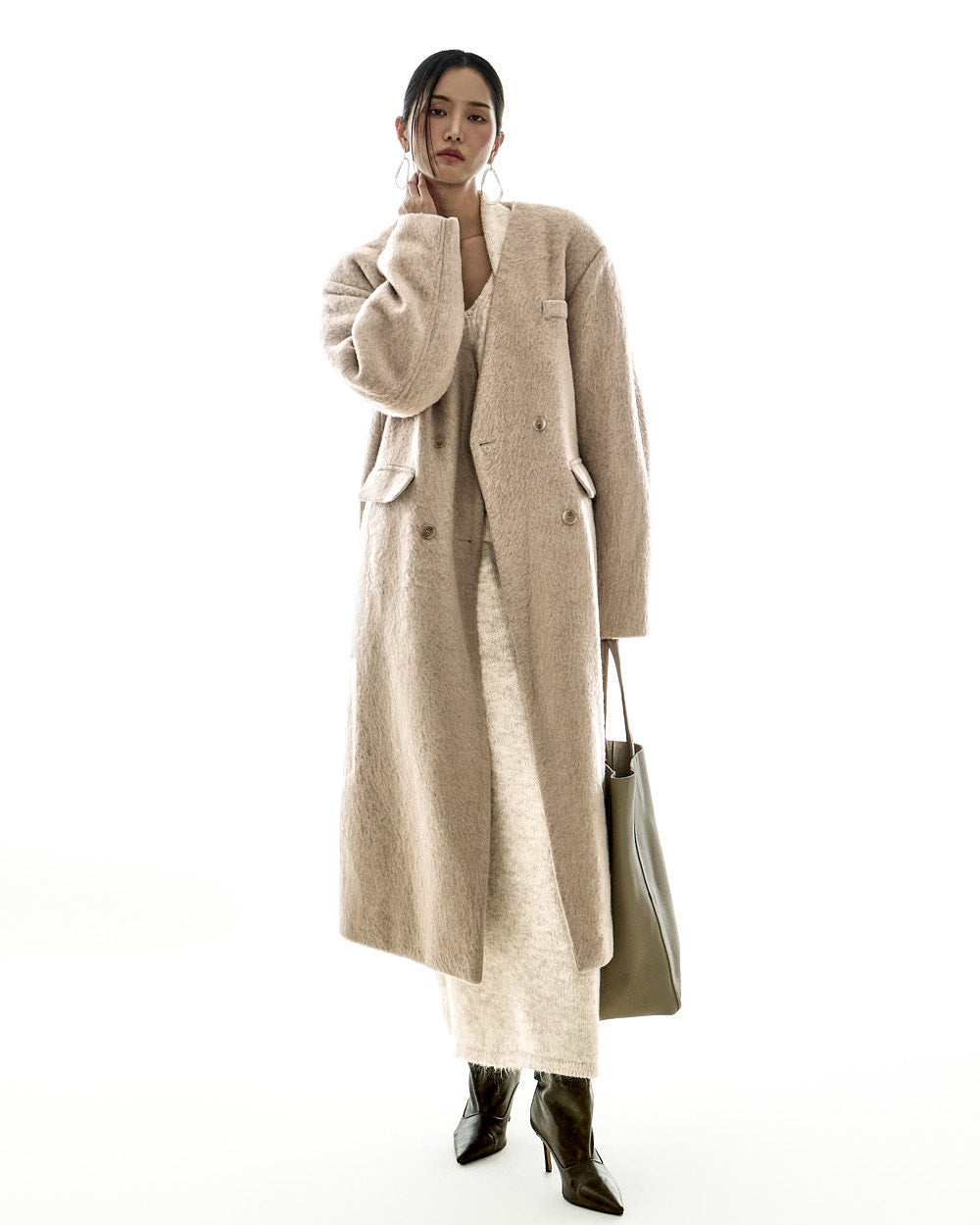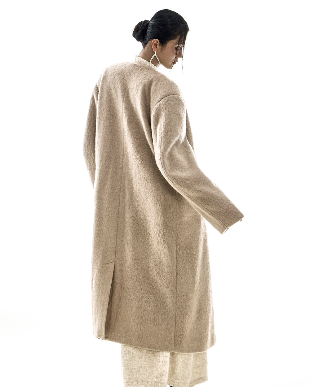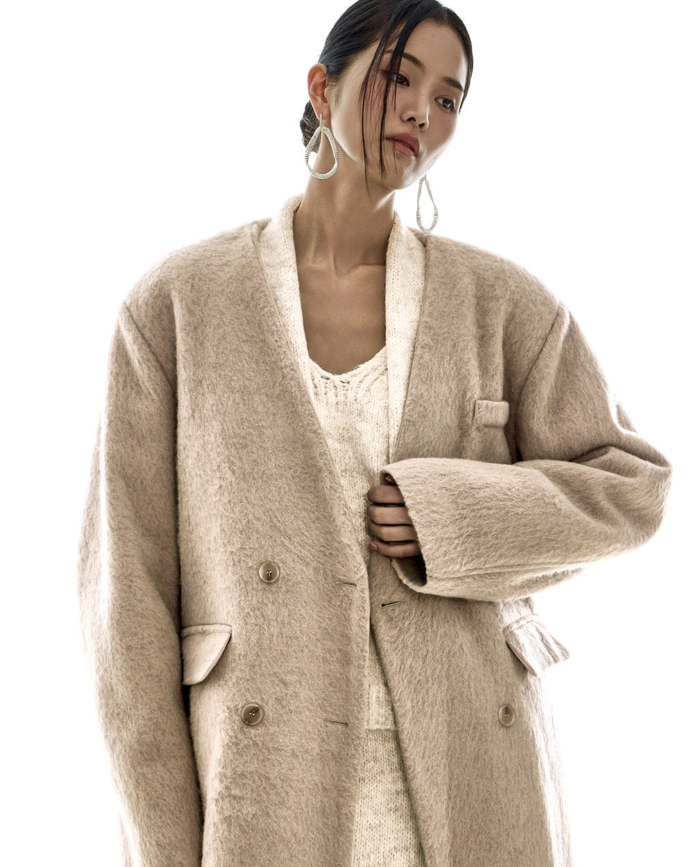This collarless double-breasted coat has a minimalist vibe.