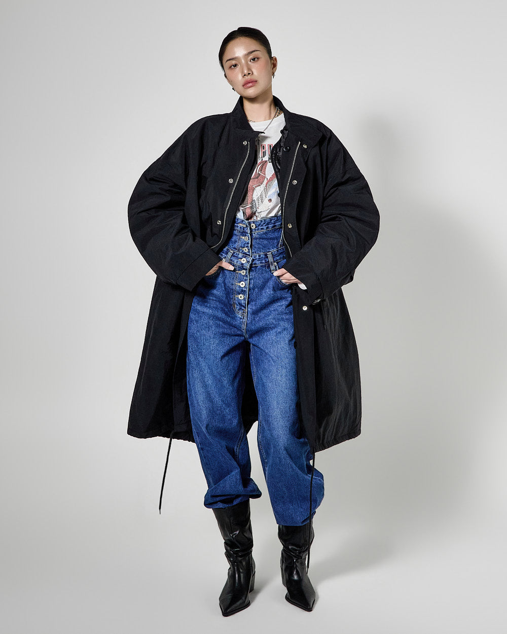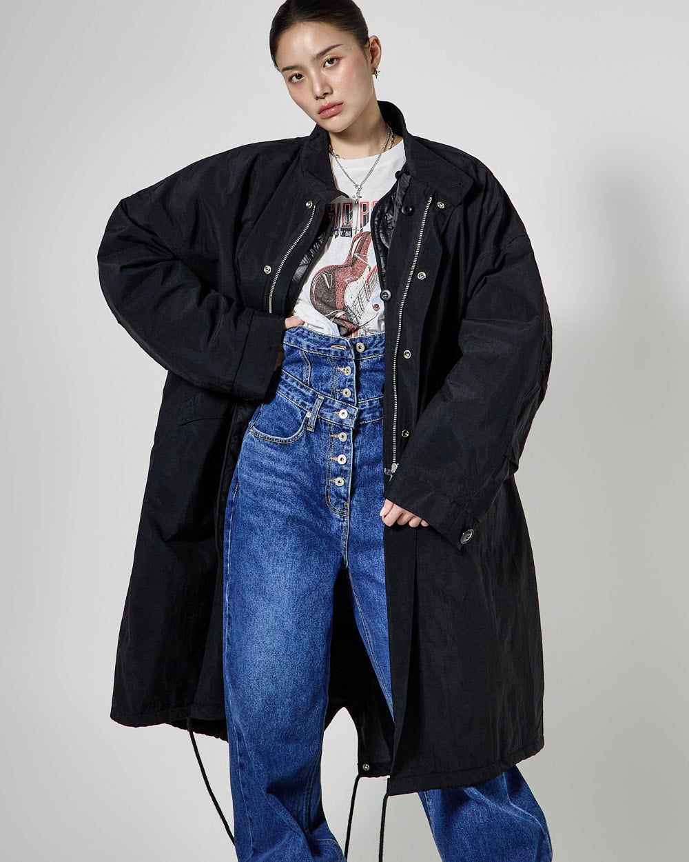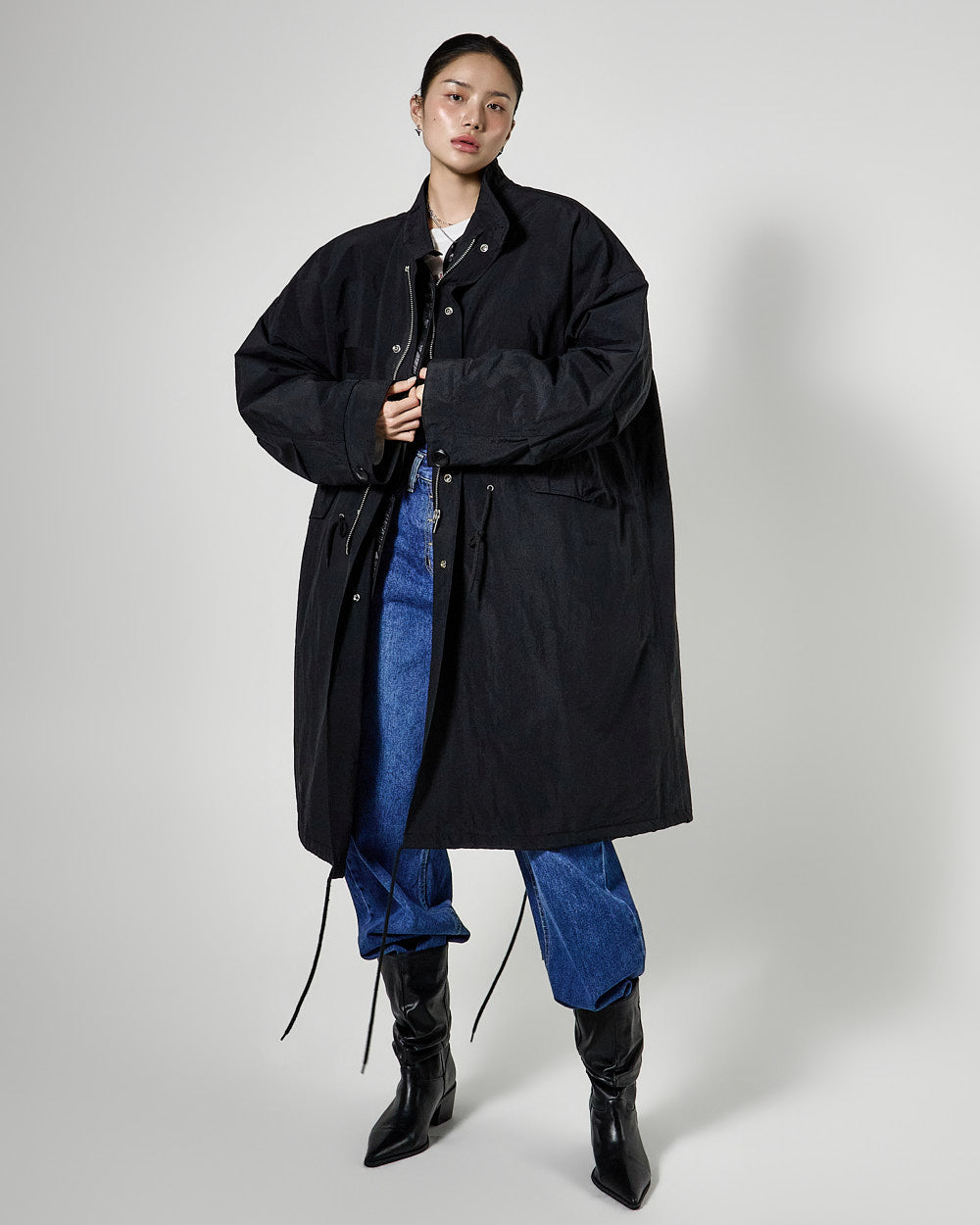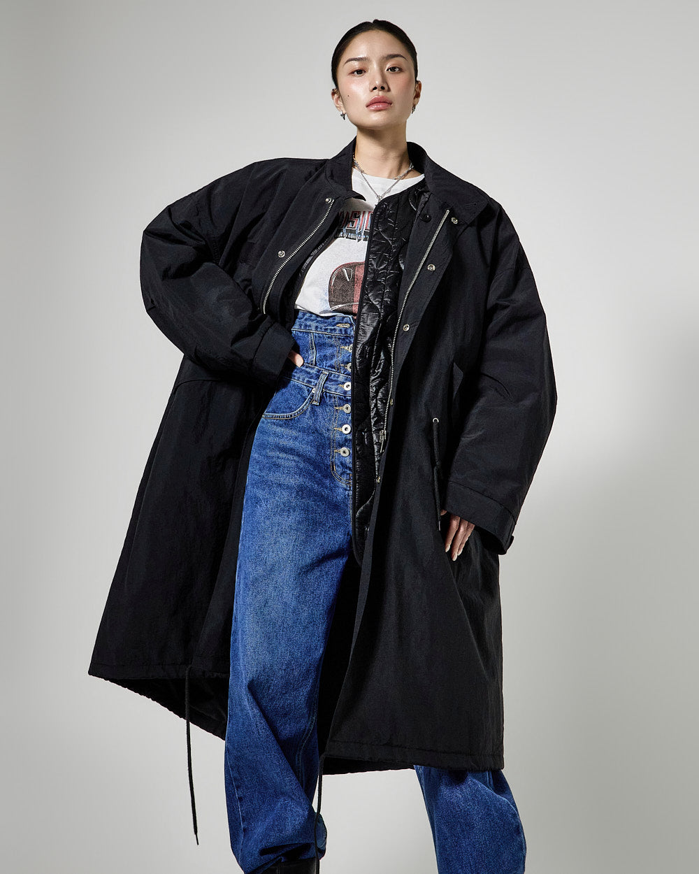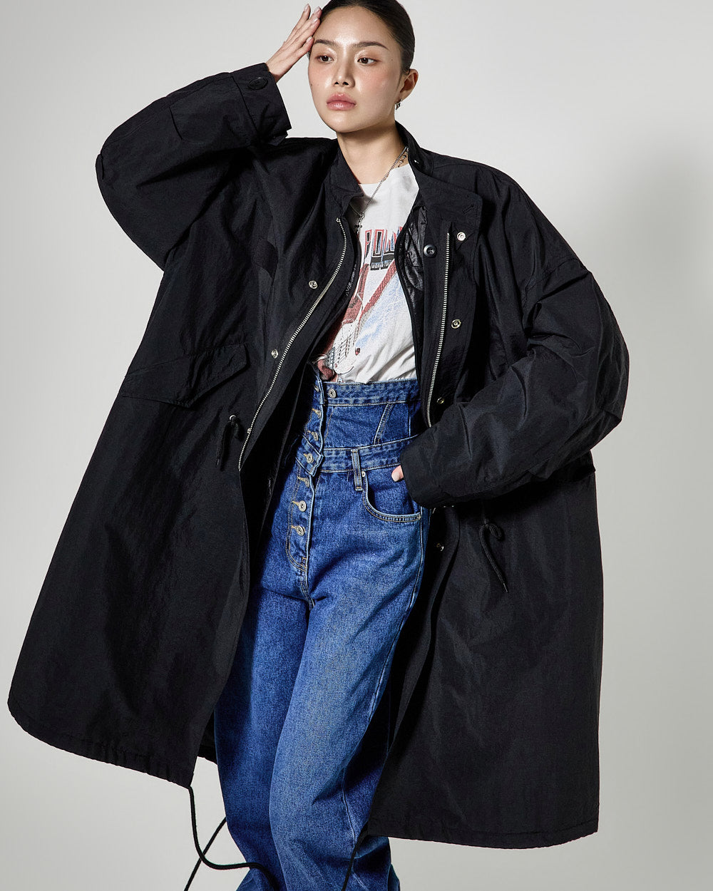 The long length and oversized silhouette of the field jacket