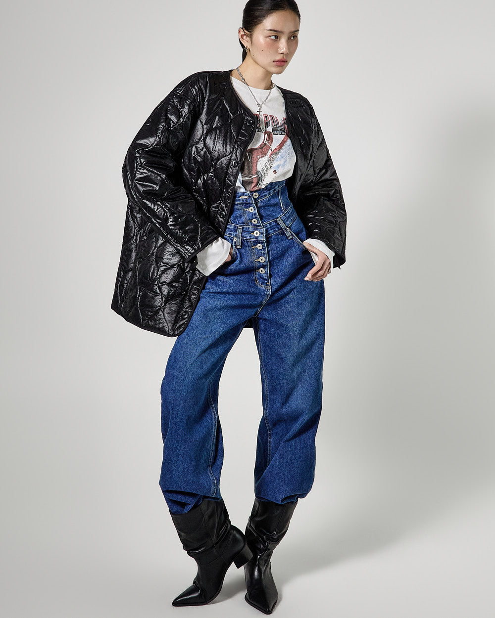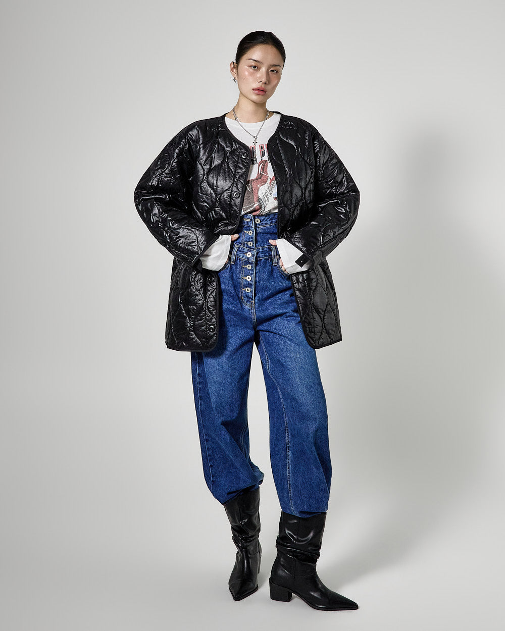 Denim (jeans, coated jeans) and other dark-dyed garments may experience color fading or transfer. Please take extra care before the first wash and while wearing them.