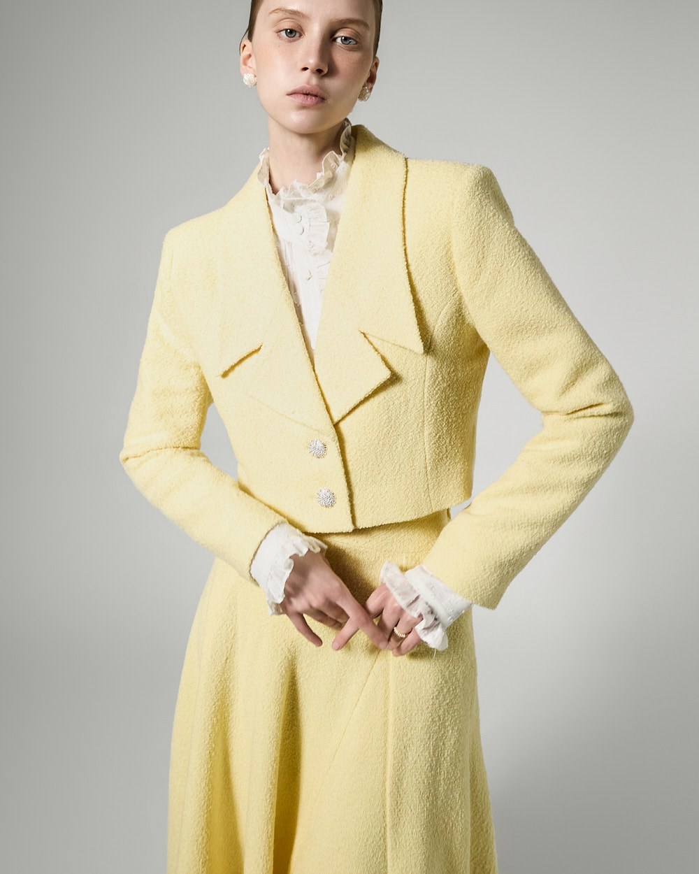 This tweed jacket exudes a classic feminine vibe.