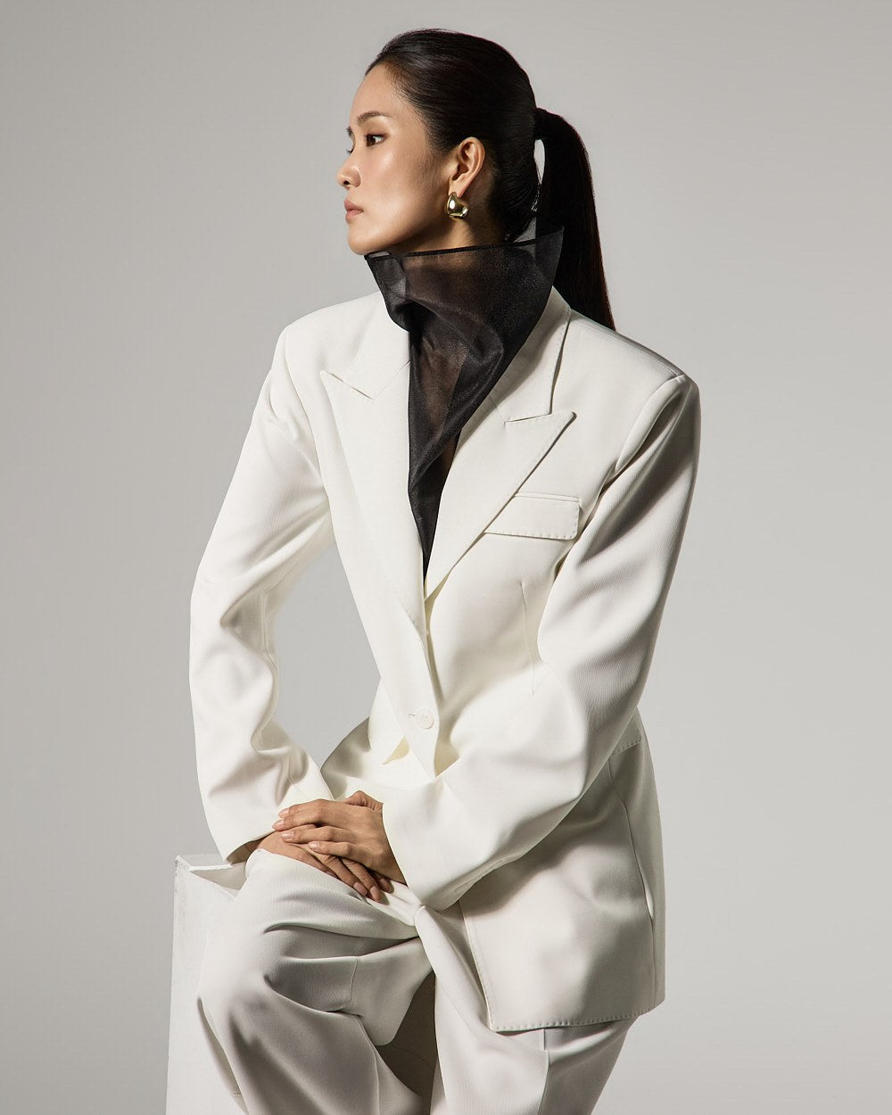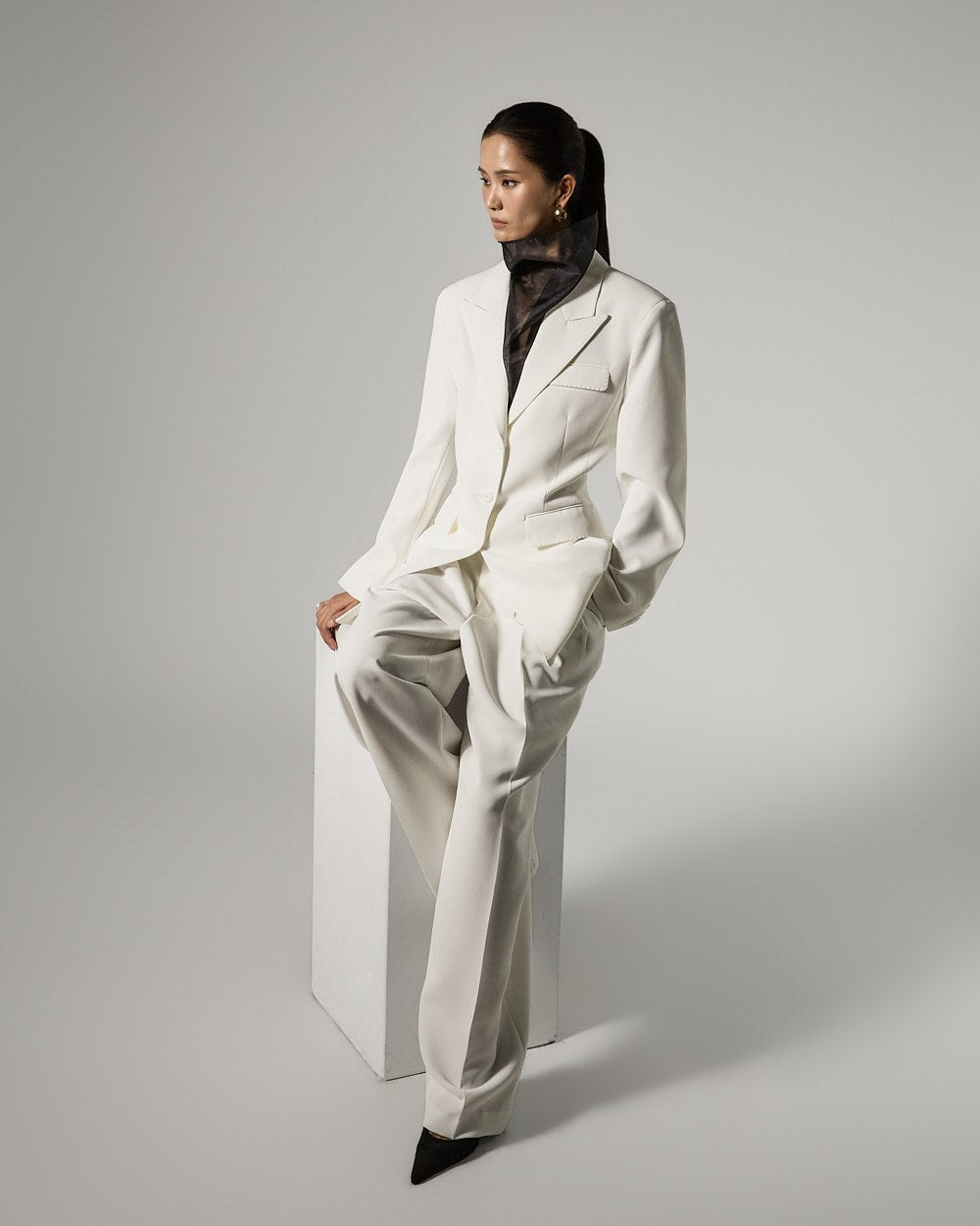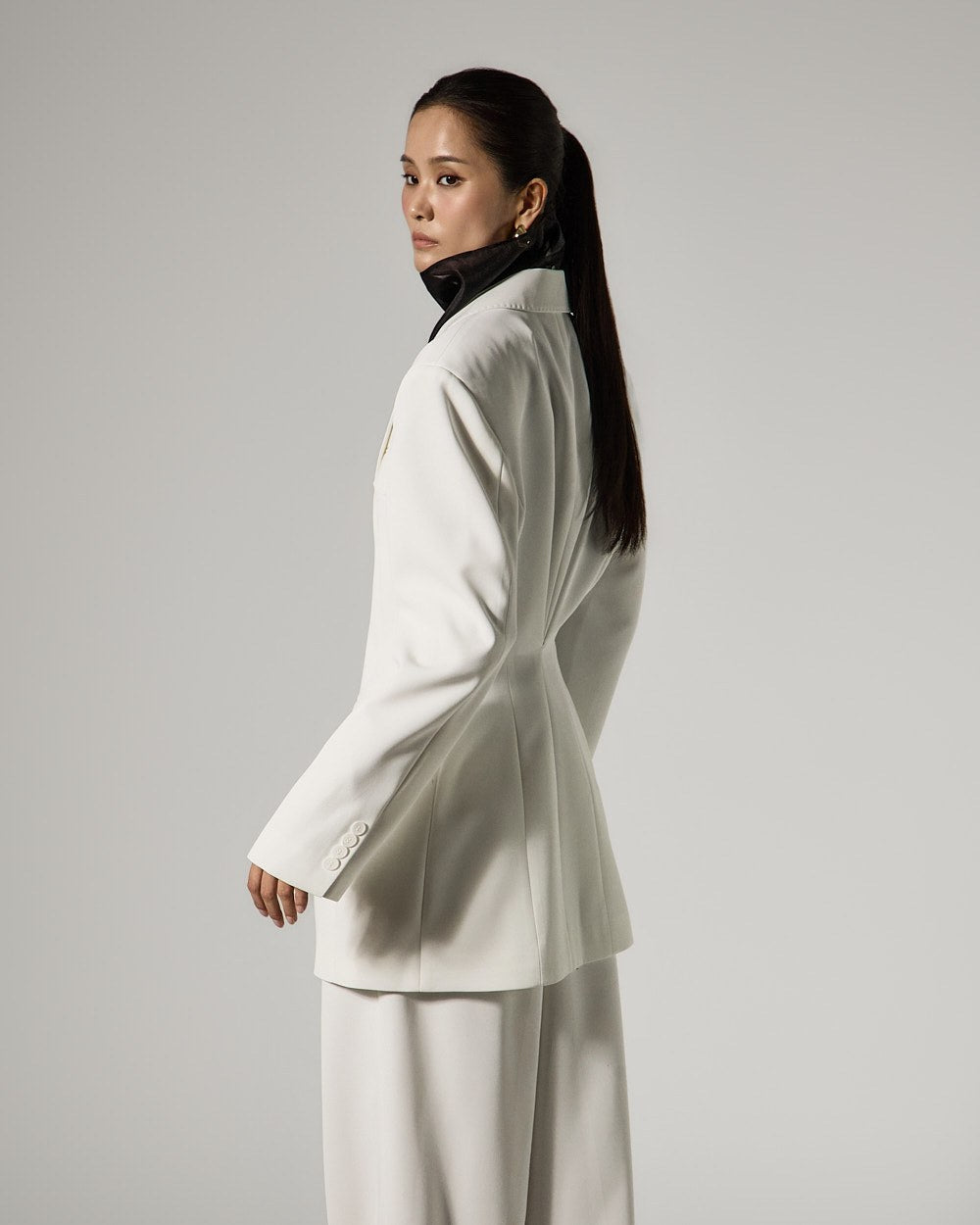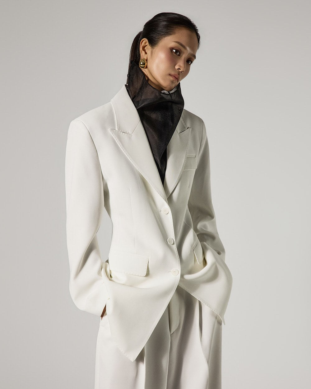The slim-fit silhouette neatly defines the body line, while the added tailored lines create a sophisticated atmosphere.