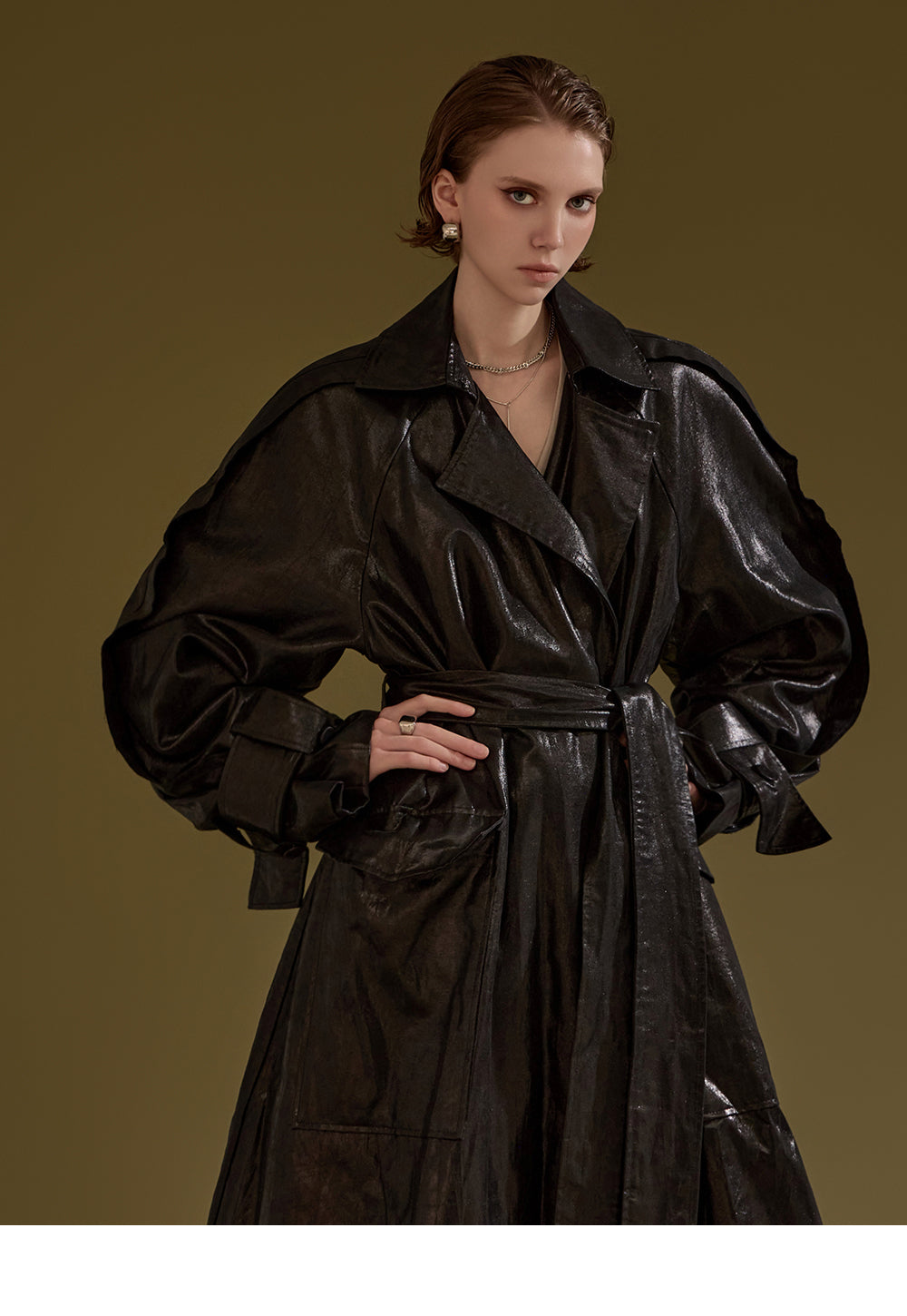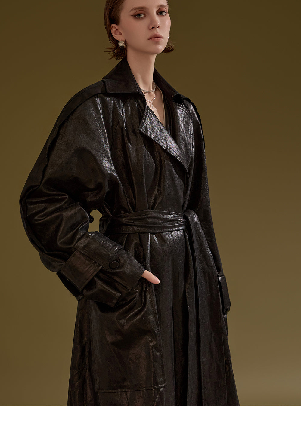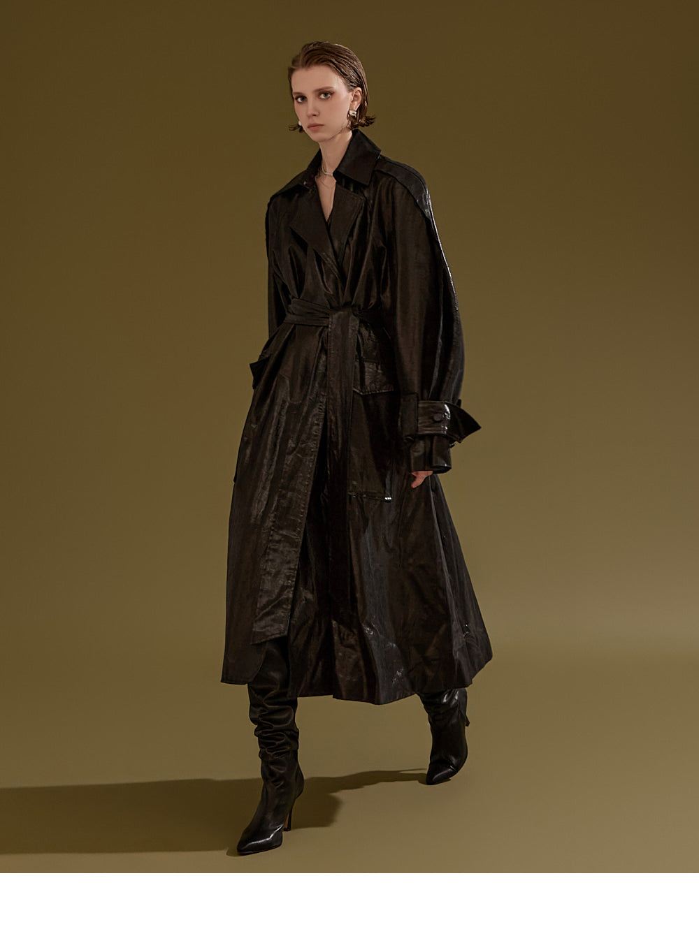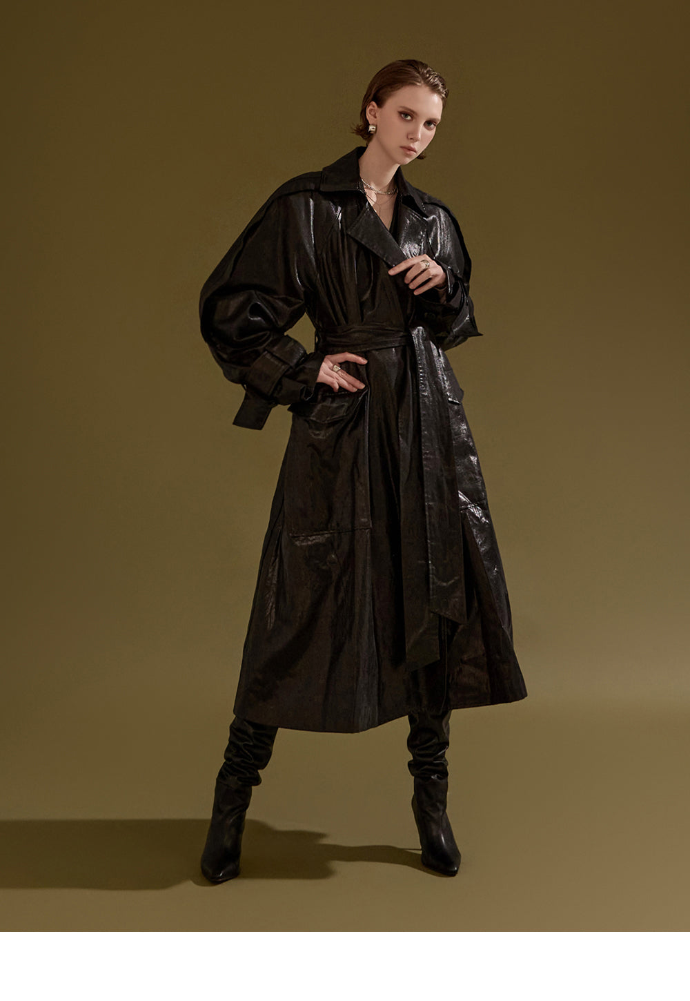 This leather trench coat exudes a unique style.
