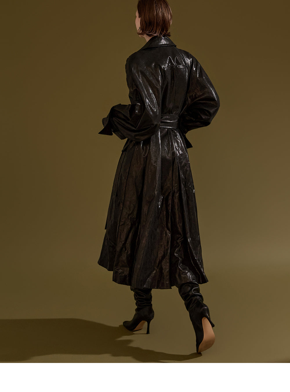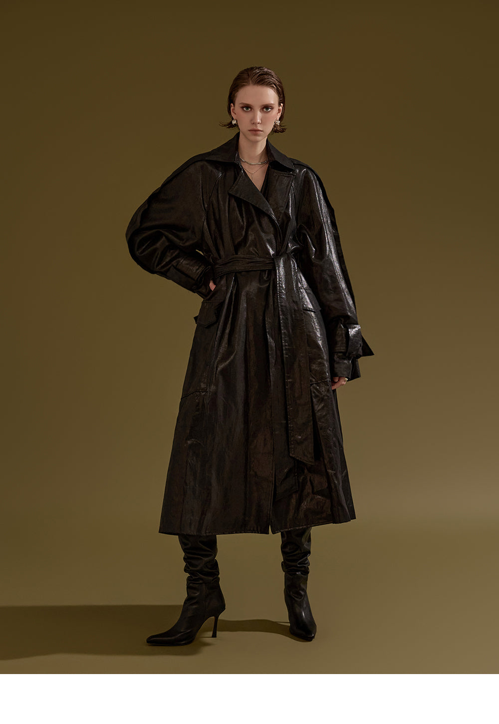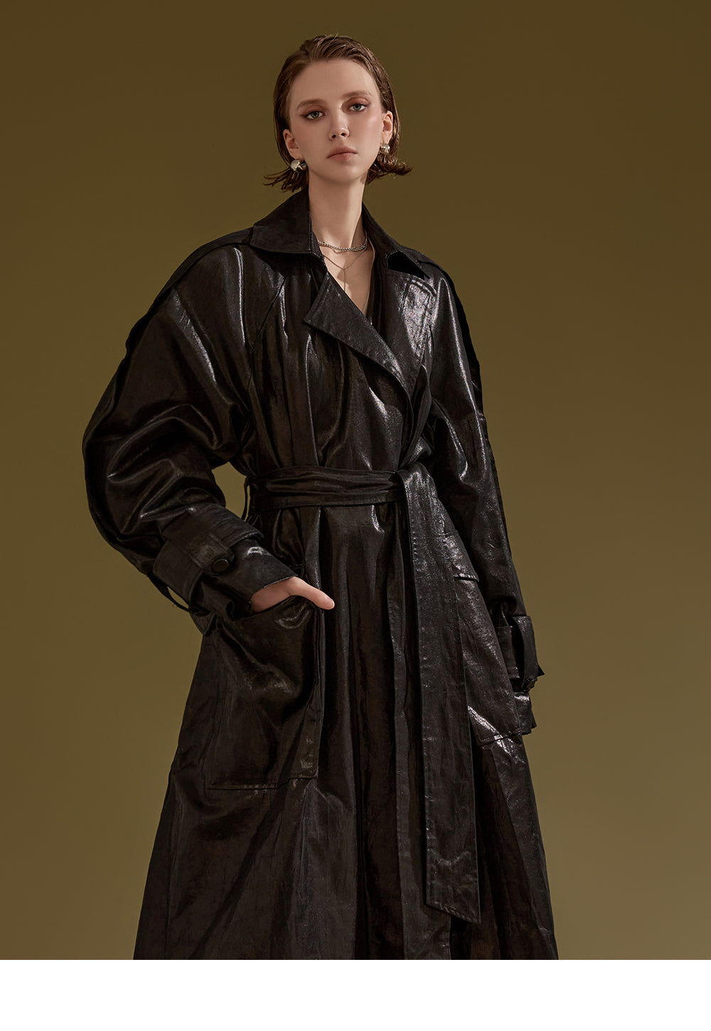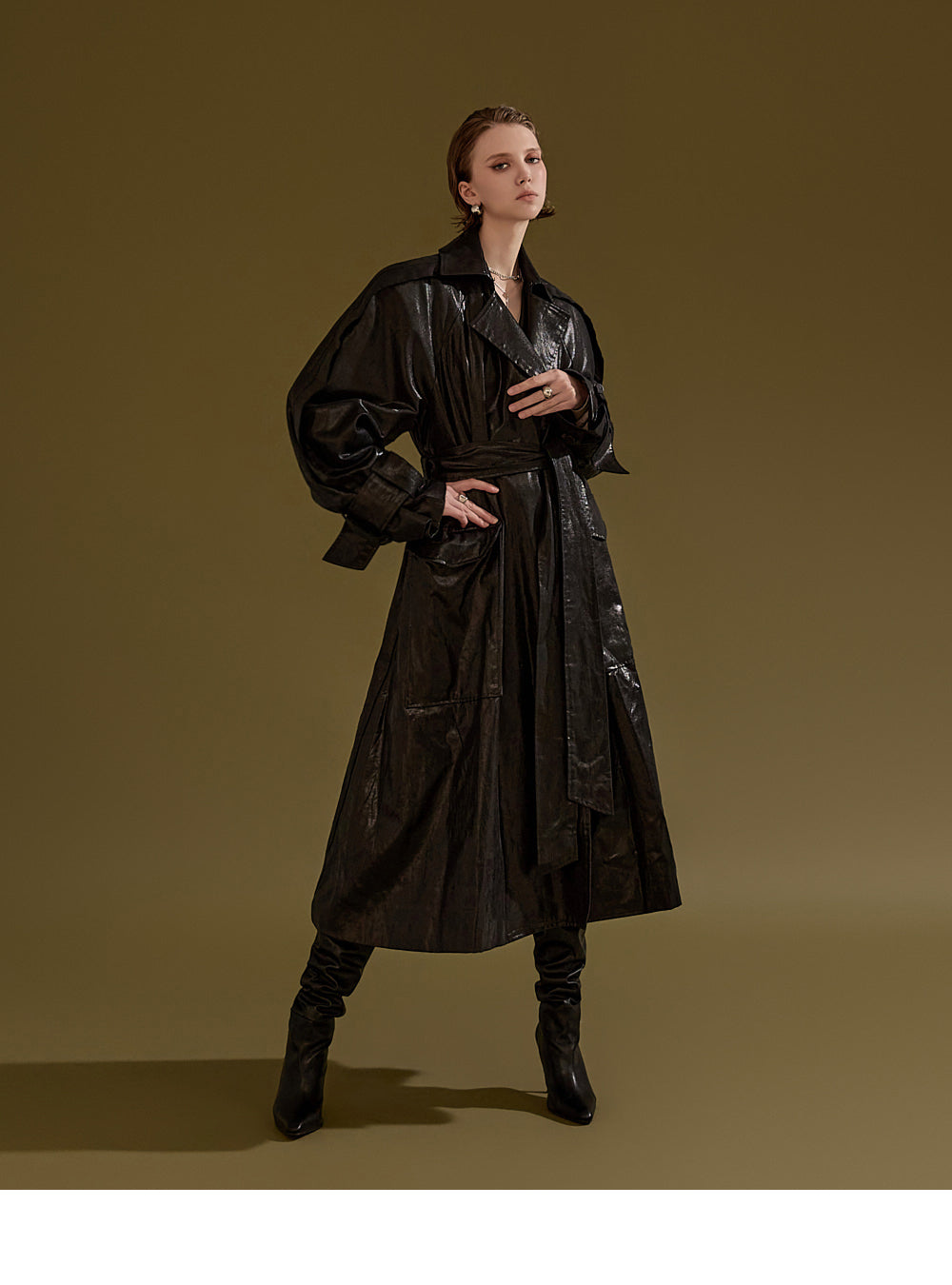 This leather trench coat exudes a unique style.