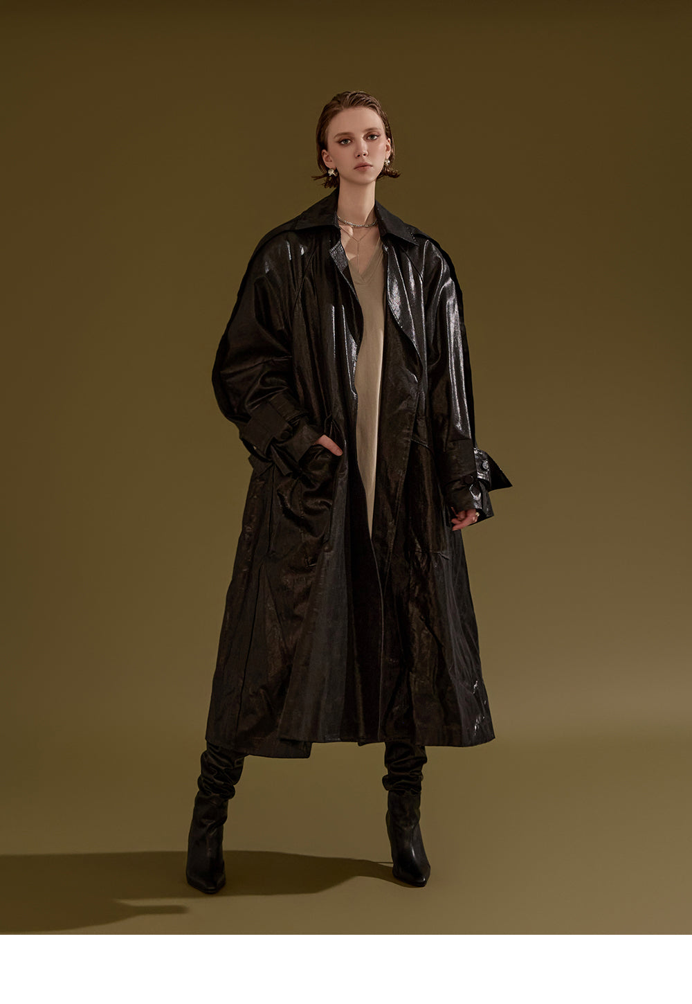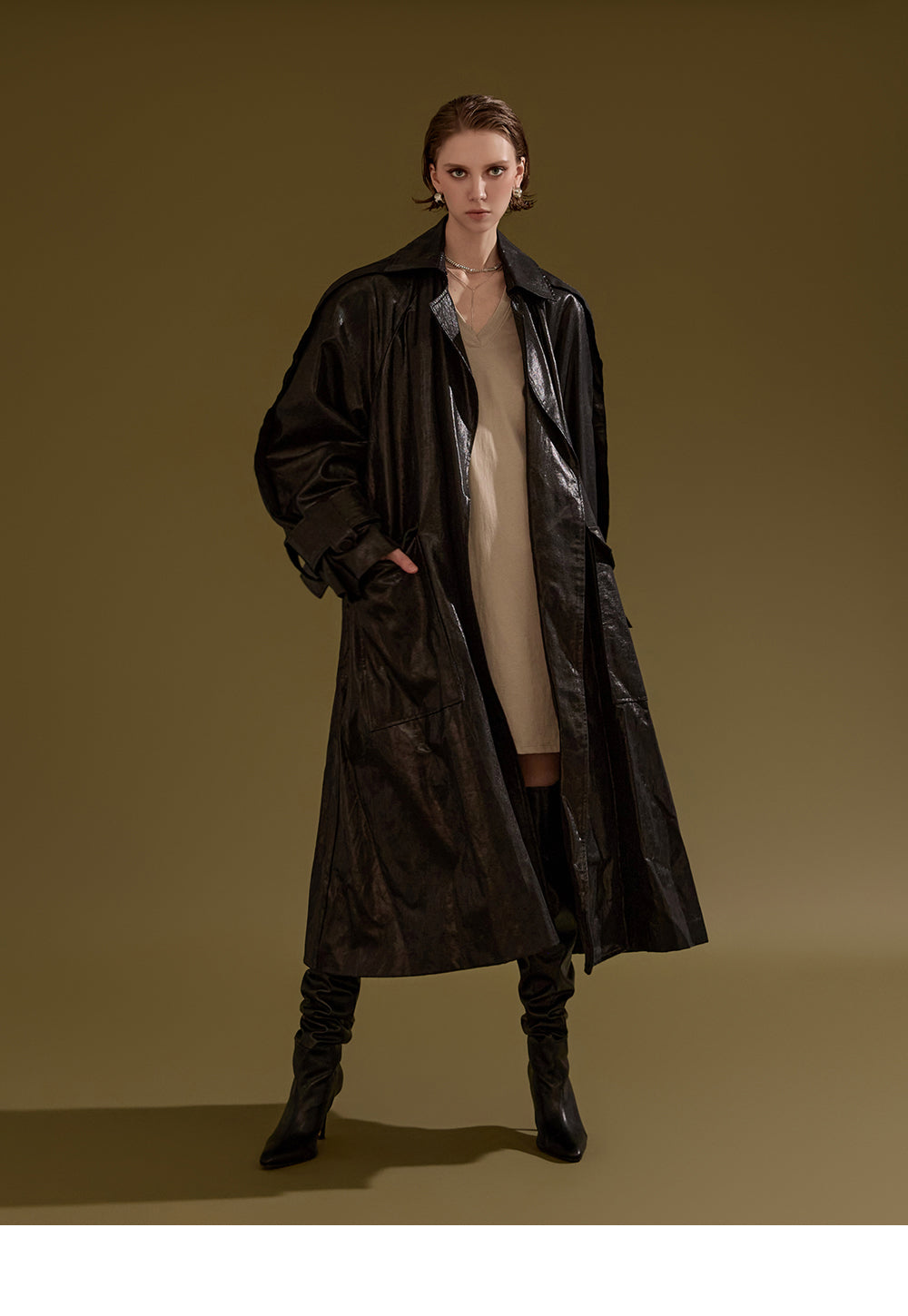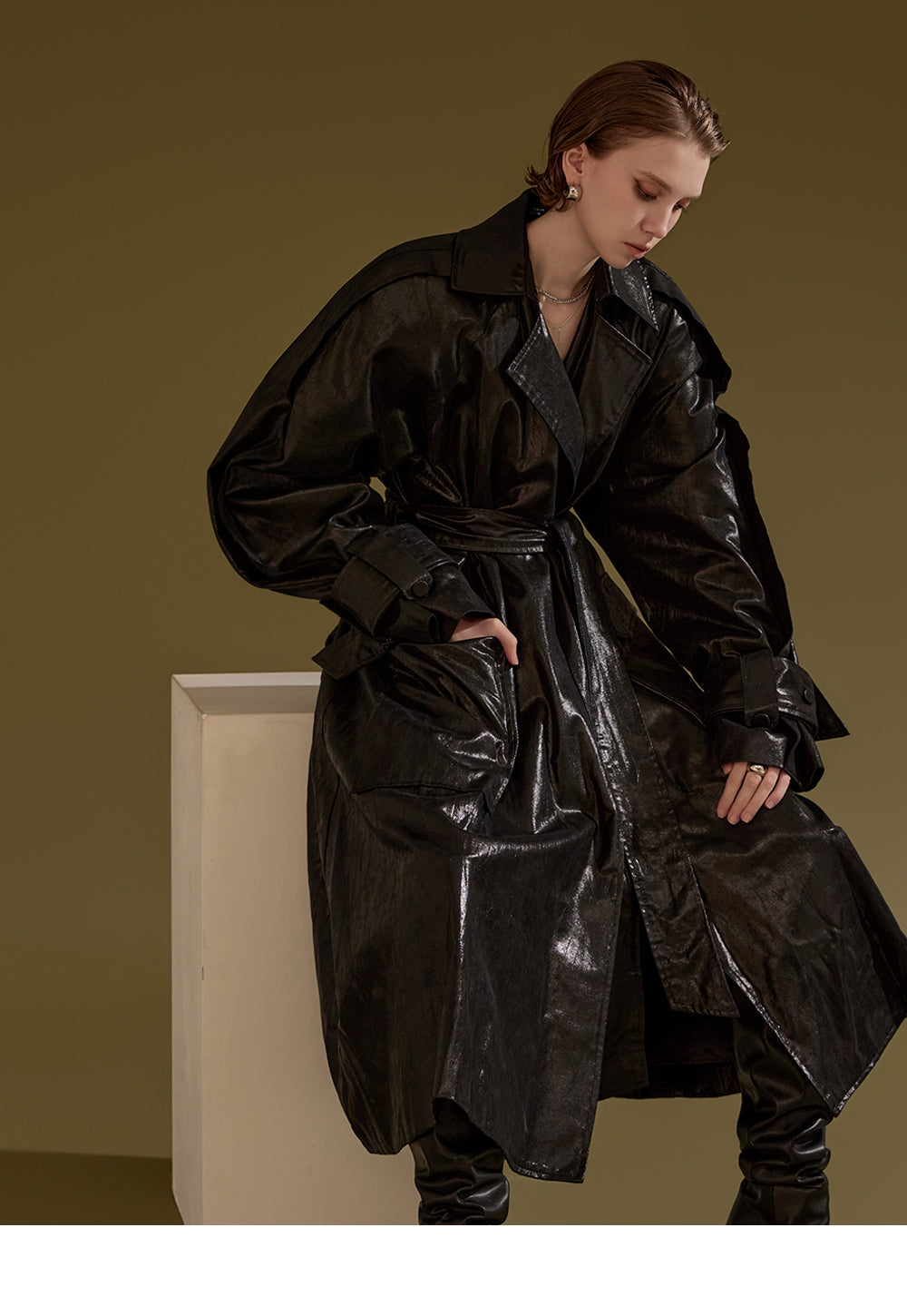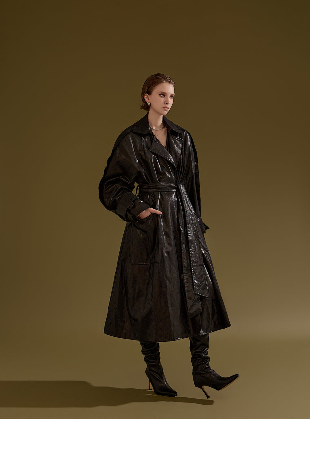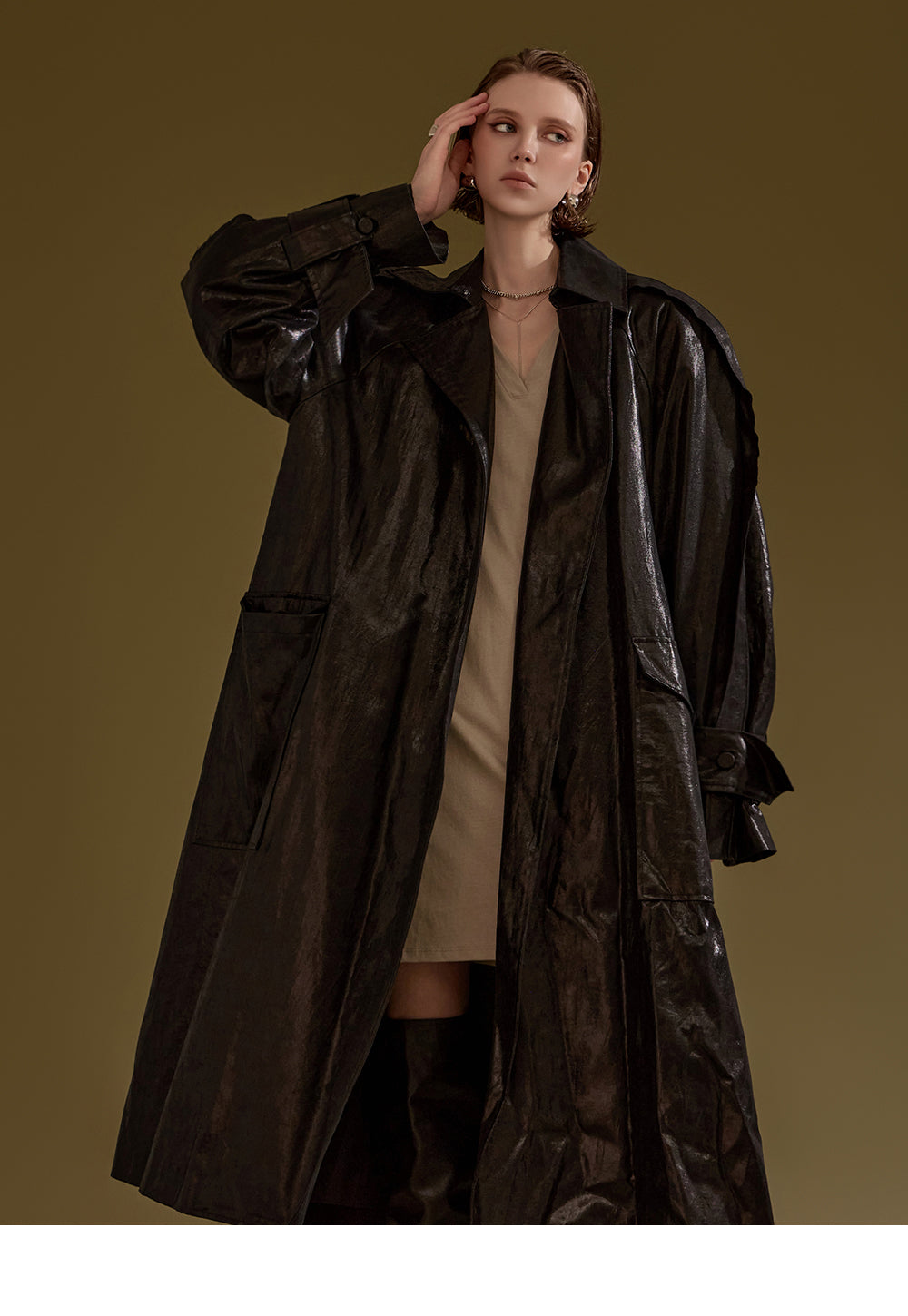 This leather trench coat exudes a unique style.