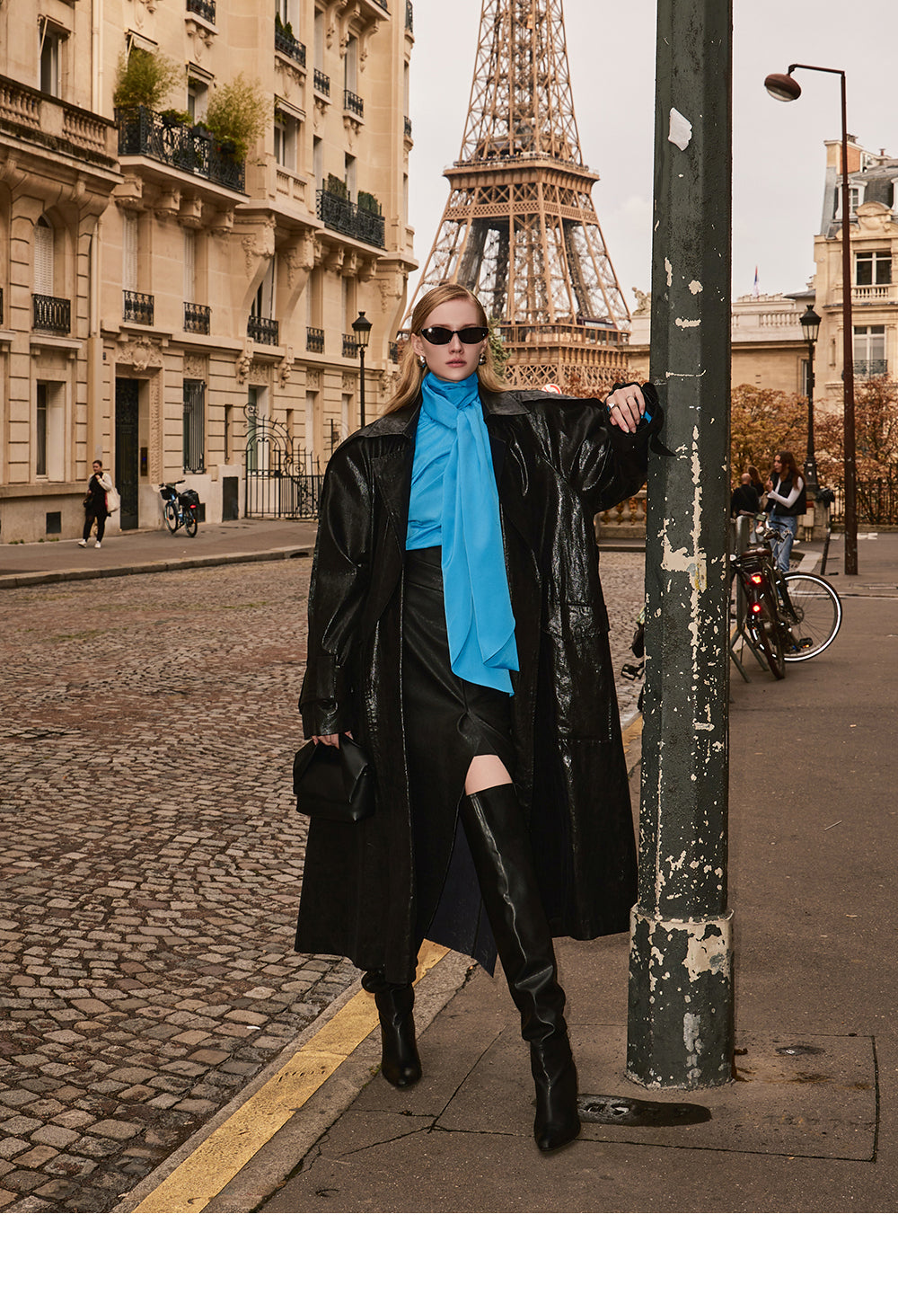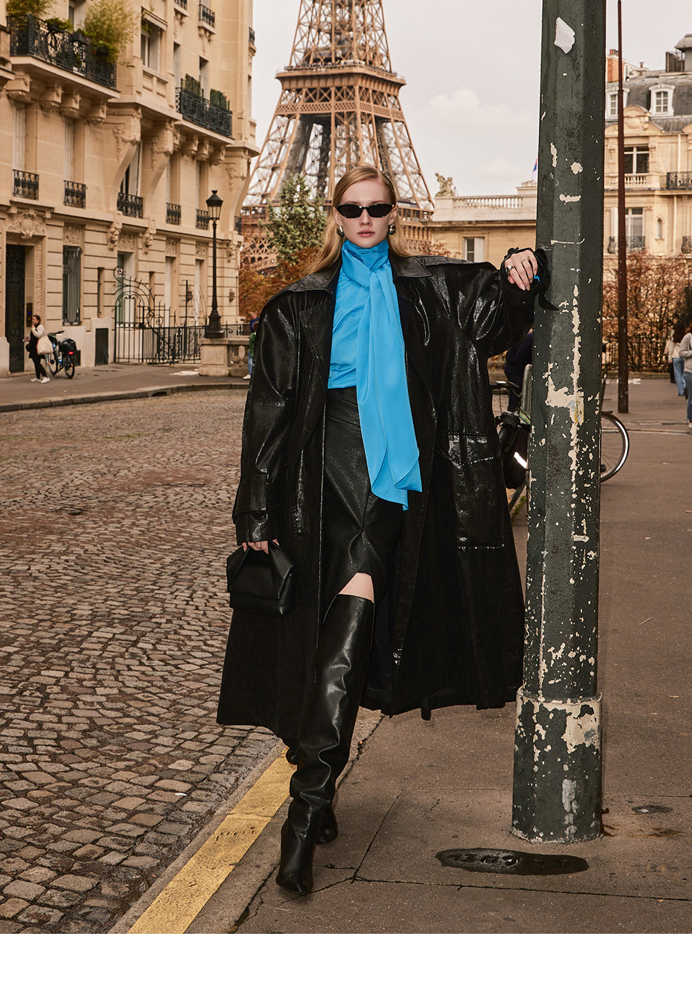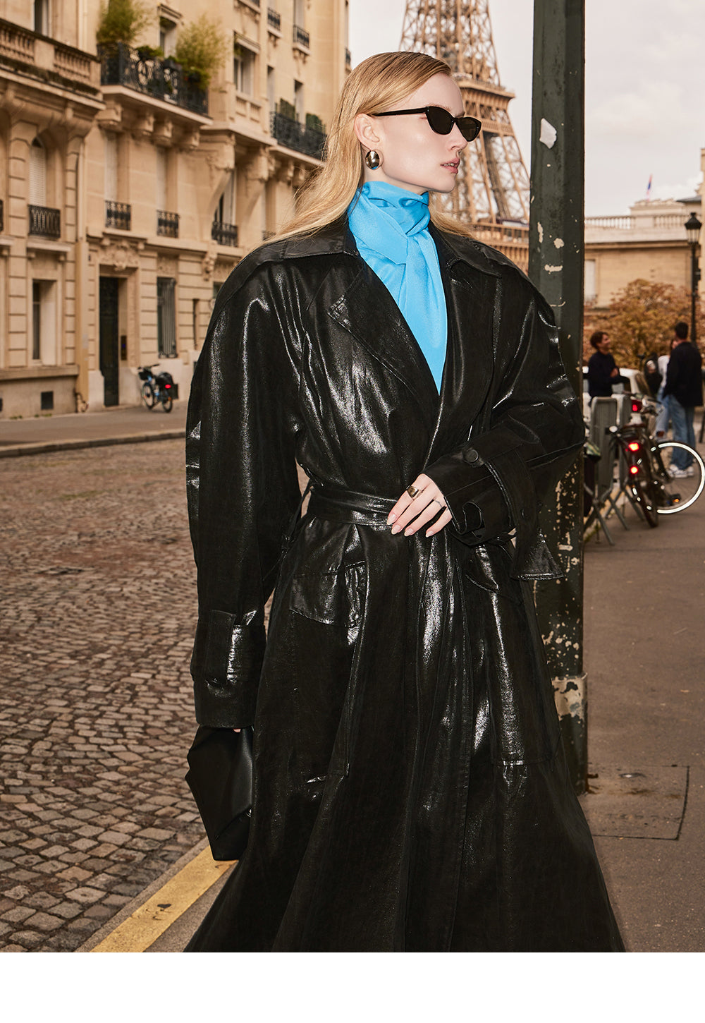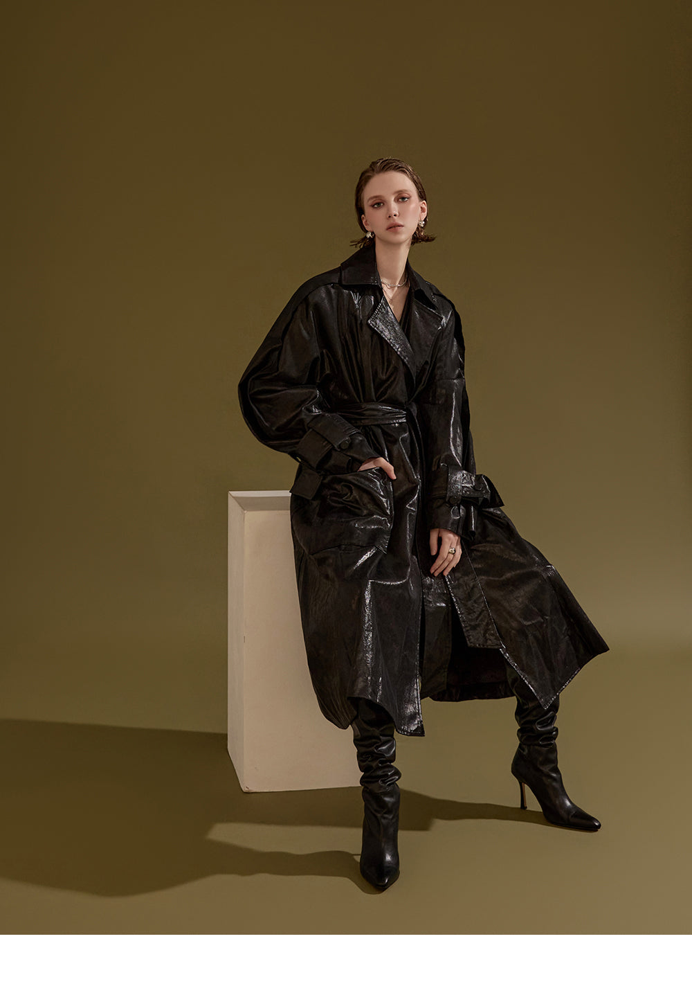 This leather trench coat exudes a unique style.