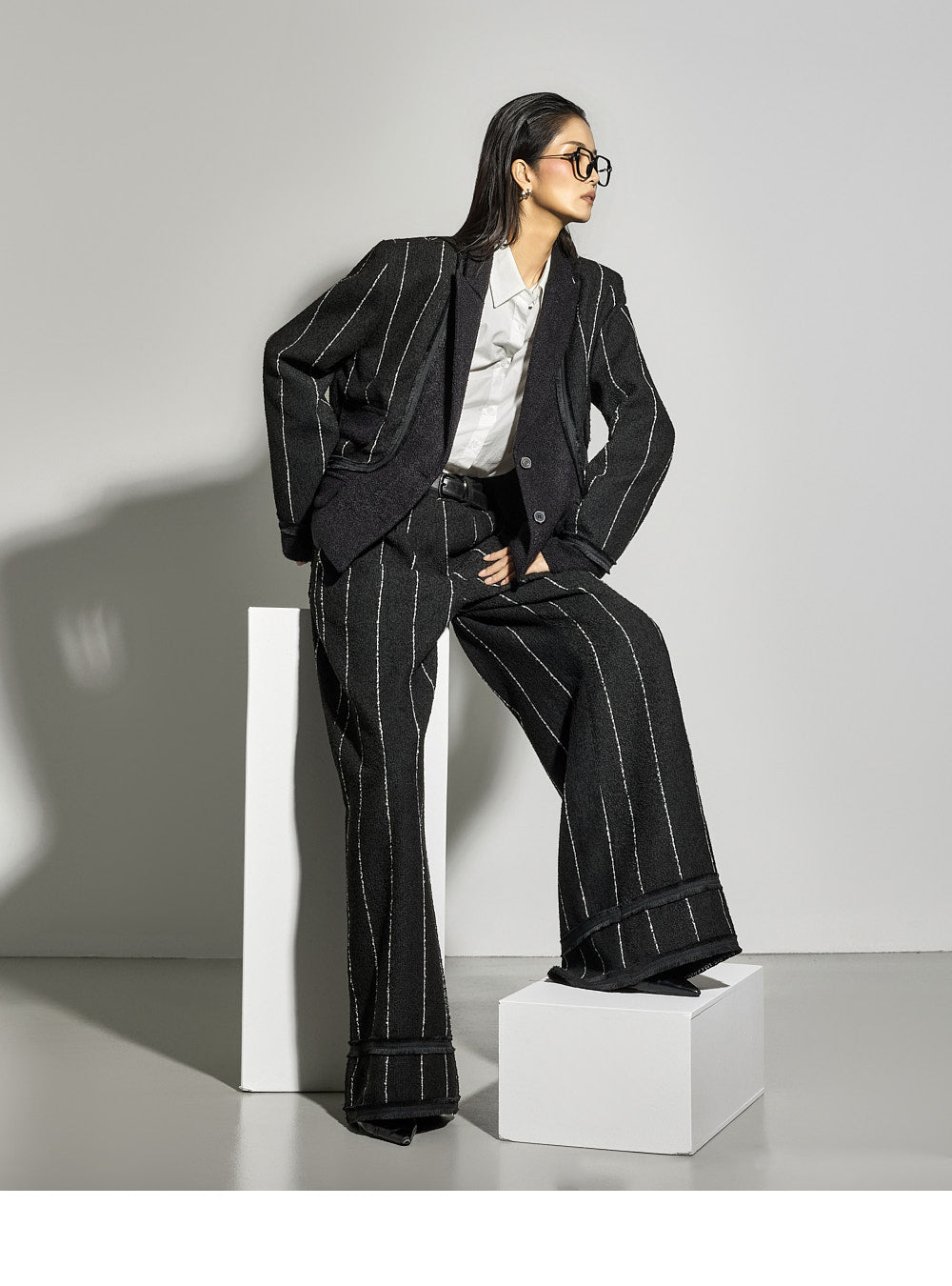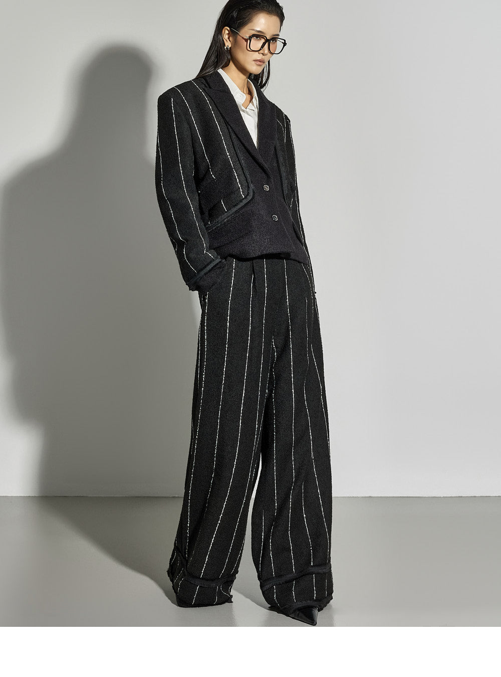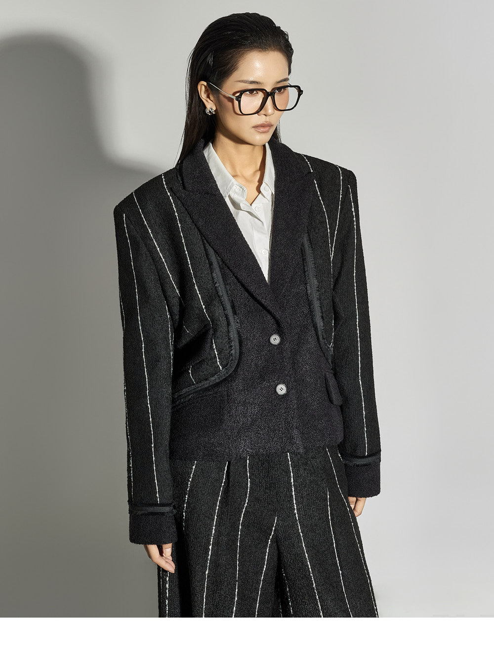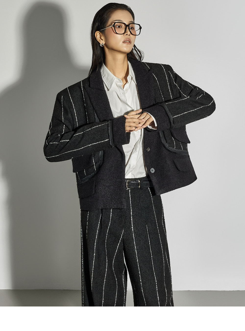This chic cropped striped jacket is crafted from a polyester and wool blend,