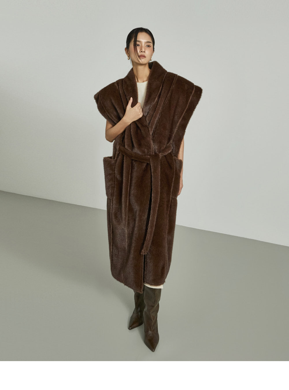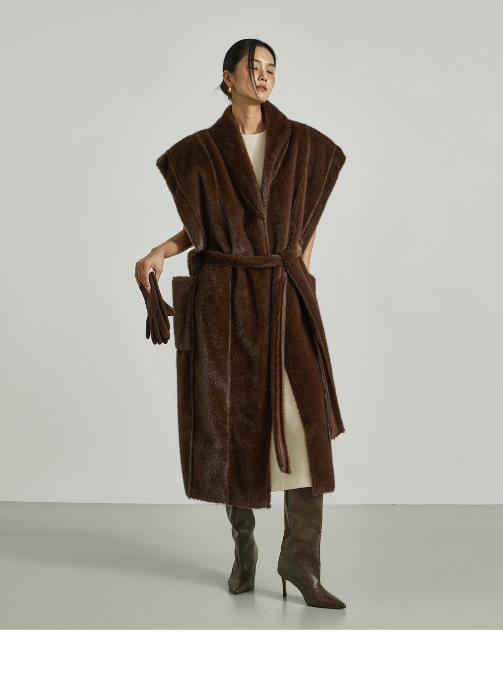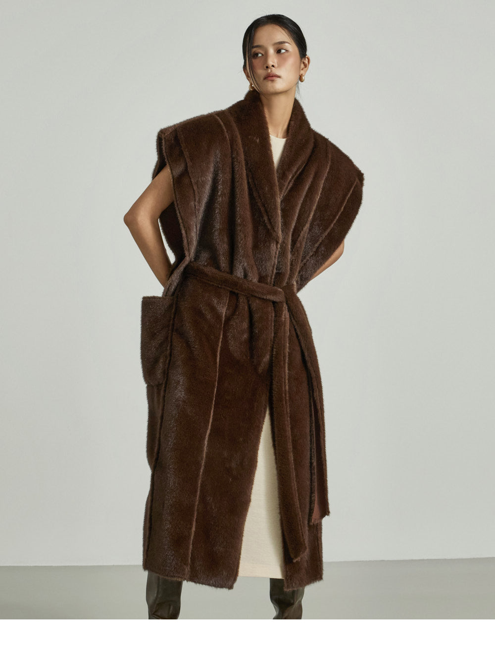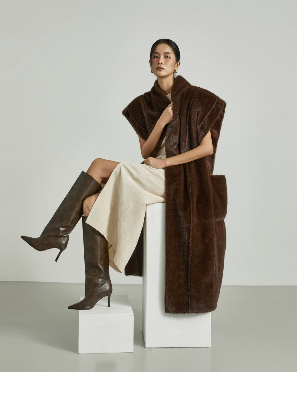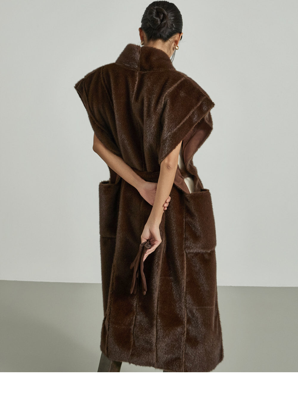 The 173cm model is wearing size ONE in DARK BROWN.