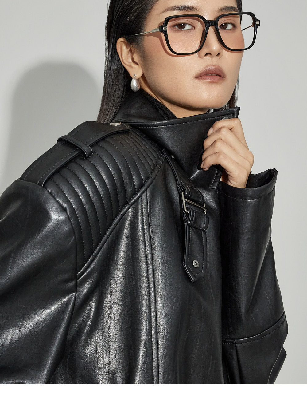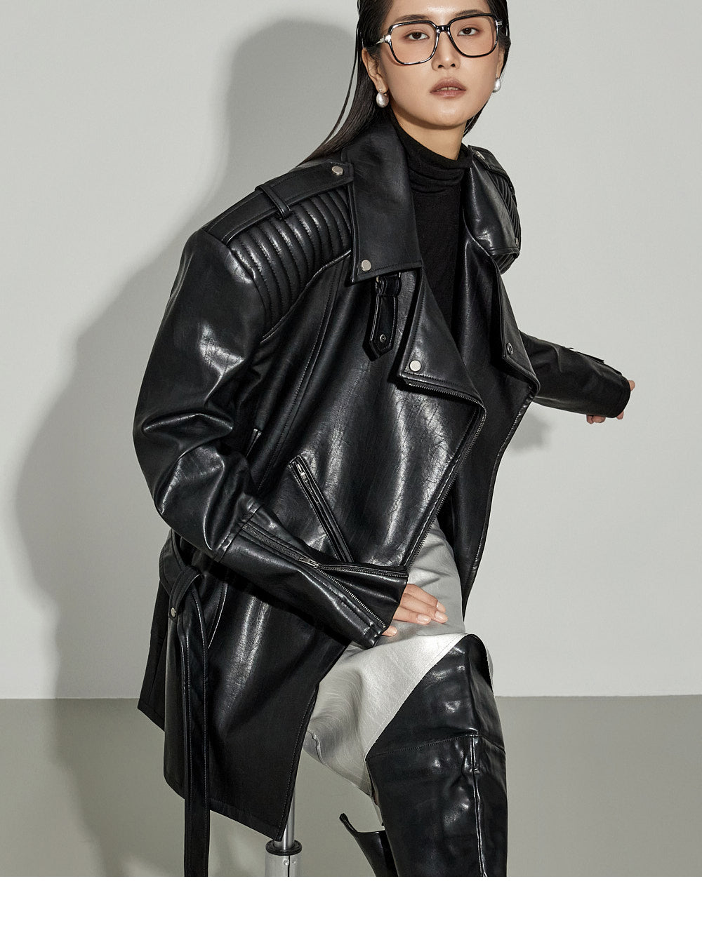 "High Neck Shoulder Pintuck Leather Rider Jacket."