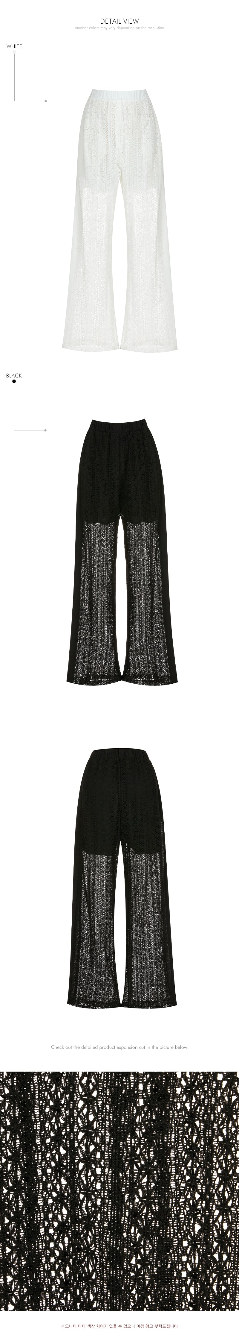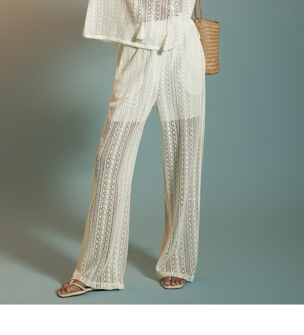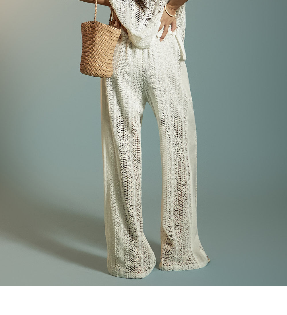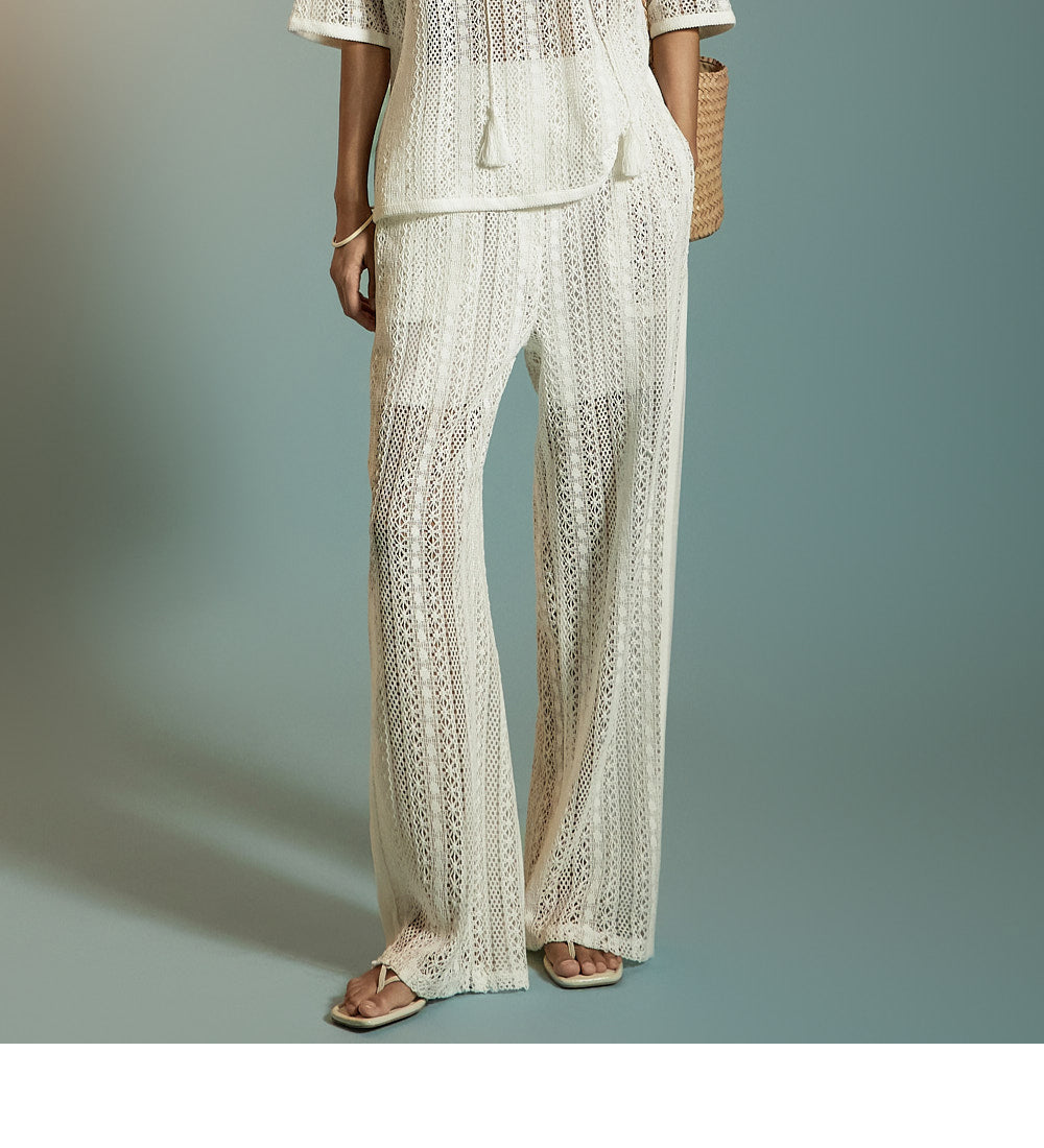 This is a pair of lace see-through pants with a relaxed, casual vibe.