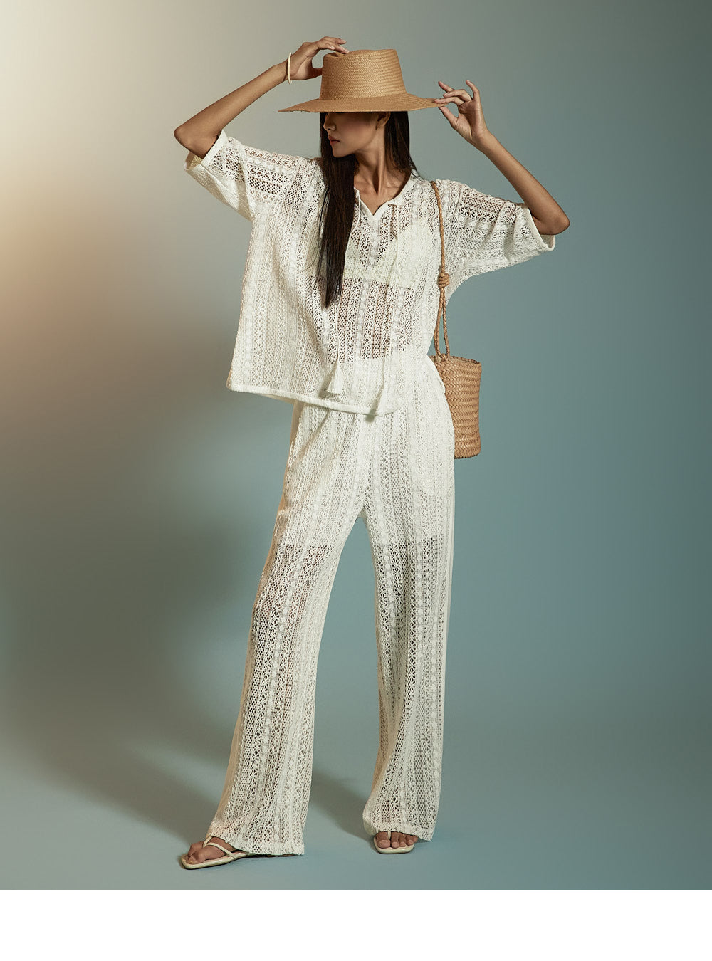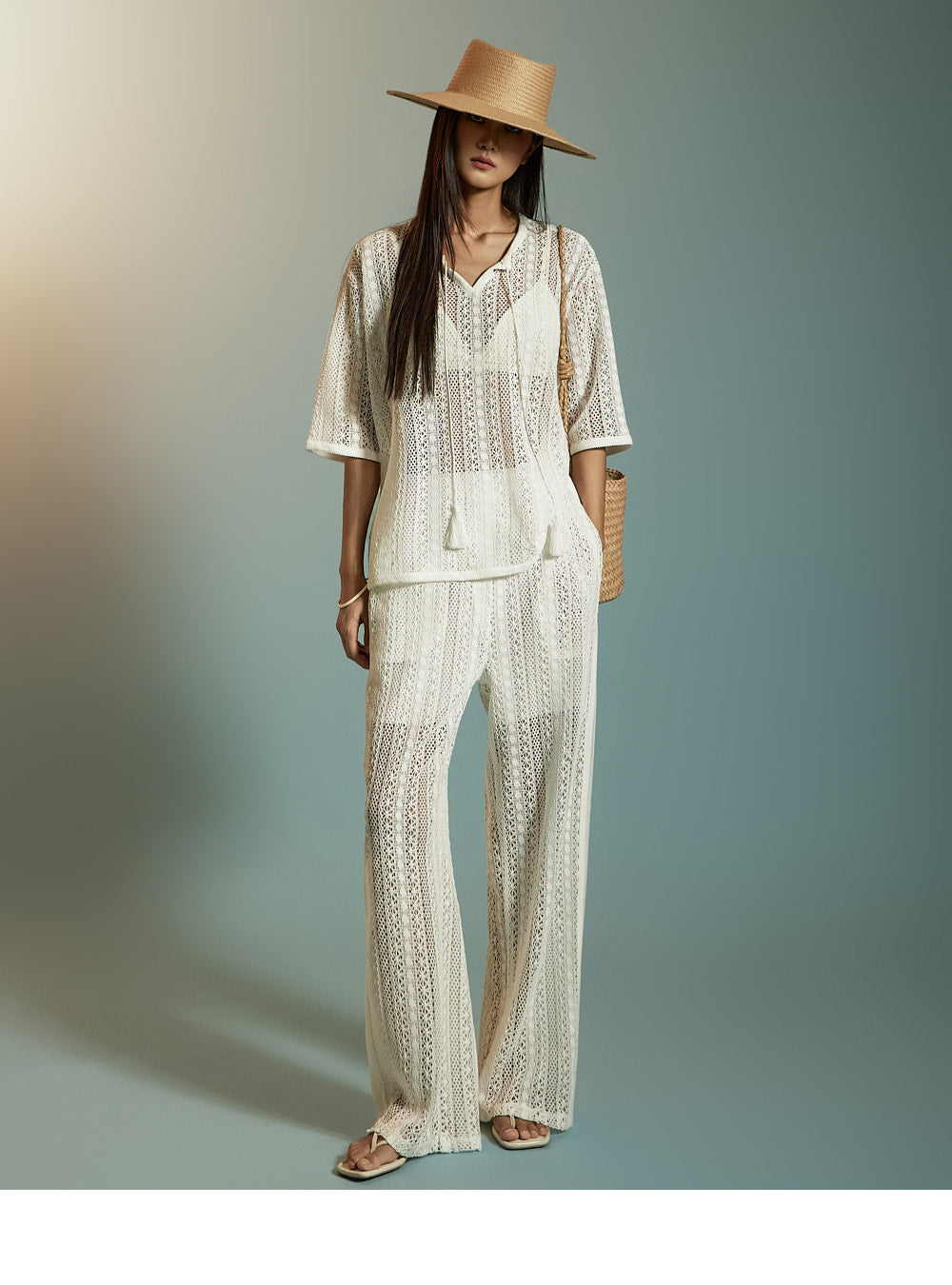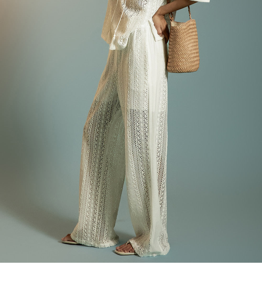 This is a pair of lace see-through pants with a relaxed, casual vibe.